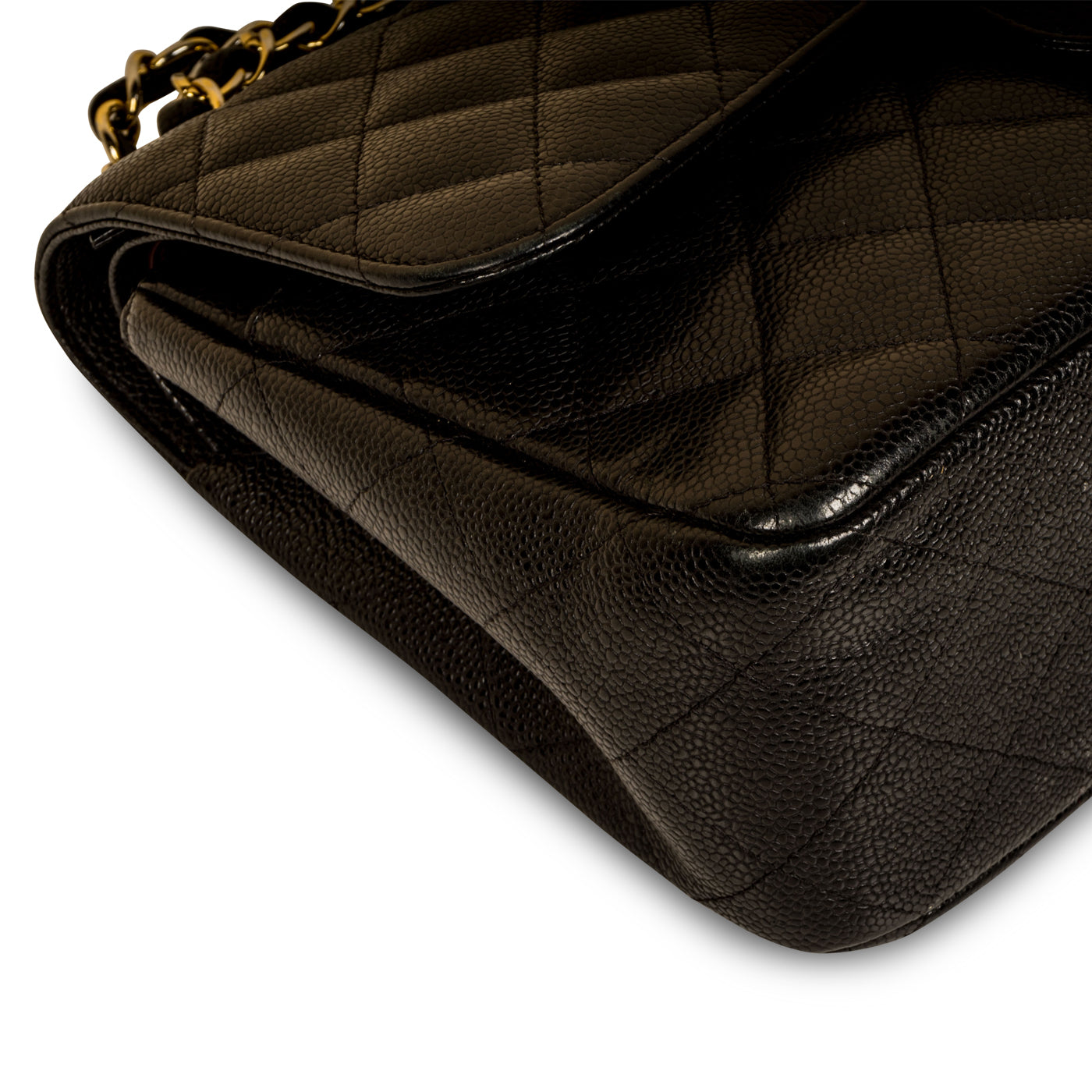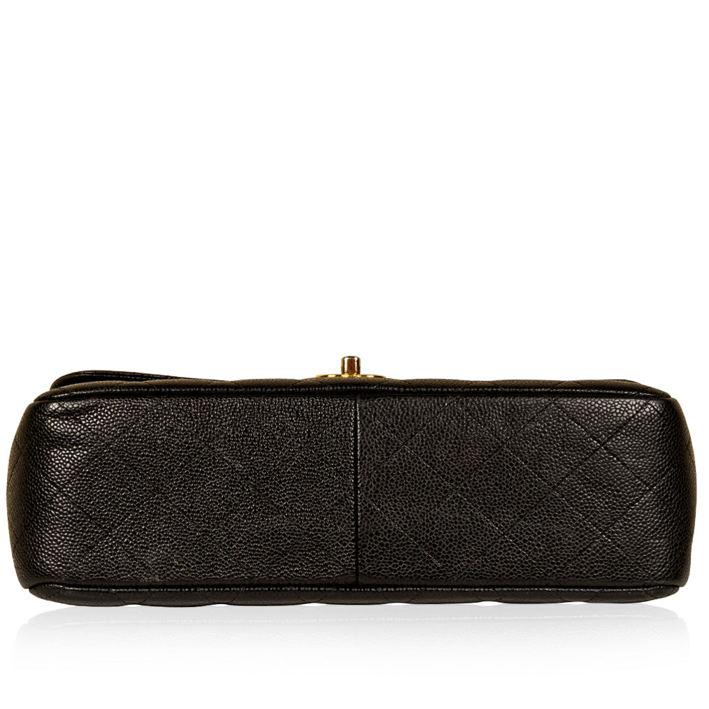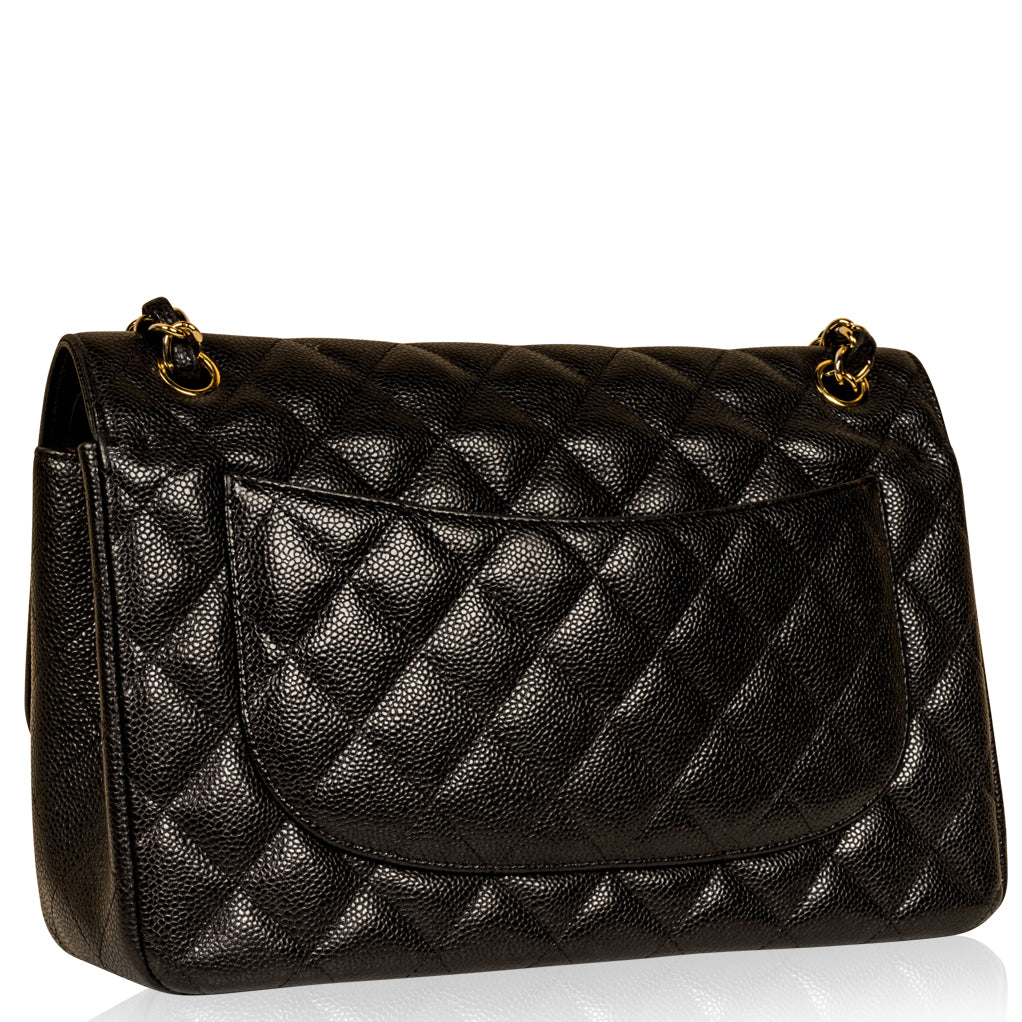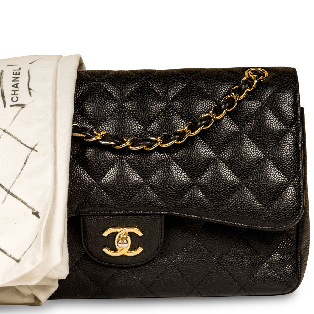 Chanel continues to present its signature line of Classic Flap bags. Under the creative direction of Karl Lagerfeld, the Classic Flap is perhaps the most acclaimed bag in all of fashion history. Timeless, elegant and sophisticated, it's no wonder the Classic Flap is, well, a classic. Featuring its infamous quilted caviar leather and interwoven chain / leather strap, the Jumbo is an absolute must-have in any luxury handbag collection. Not only is this highly coveted, stunning black bag the perfect compliment to pretty much anything you have in your wardrobe, but it's also an investment piece that will never lose its value. Embodying elegance and traditional femininity to a T, a Chanel bag is a purchase you won't ever regret.