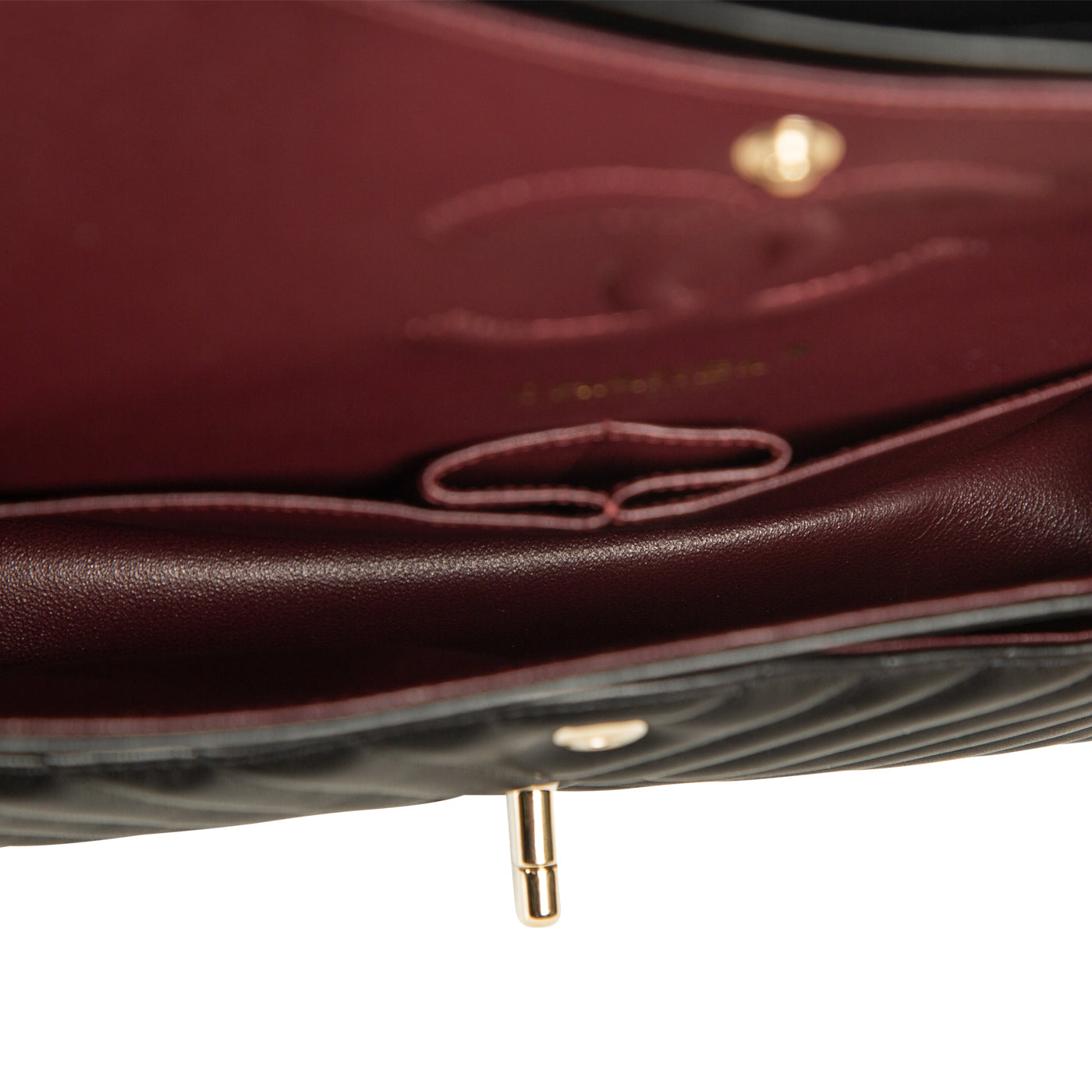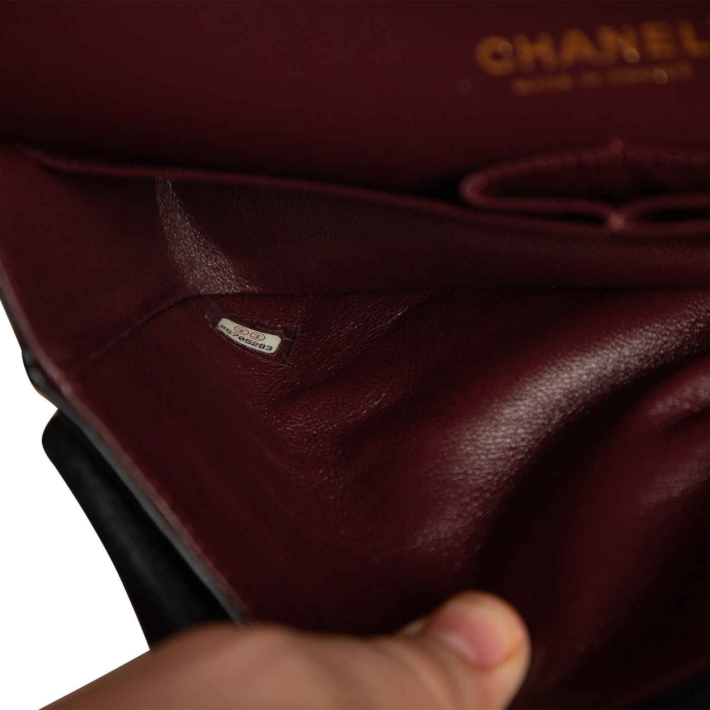 - ‘Chanel’ and ‘Made in France’ stamps embossed in leather