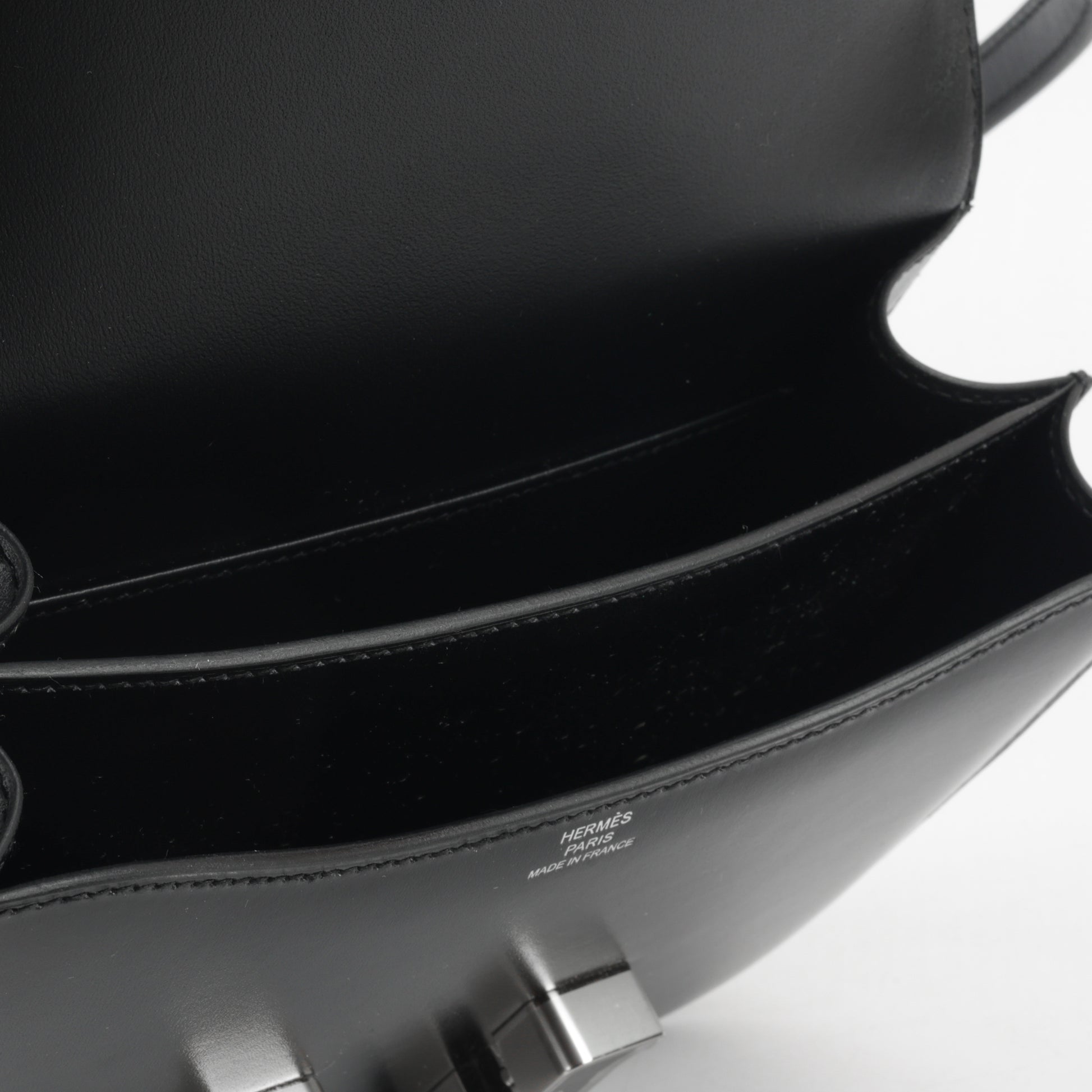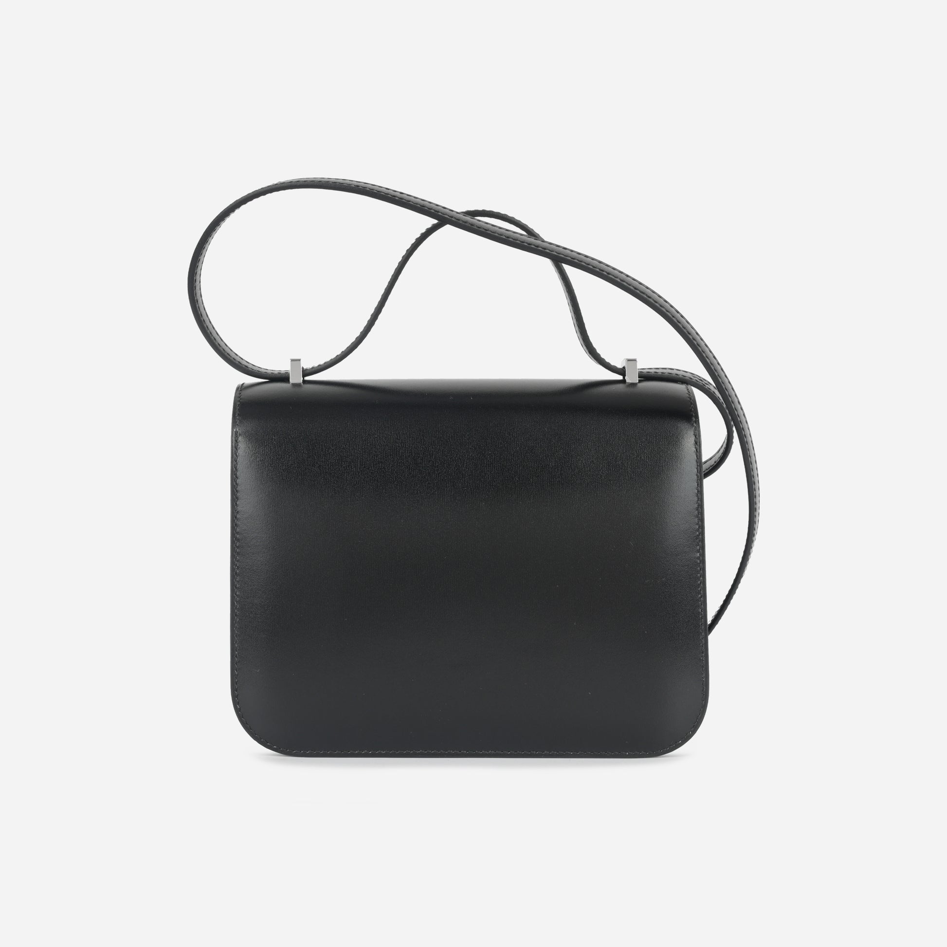 Introducing the limited edition Constance 18, a timeless piece of luxury crafted from Noir Box Calf leather and adorned with gleaming palladium and aventurine hardware, adding a touch of sophistication and uniqueness. It comes with an elegant Hermès blue box and a protective dust bag, ensuring it remains a cherished addition to your collection.
