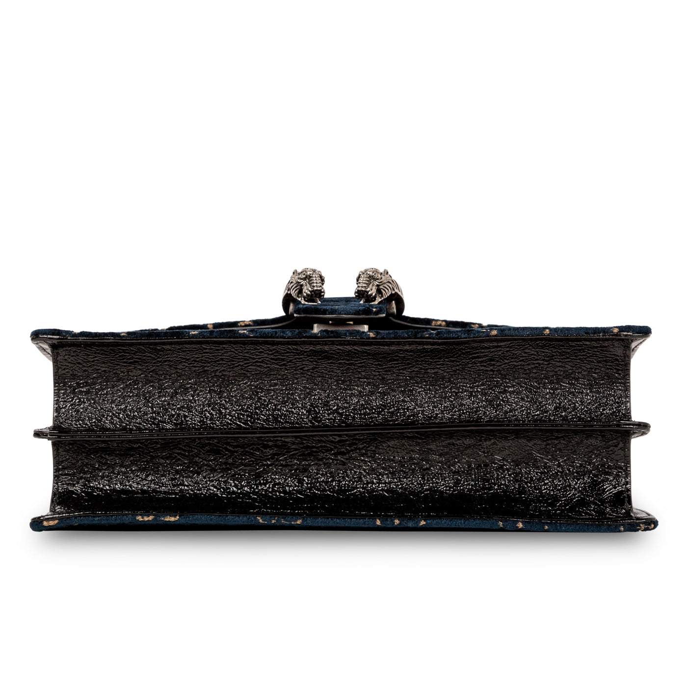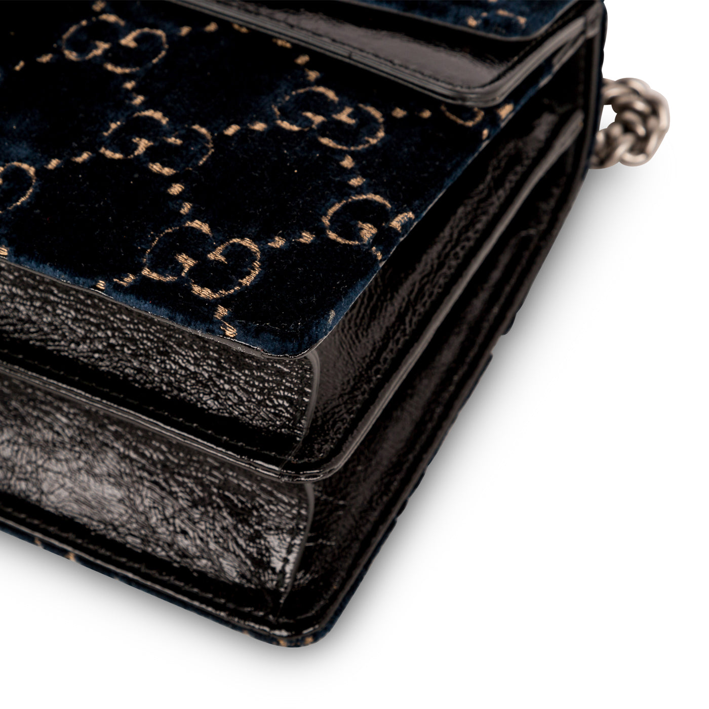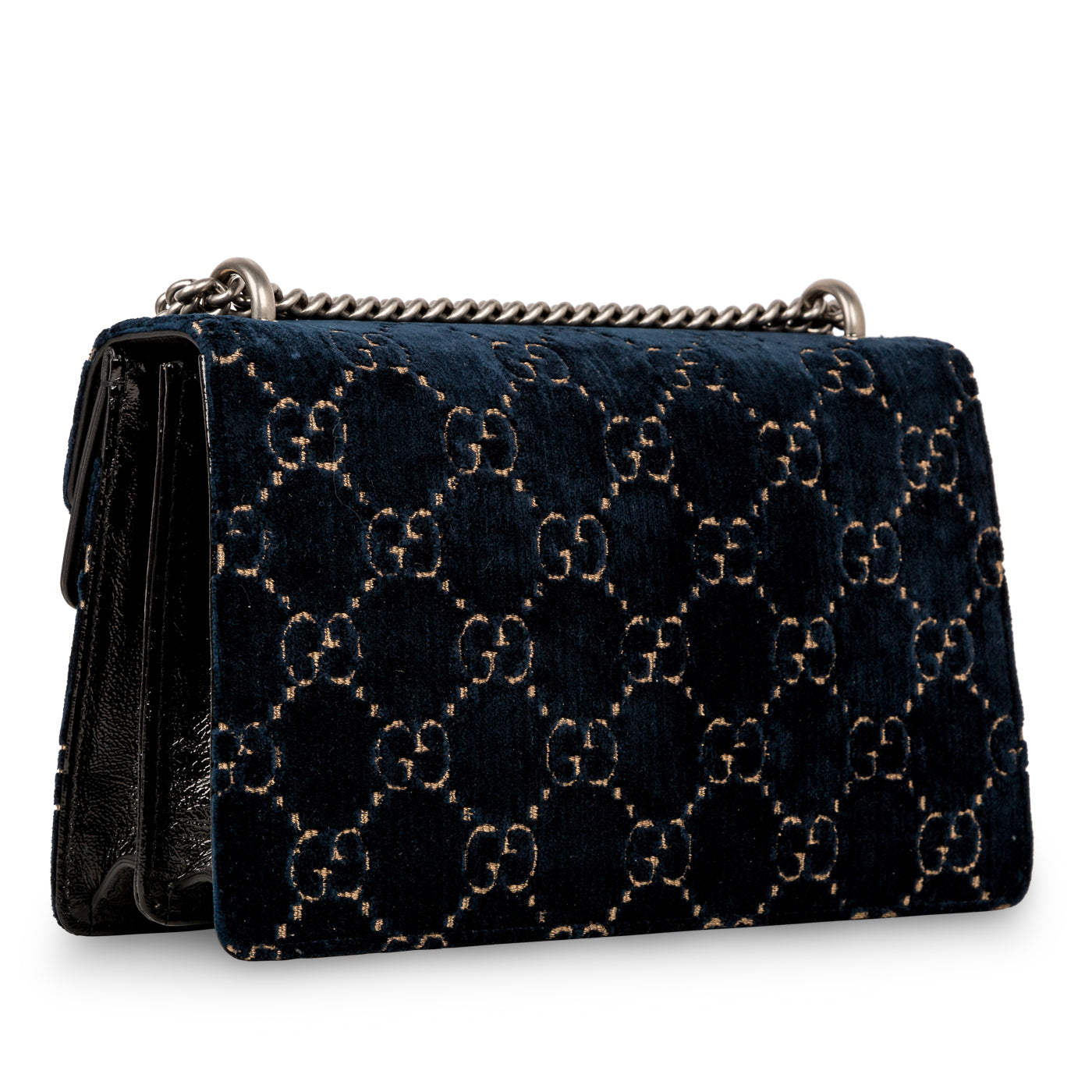 The very popular Gucci signature GG motif has been reworked in teal green and pink velvet. Made in Italy the Dionysus shoulder bag is suspended from a sliding chain that can be worn multiple ways. The tiger head is enriched with crystals remains an eye catching feature on this defining silhouette. The Dionysus is the perfect statement handbag to be added to any collection.