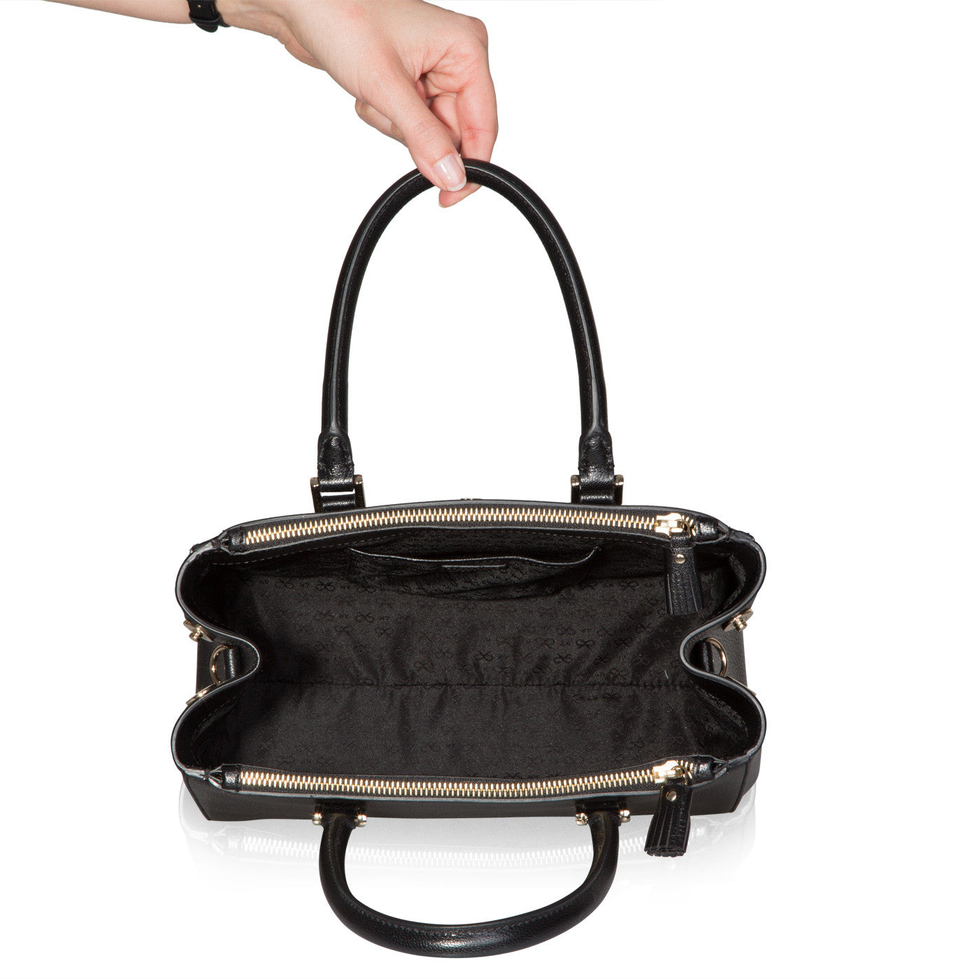 - Two zipped sections with tassel zip pulls