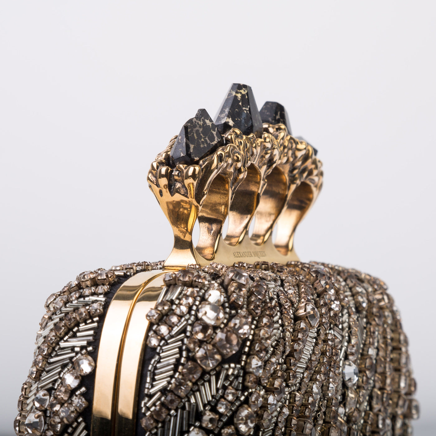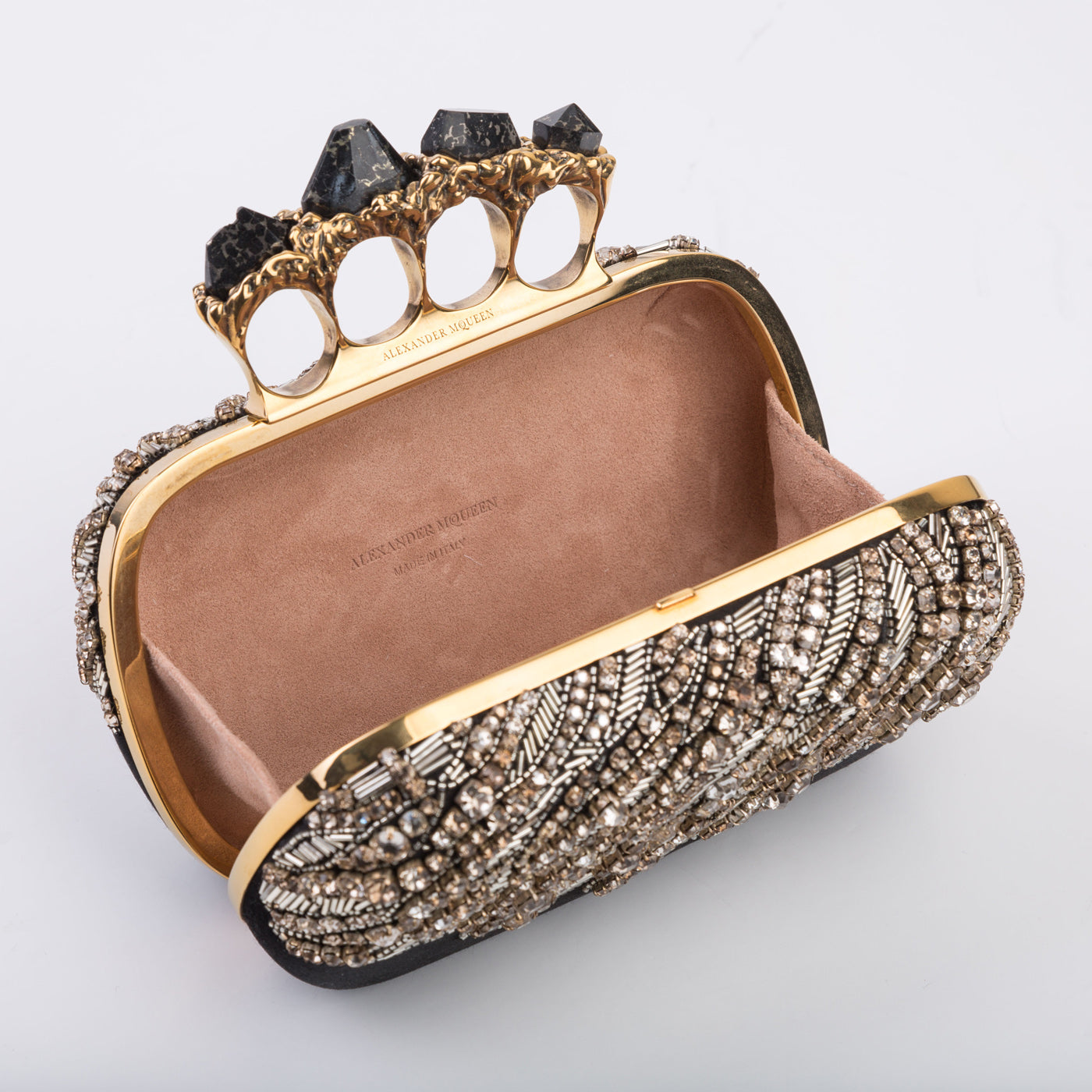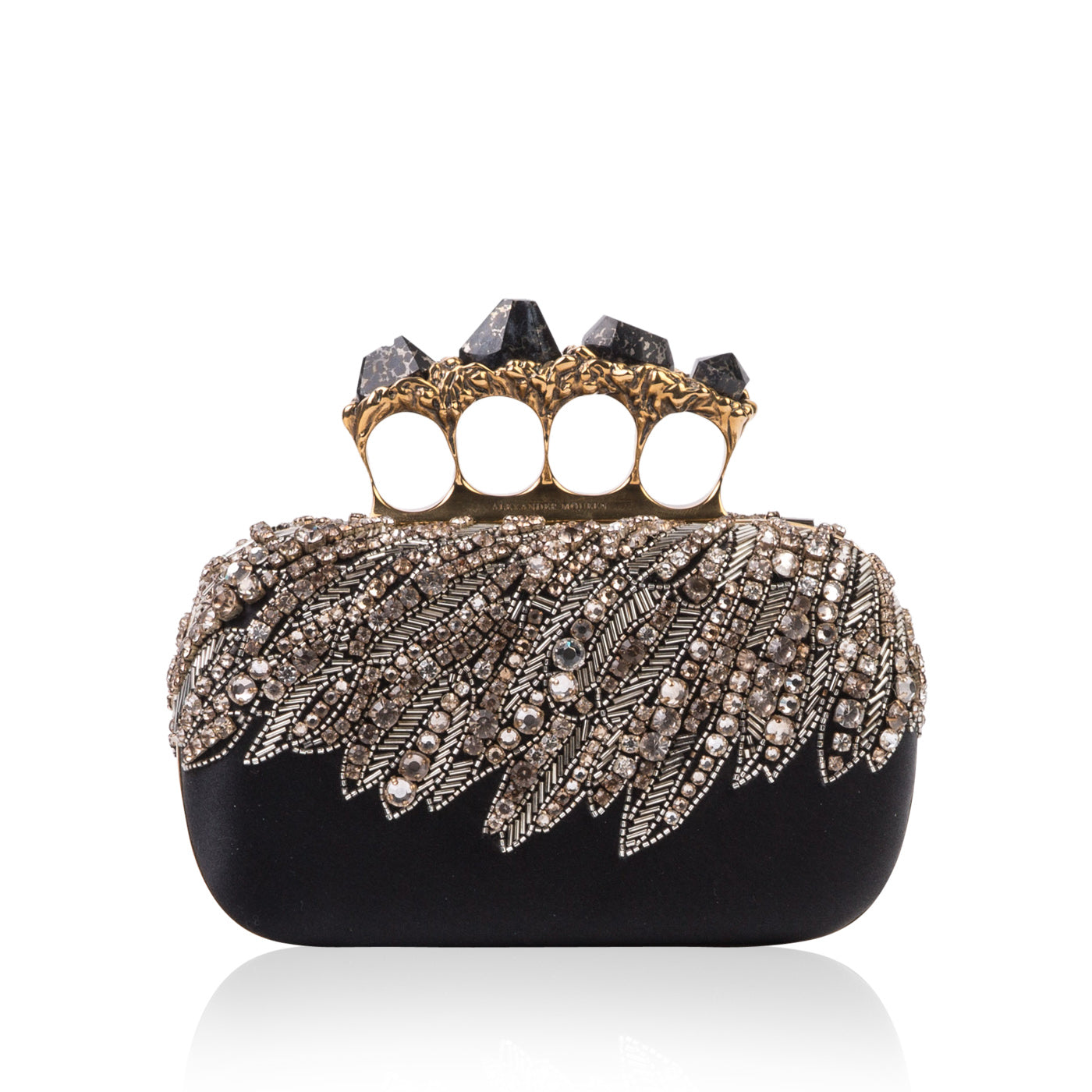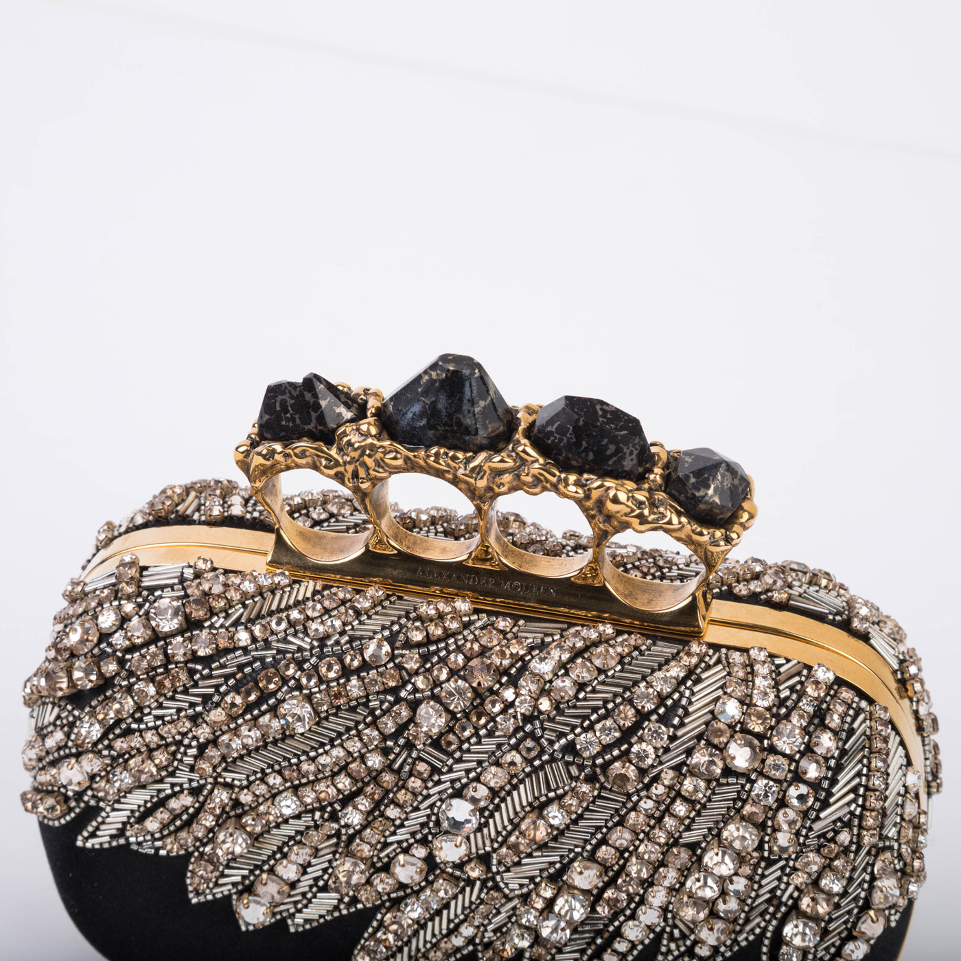 Alexander McQueen presents their classic Knuckle Box clutch with an exquisite and unique twist. With a black satin body, featuring crystal and sequin embellishment, this clutch is the perfect essential for a glamorous night out. Carry your small, evening necessities inside the single compartment while making an elegant statement. Chic, sophisticated, and definitely an eye catcher - this bag will make you stand out from any crowd.