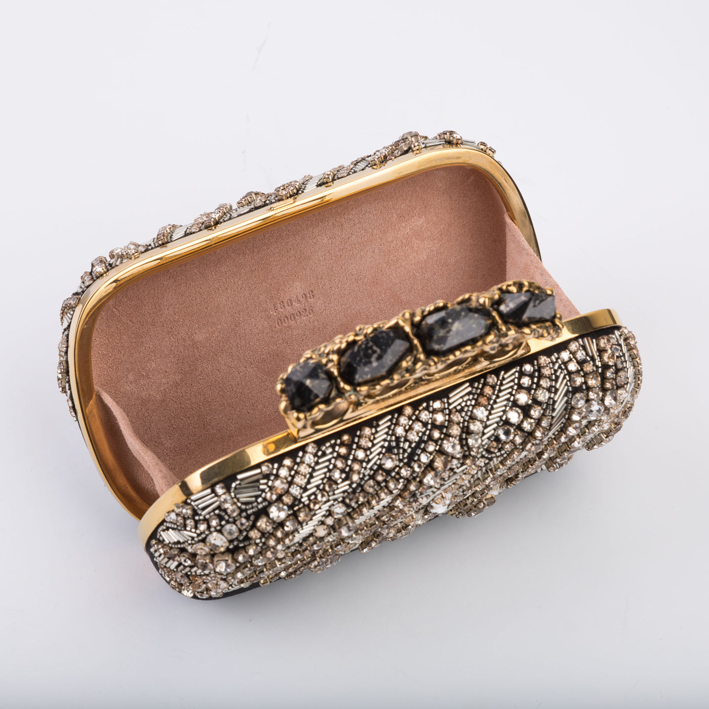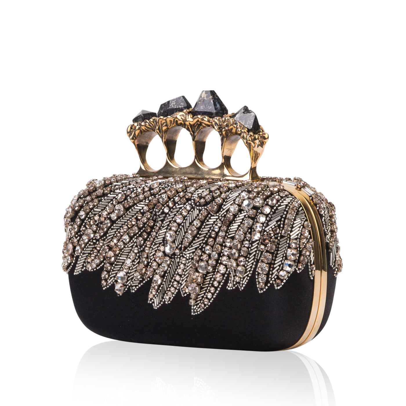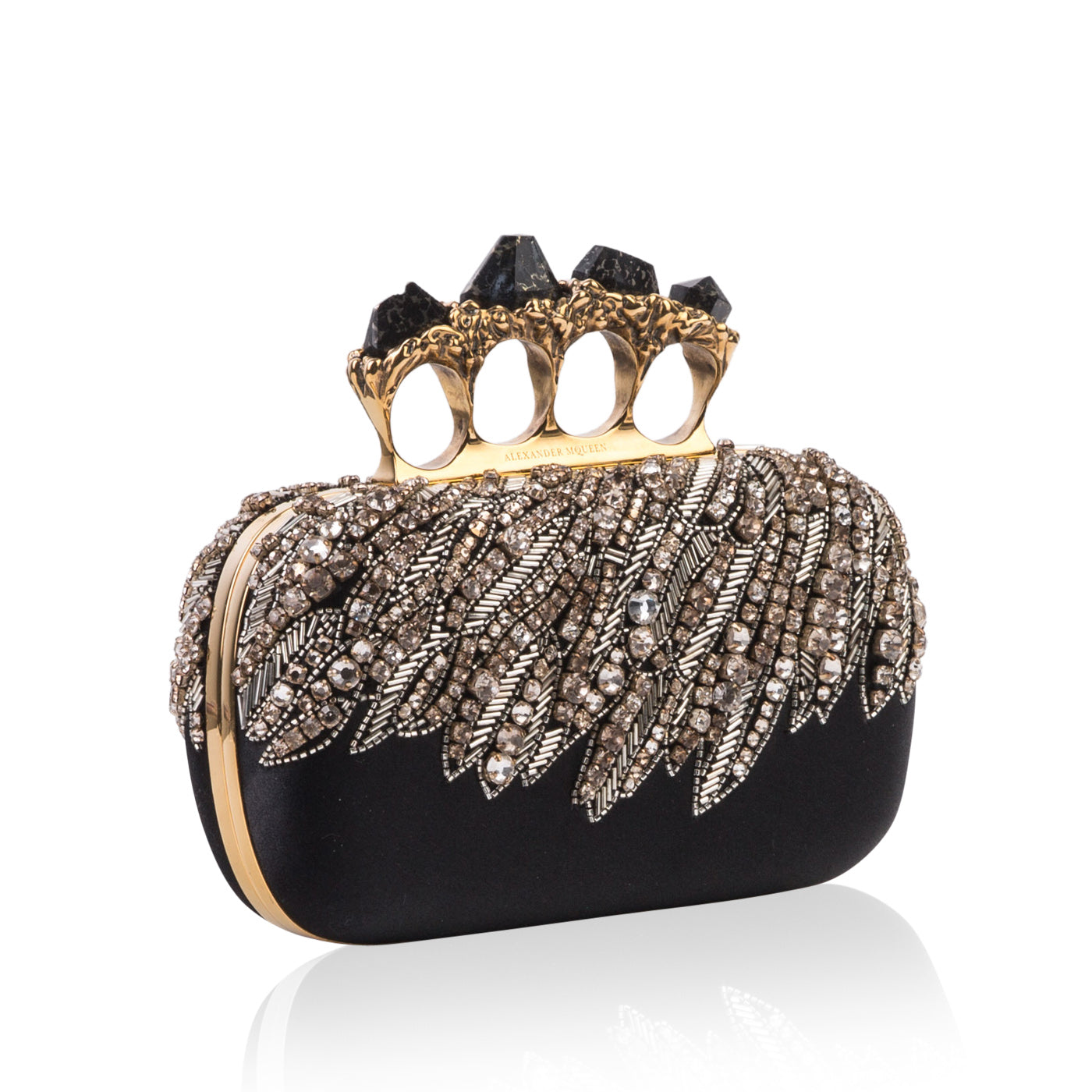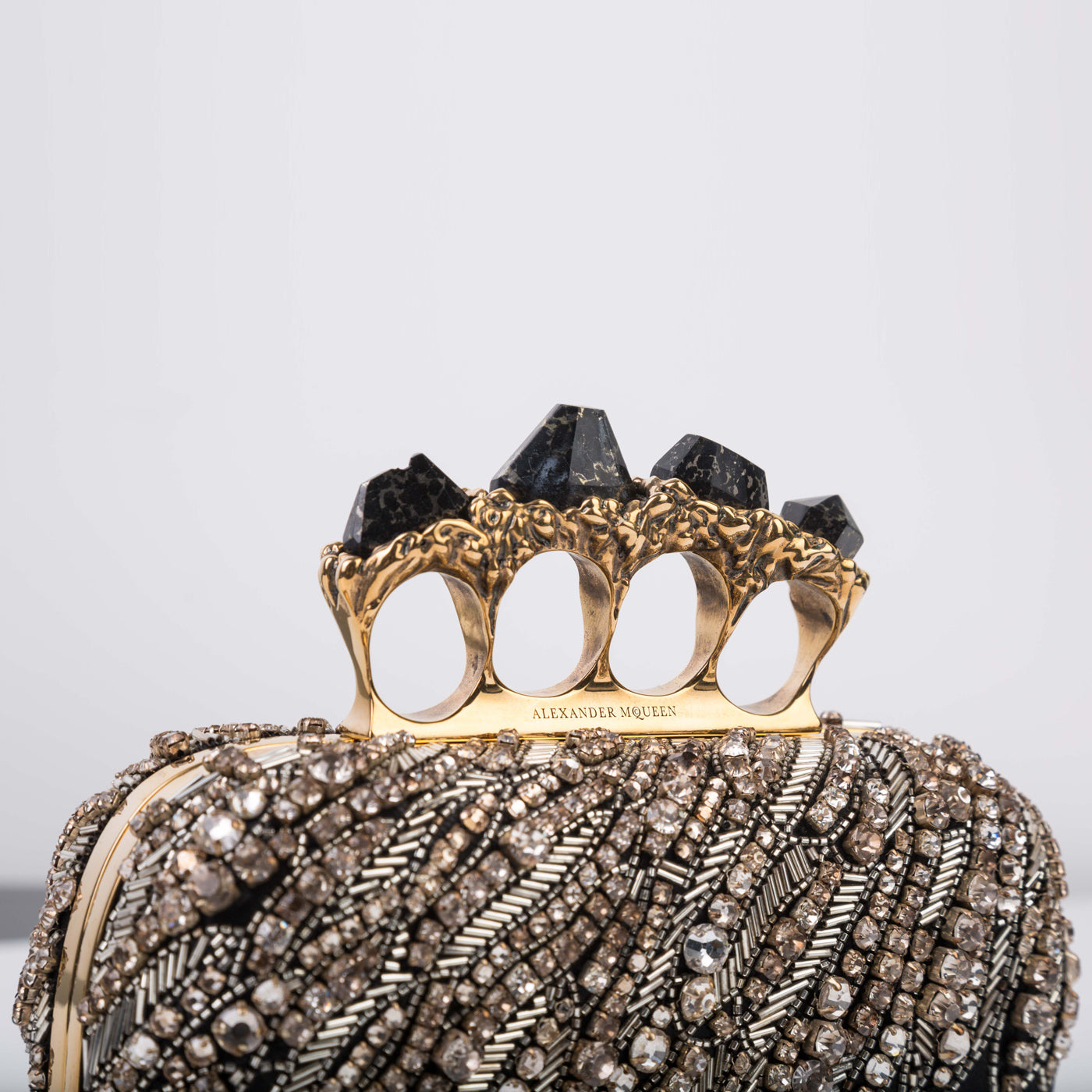 Alexander McQueen presents their classic Knuckle Box clutch with an exquisite and unique twist. With a black satin body, featuring crystal and sequin embellishment, this clutch is the perfect essential for a glamorous night out. Carry your small, evening necessities inside the single compartment while making an elegant statement. Chic, sophisticated, and definitely an eye catcher - this bag will make you stand out from any crowd.