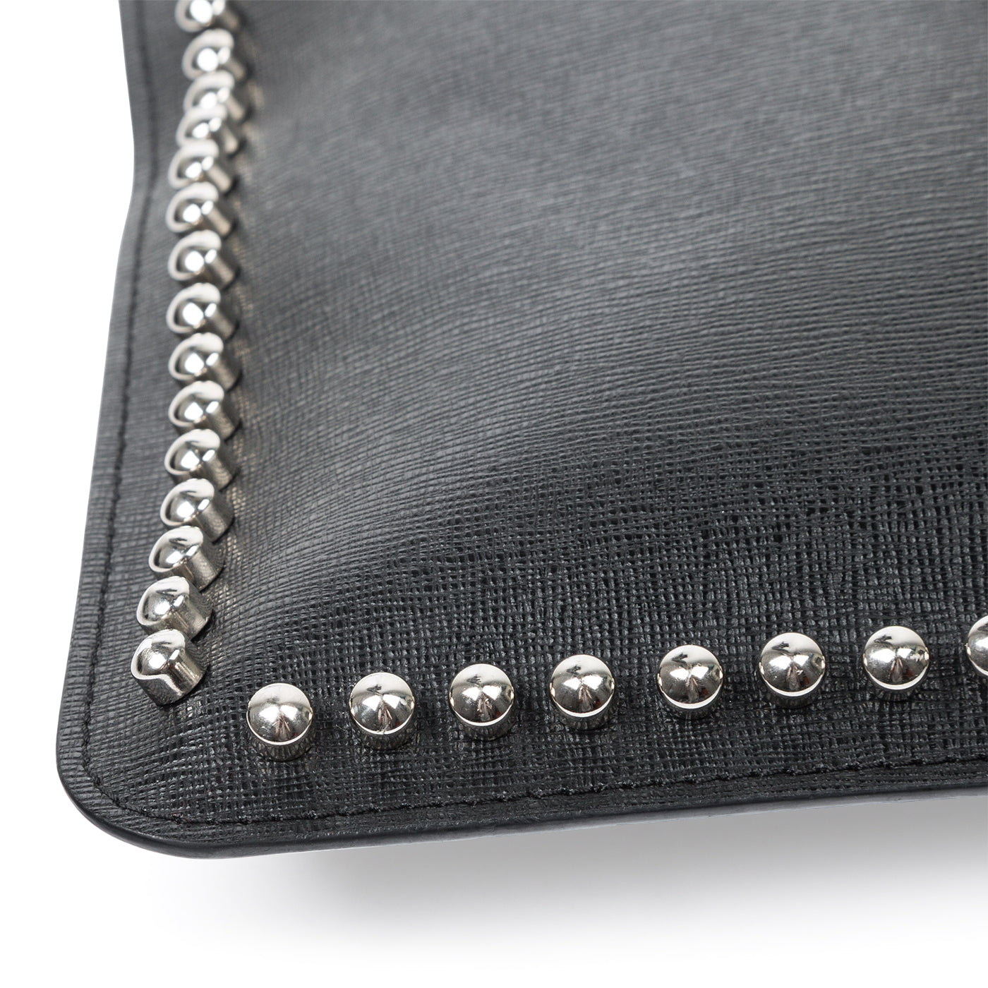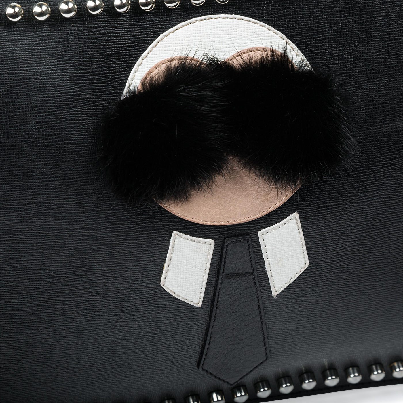 Fendi presents their Karlito clutch, a humorous piece from the luxury Italian fashion house. Carefully crafted from black calfskin leather featuring silver tone studs and a leather / mink fur print of the creative director, Karl Lagerfeld, A playful accessory that can glam up any outfit in your wardrobe, the Karlito clutch is a must-have for any woman with an eccentric style and an appreciation for irony in fashion. Edgy, fun and luxurious, the Karlito is a well-worthy investment piece for any luxury accessories collection.