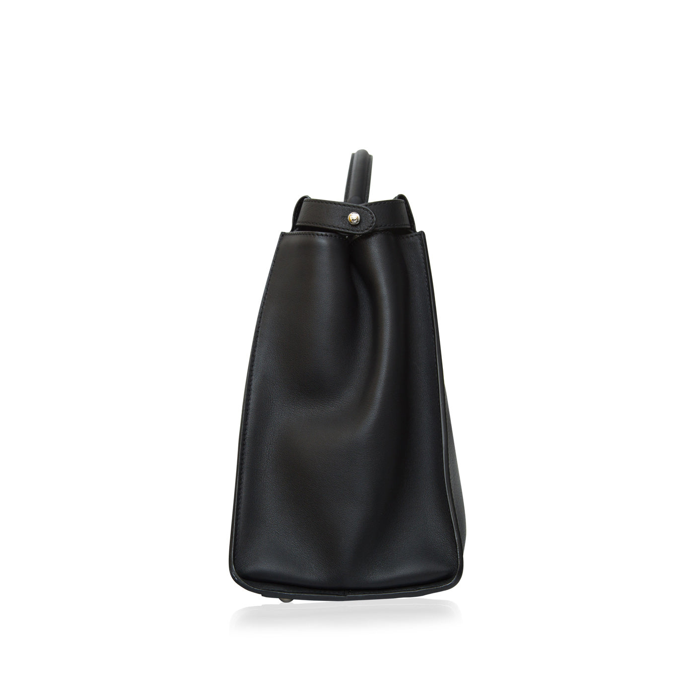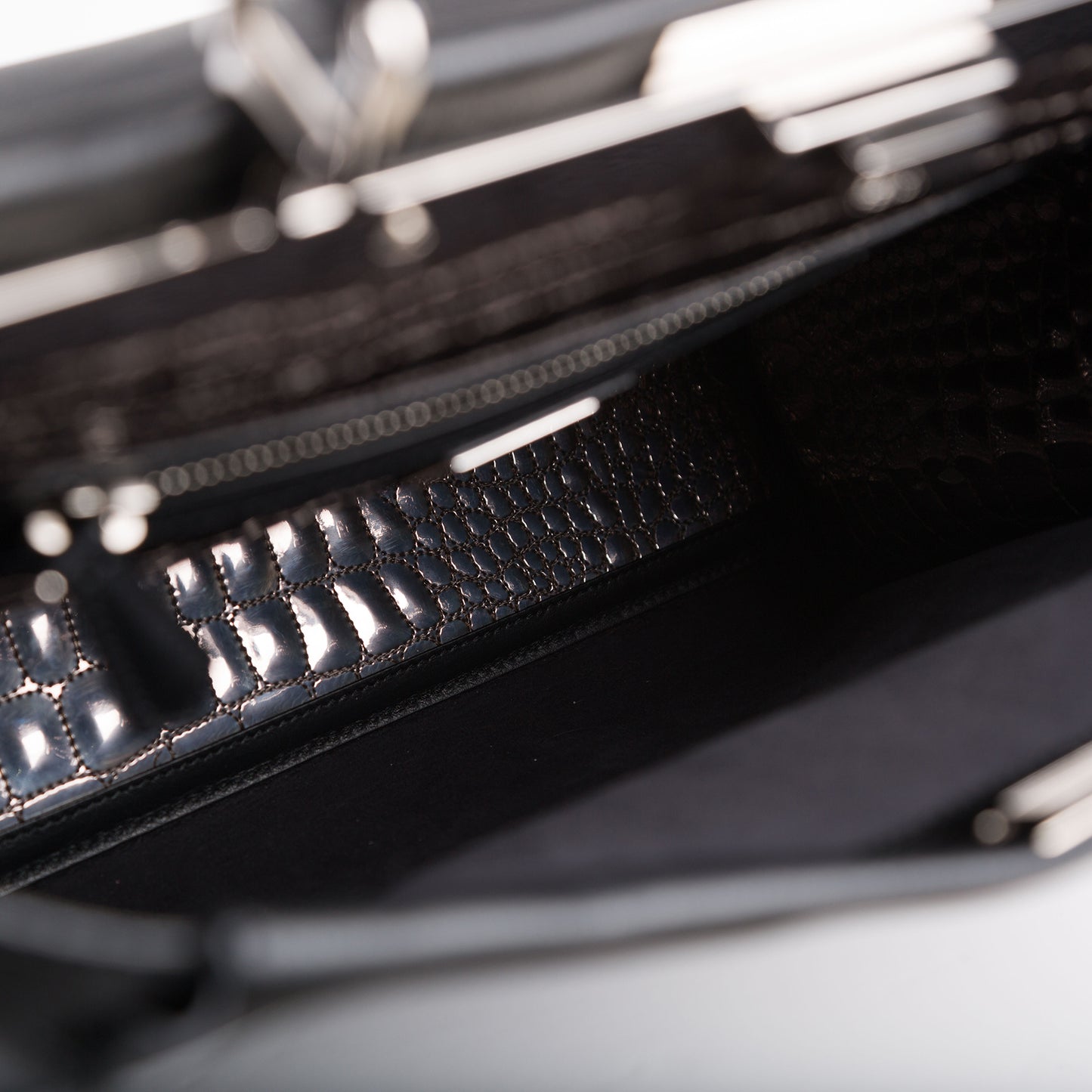 Fendi presents its iconic Peekaboo bag with a patent leather crocodile interior lining. This bag is the perfect option for a modern, sleek woman on the go. With two interior compartments divided by a stiff partition, an interior zip pocket, as well as the signature twist clasp - the Peekaboo is stylish, sophisticated, and elegant. It's spacious enough to carry your every day essentials, offering function as well as being a timeless piece that will never go out of style.