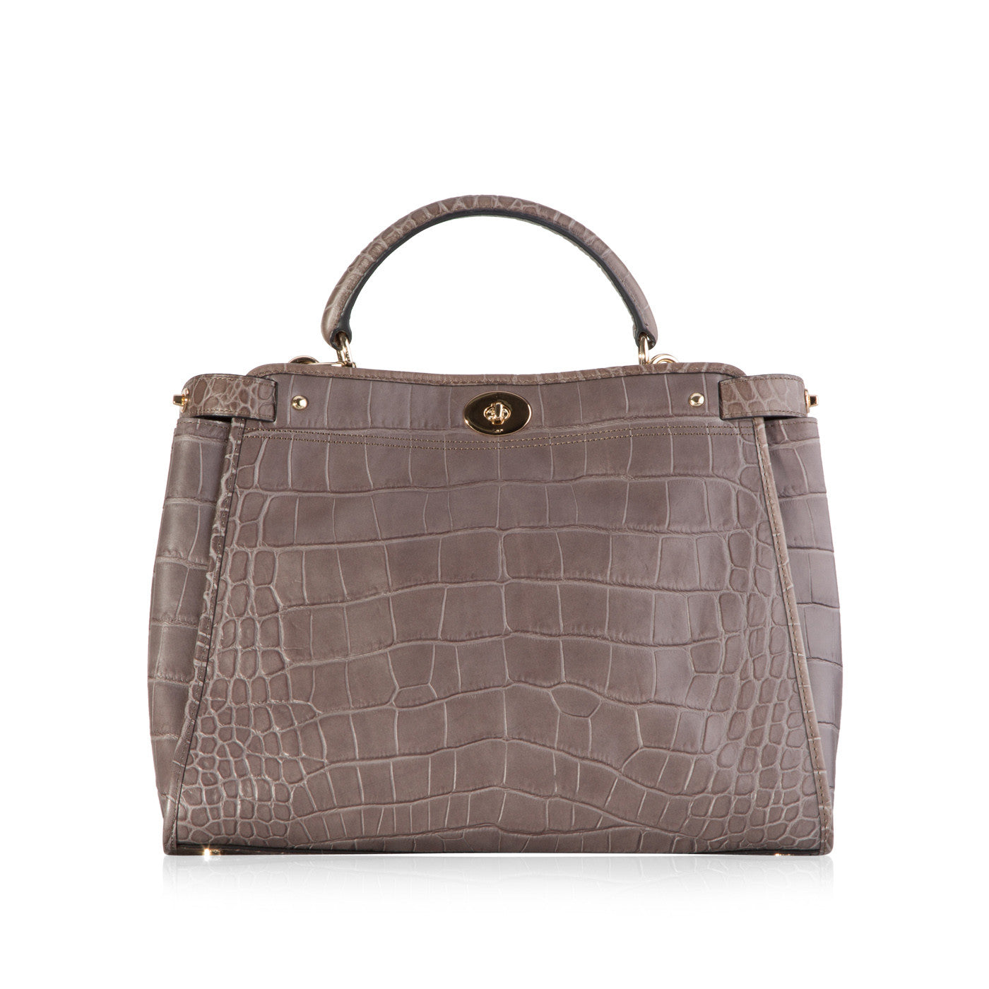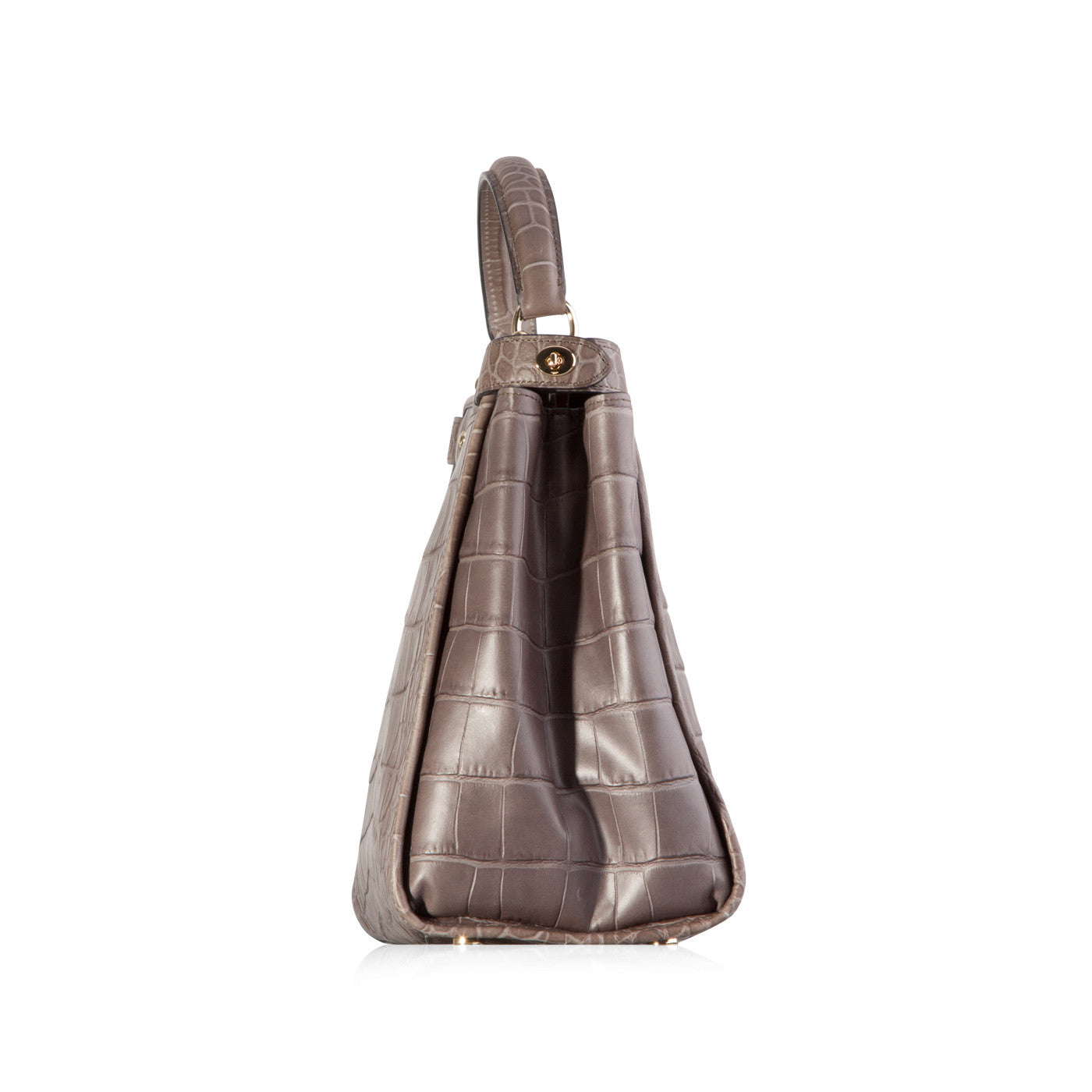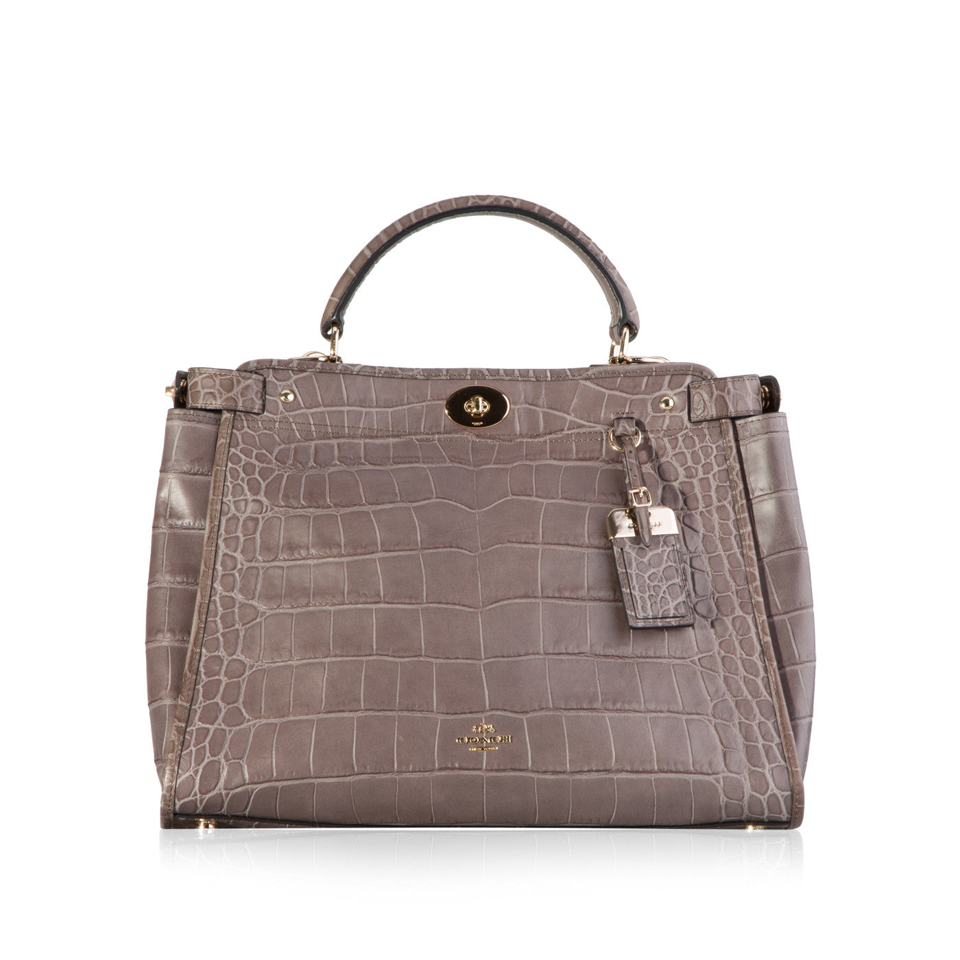 Quietly luxurious in leather with highly textured crocodile embossing, the Gramercy satchel combines a feminine, structured shape with modern polish.