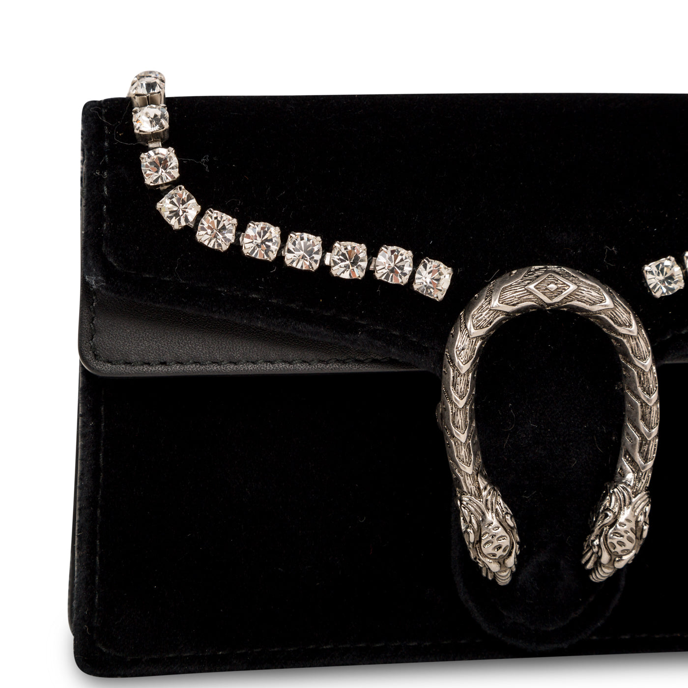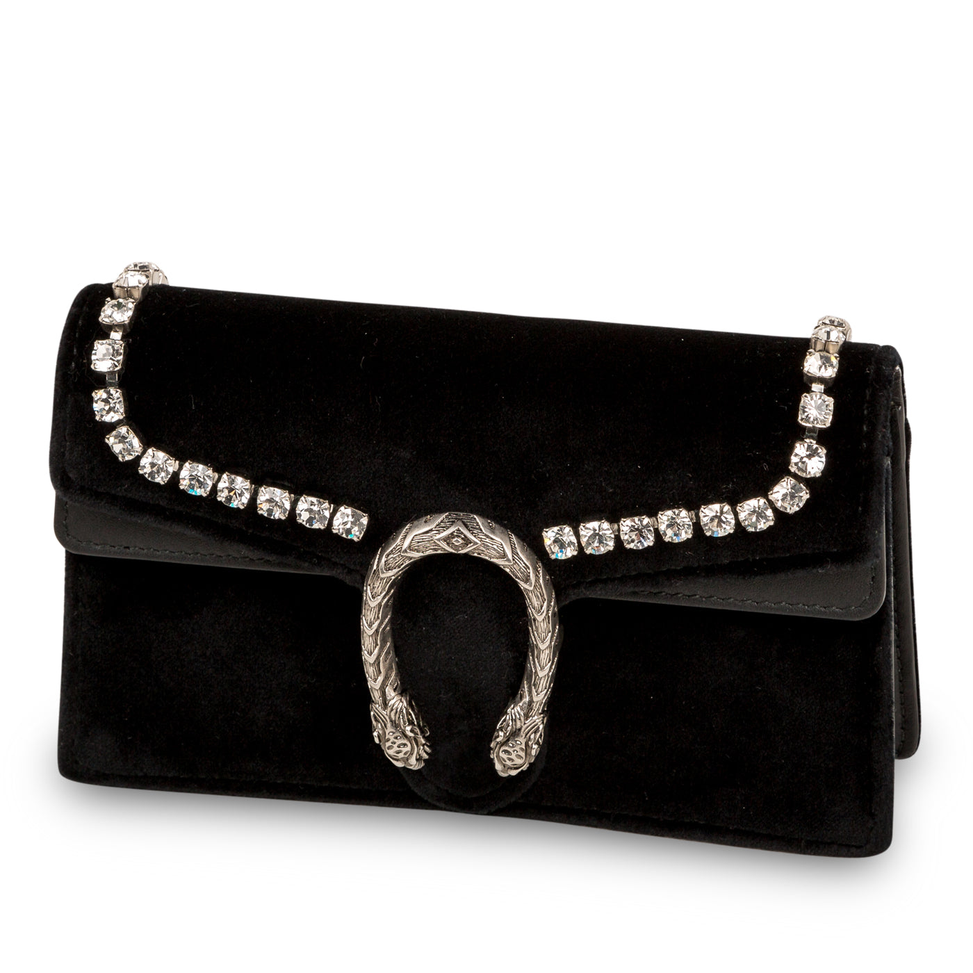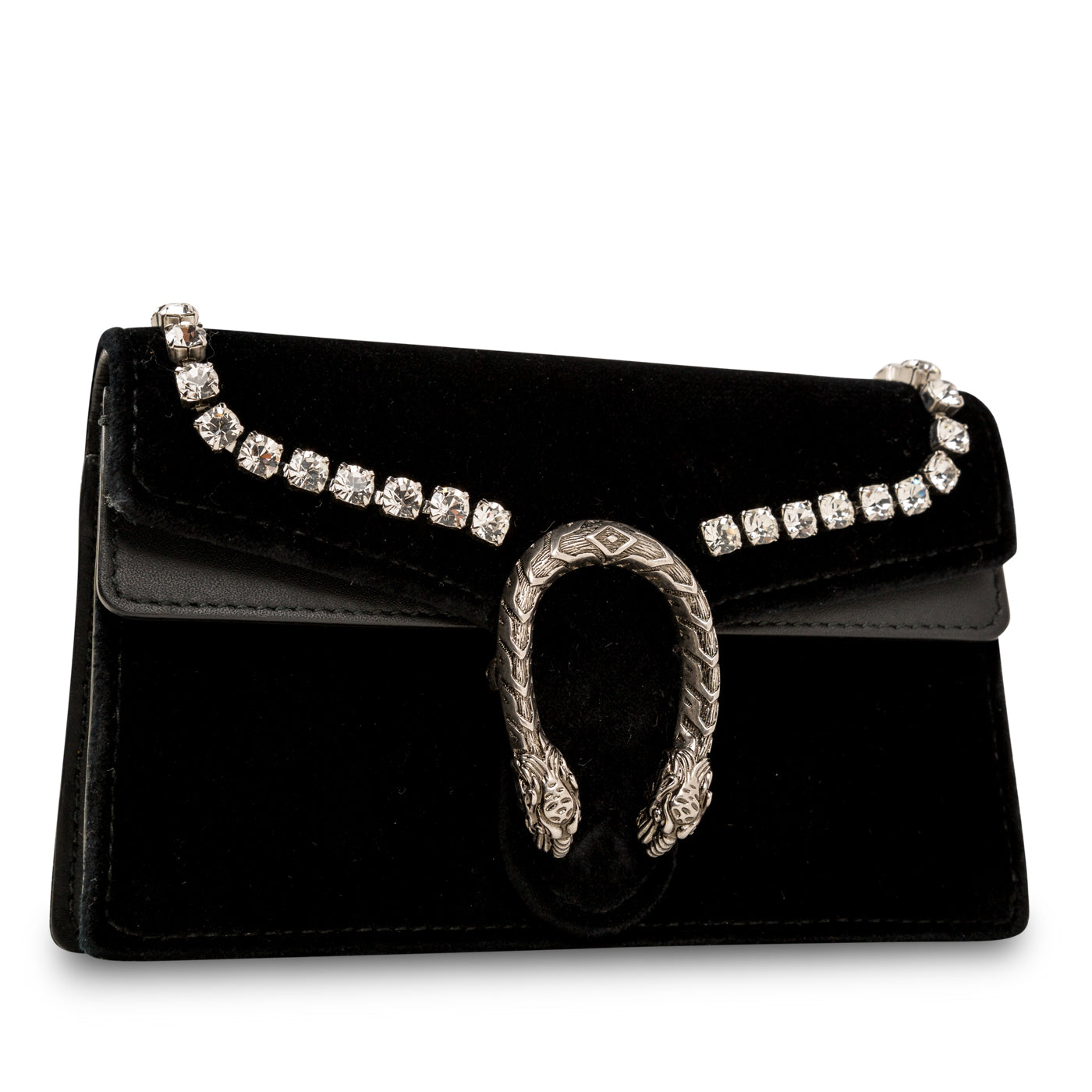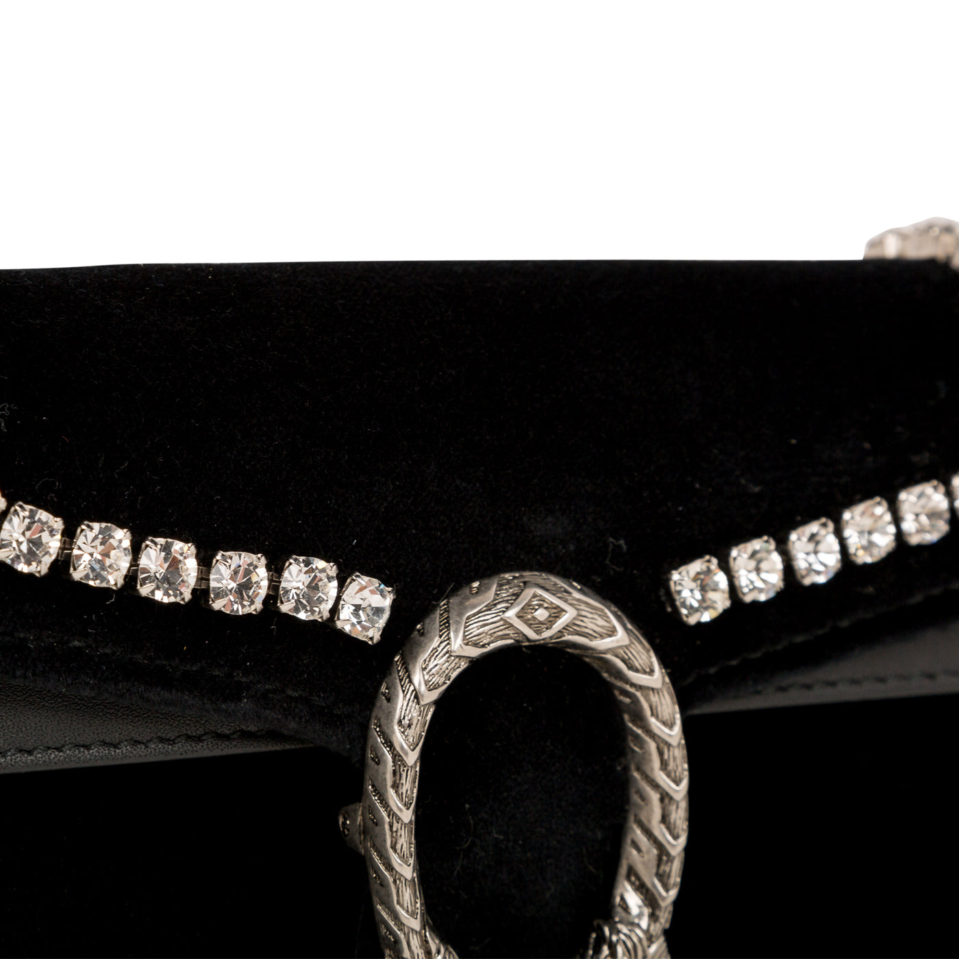 Inspired by the Greak God of wine and celebration, Dionysus. The Dionysus collection by Gucci are perfect bags to take out for special occasions. Decorated with crystal detailing and rich black velvet exteriorand the unique tiger head spur closure – exclusive to the Dionysus collection. This mini bag comes with a key chain to attach any accessory or any bag. The shoulder chain has a drop of 60 cm, perfect for cross body and over the shoulder use. Style this bag with a Gucci T shirt and jeans for a casual look, or a dark shaded dress and heels for evening wear and partying.