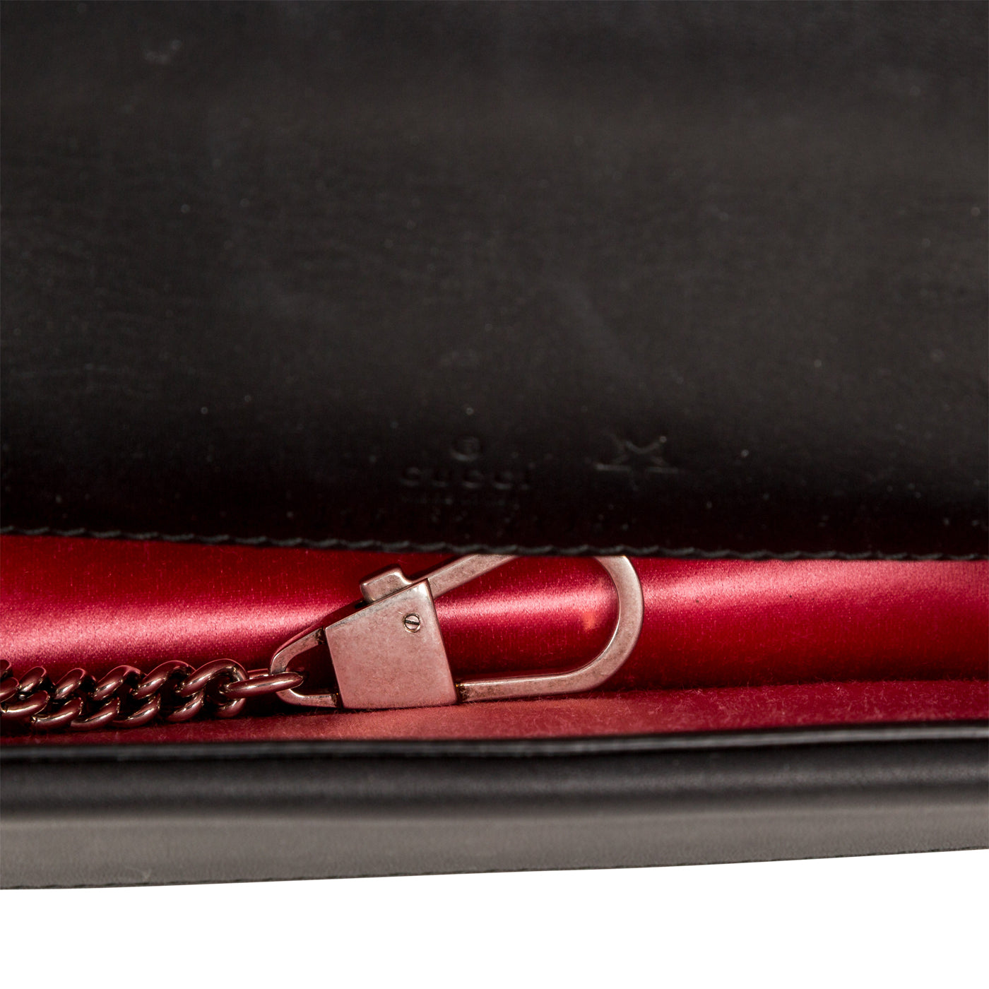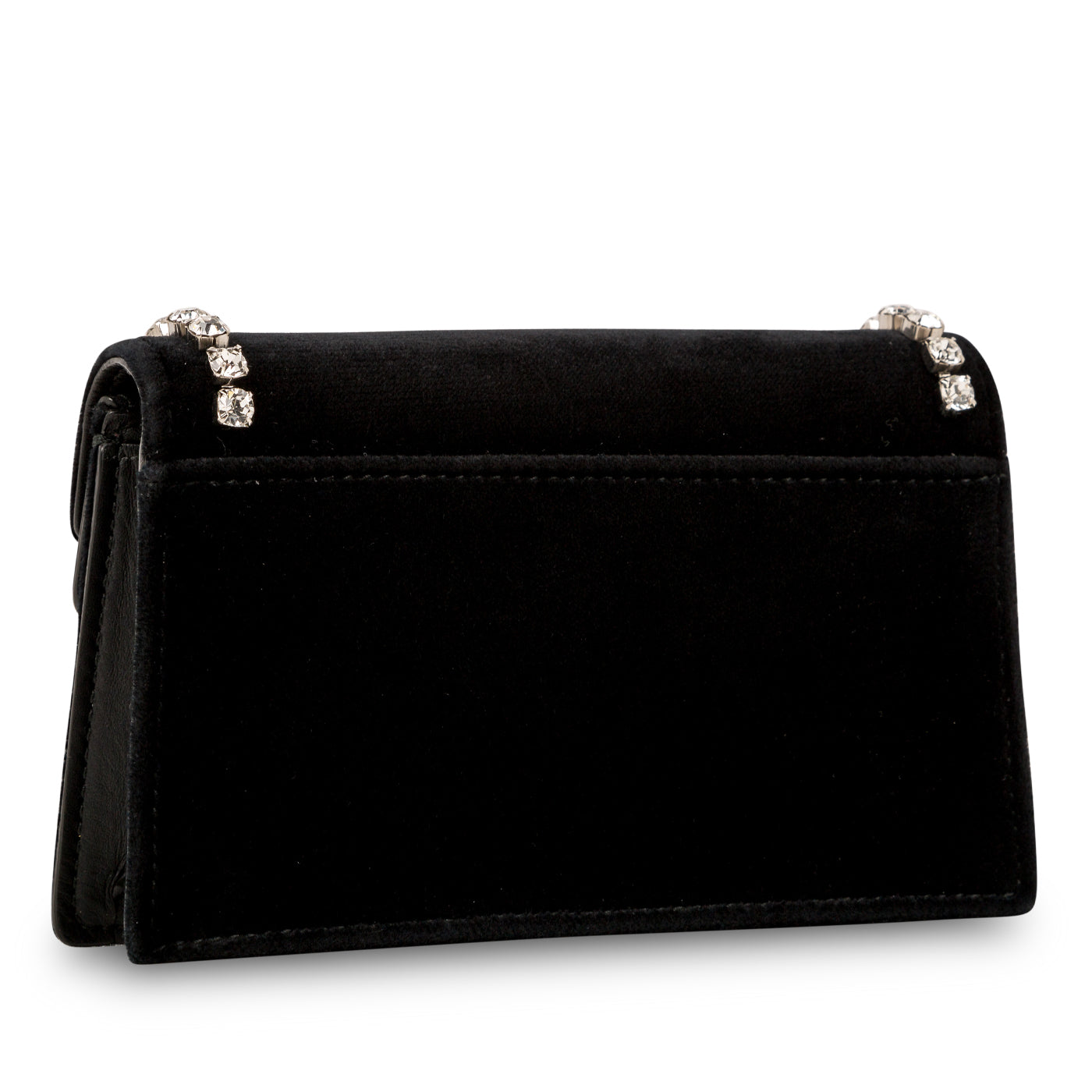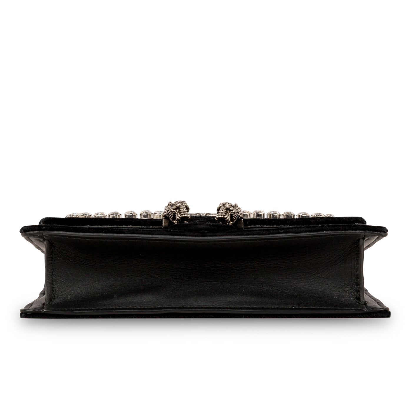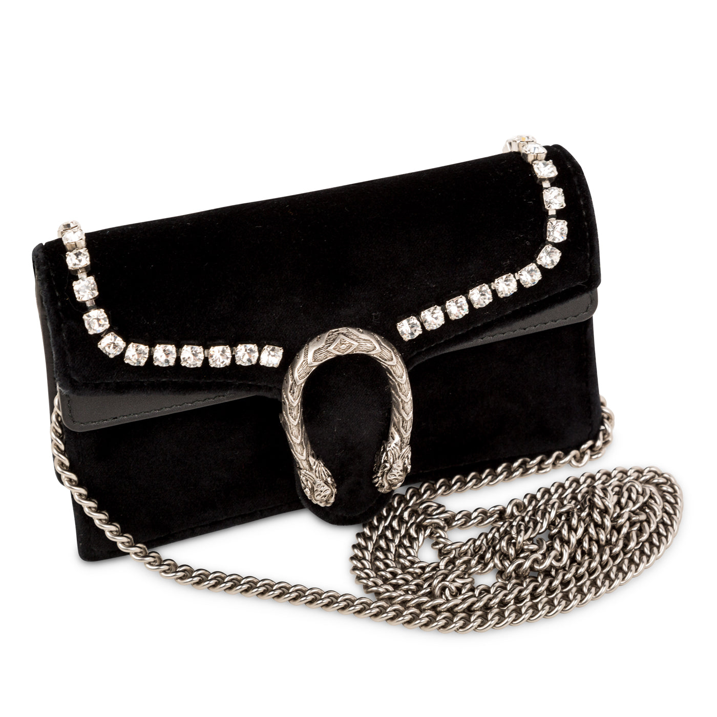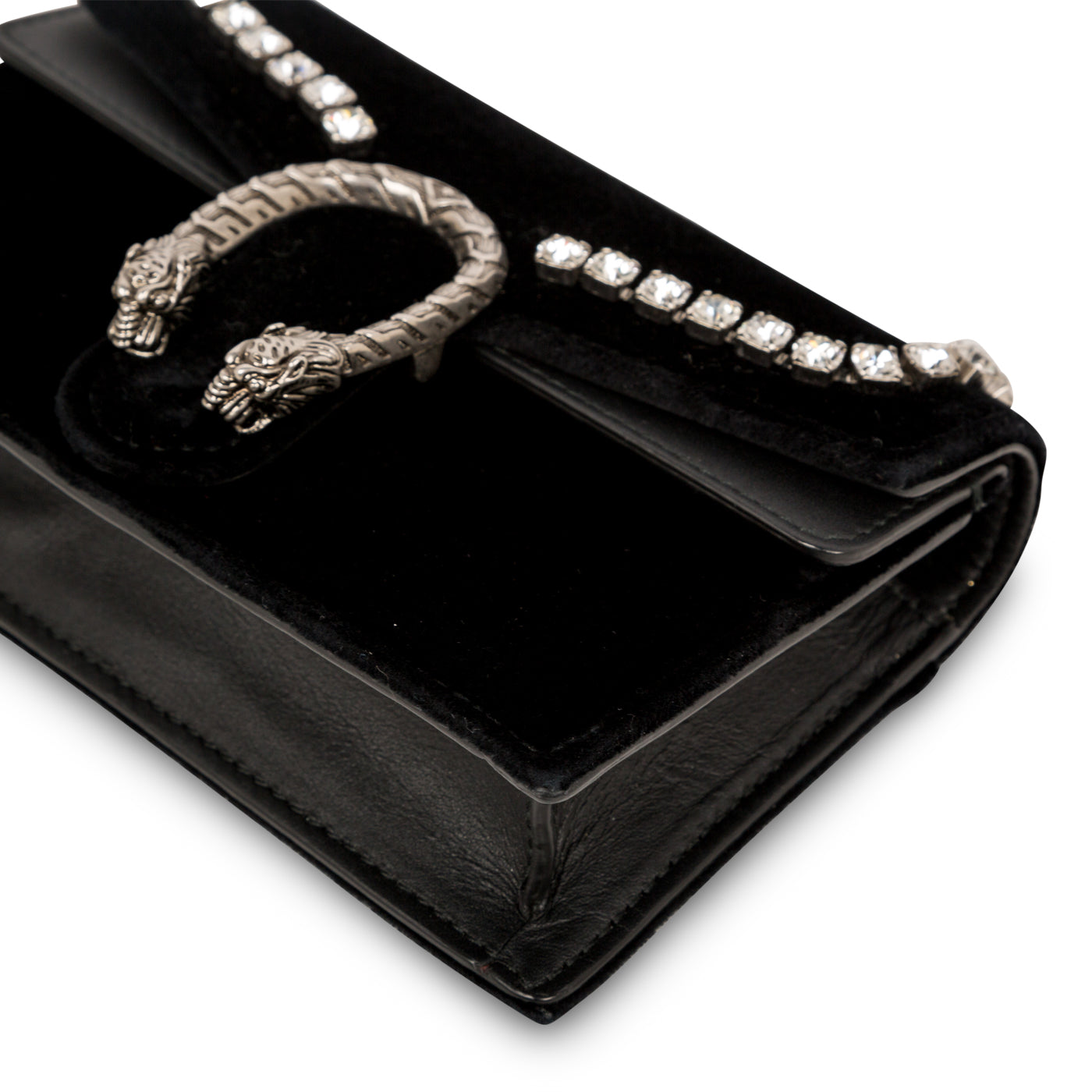 Inspired by the Greak God of wine and celebration, Dionysus. The Dionysus collection by Gucci are perfect bags to take out for special occasions. Decorated with crystal detailing and rich black velvet exteriorand the unique tiger head spur closure – exclusive to the Dionysus collection. This mini bag comes with a key chain to attach any accessory or any bag. The shoulder chain has a drop of 60 cm, perfect for cross body and over the shoulder use. Style this bag with a Gucci T shirt and jeans for a casual look, or a dark shaded dress and heels for evening wear and partying.