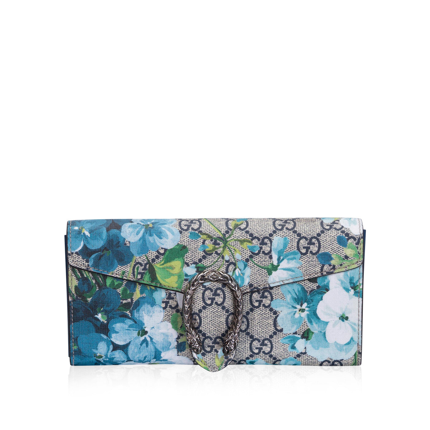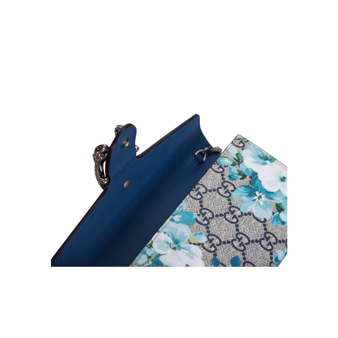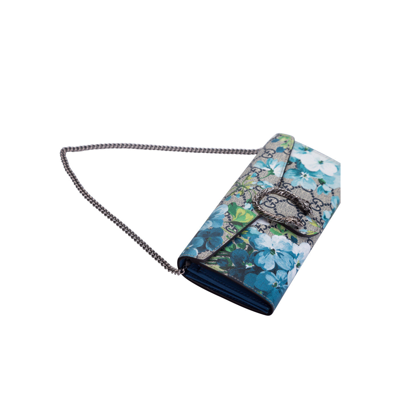 This Gucci mini chain bag is the perfect summer accessory. It features a stunning iconic GG blooms printed canvas exterior, with antique silver hardware. The tiger headed closure is inspired by the Greek God Dionysus, which features heavily throughout their current accessories collection. With a detachable chain strap, it can be worn as a clutch alongside your spring or summer dresses for an easy chic look.