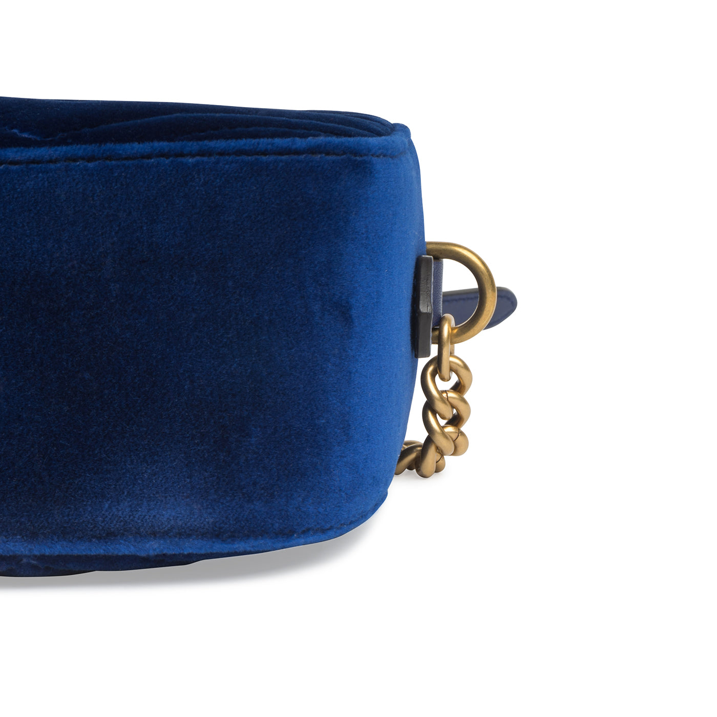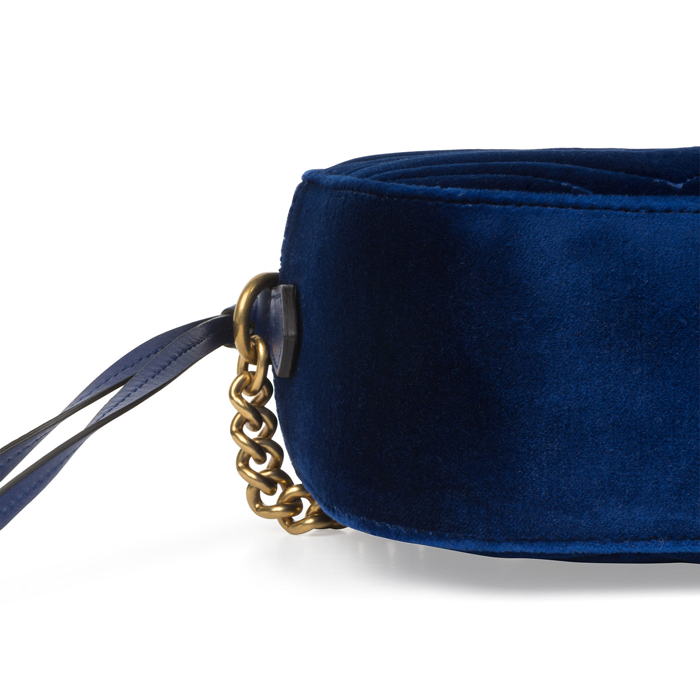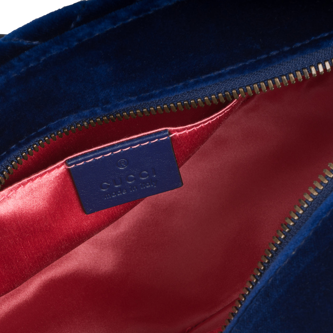 Gucci presents its highly-acclaimed GG Marmont in royal blue velvet. Crafted from the fashion house’s quintessential chevron design, this handbag also features a GG logo stitch on its rear. The GG Marmont is also accented with antique gold hardware, complimenting the romantic hue. The bag’s opens up to showcase a magnificent pink satin lining, presented in a single storage compartment. Ideal for day-to-night usage, the GG Marmont is perfect for styling with anything you may have in your wardrobe.