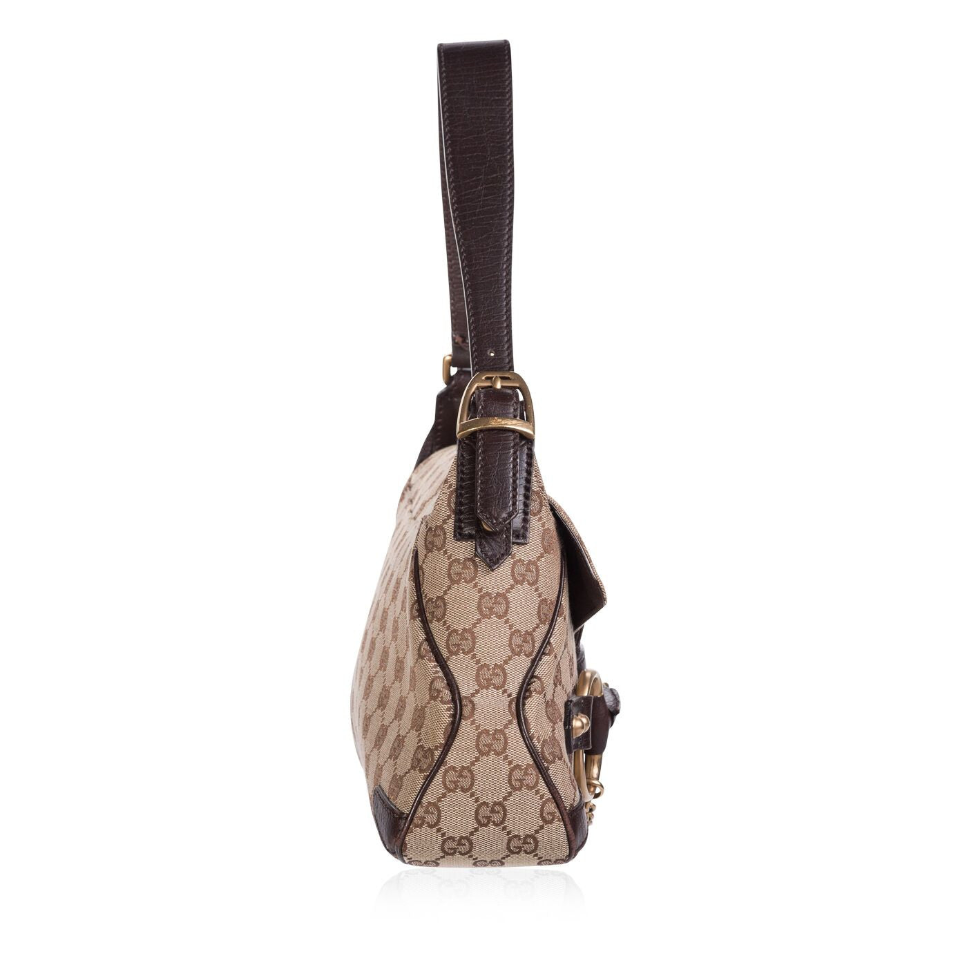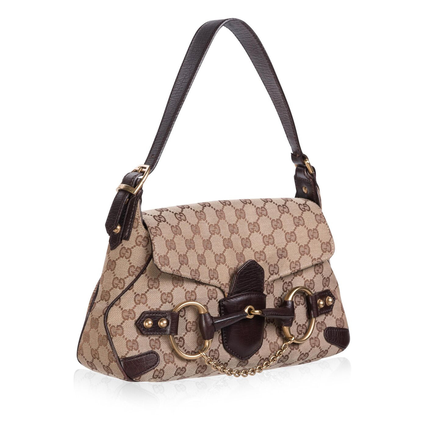 - Single loop shoulder strap with horsebit and ring accents