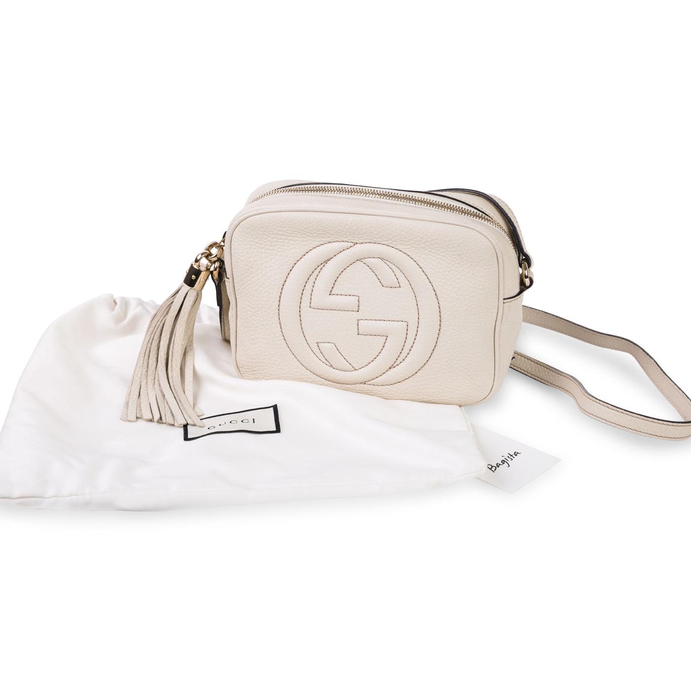 The Soho Disco bag is the most popular bag for girls on the go. The small size compliments any woman who only needs a few items to hold. The bag is crafted with beige leather and comes with the iconic embroidered GG logo. Complete with a leather tassel attachment to the fastening. The adjustable leather strap makes it the perfect length for shoulder wear.