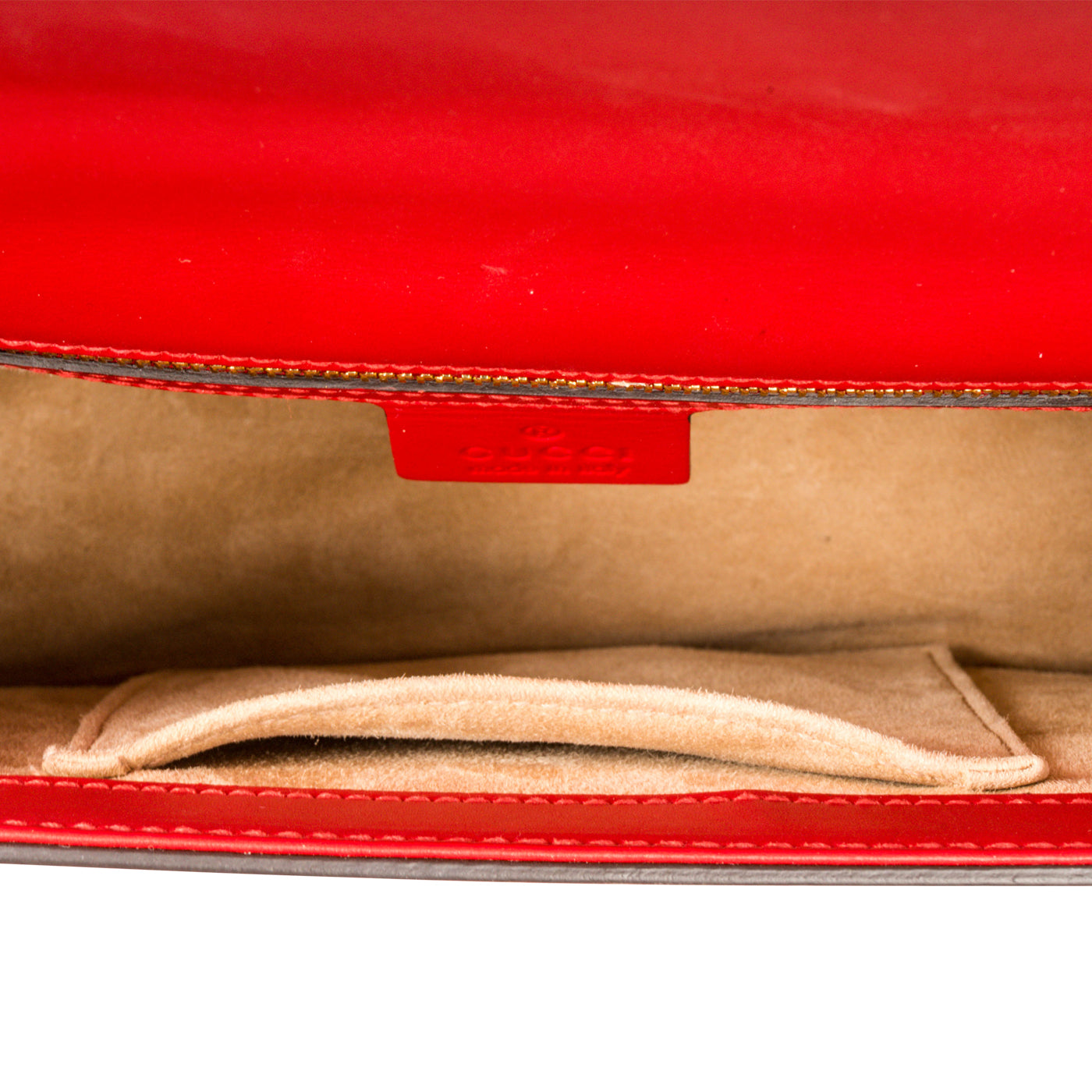 An instant classic the moment it hit the shelves, the Gucci Sylvie is one of those bags that every luxury-loving woman needs in her wardrobe. This stunning red baby is complimented by the brand's signature red and green striped ribbon handle and also features a removable leather shoulder strap ideal for cross-body usage. The Sylvie is an absolute necessity, especially during holiday season. With a gold buckle chain prominently depicted on the front flap, the Sylvie is luxurious, glamorous and the perfect compliment to any neutral-toned or monochromatic outfit. Whether you dress her up or down, you can be sure this bright, bold piece is the ideal accessory for any occasion. Sleek, stylish, sophisticated but youthful and playful at the same time, the Sylvie is a well-worthy addition to any luxury handbag collection.