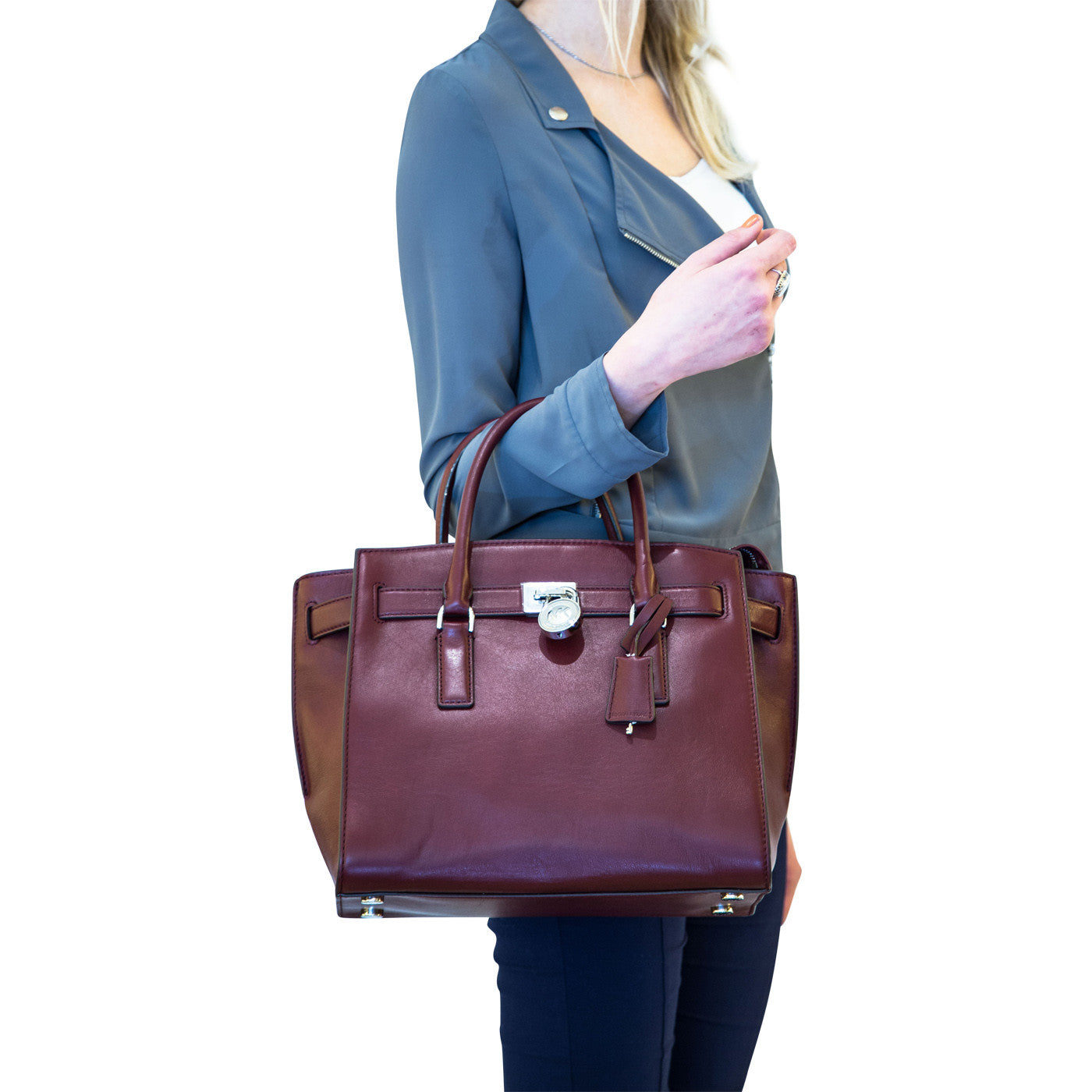The Michael Kors Hamilton Traveller in maroon with silver tone hardware is a sophisticated bag that features double handles, a detachable leather shoulder strap, crafted in a beautiful leather, with a concealed zip closure.