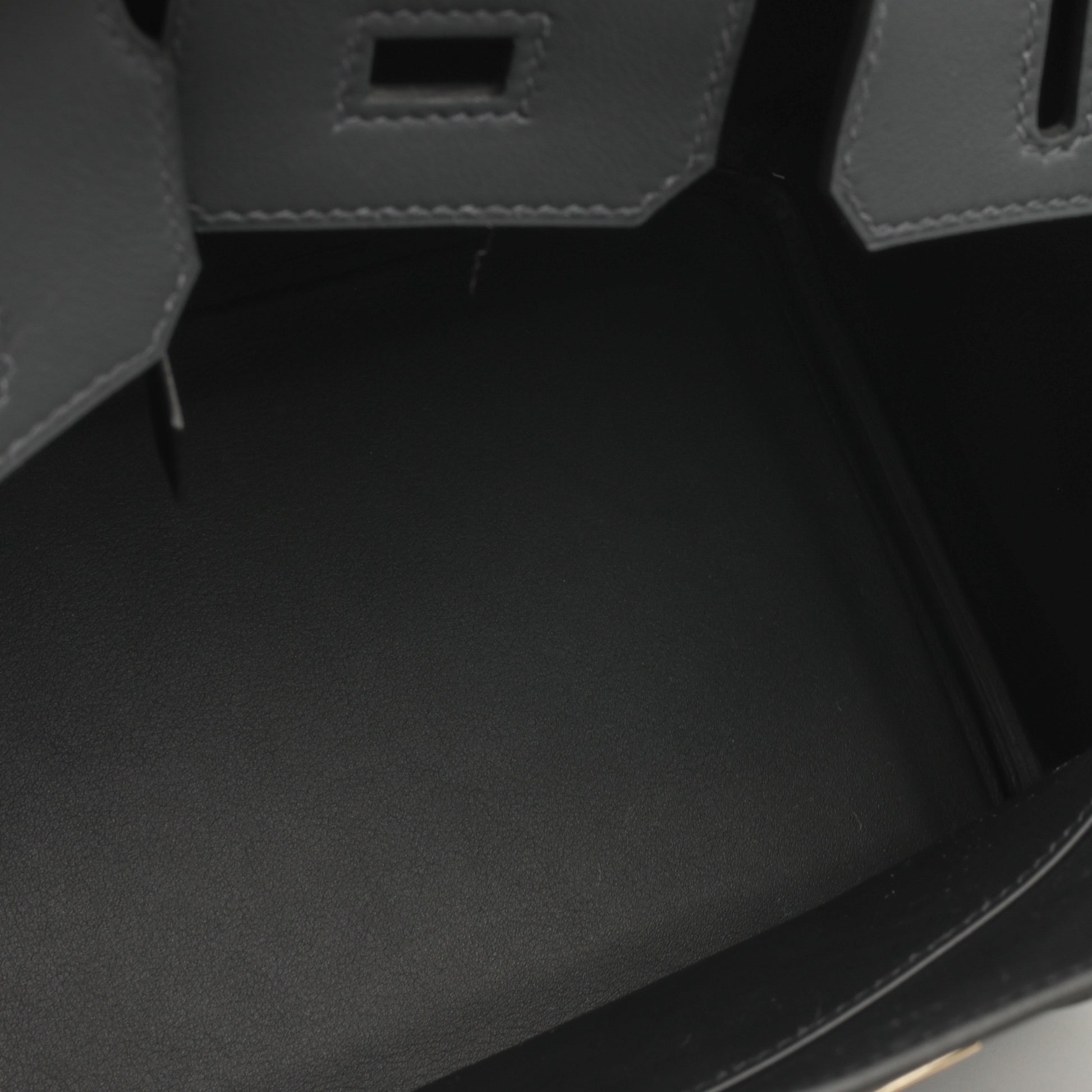 This Hermès Birkin 25 is crafted from a striking combination of soft Hermès Swift leather in elegant Gris Misty and Noir, complemented by warm permabrass hardware. The smooth, supple nature of Swift leather beautifully showcases the contrasting tones, giving the piece a refined yet contemporary appeal.