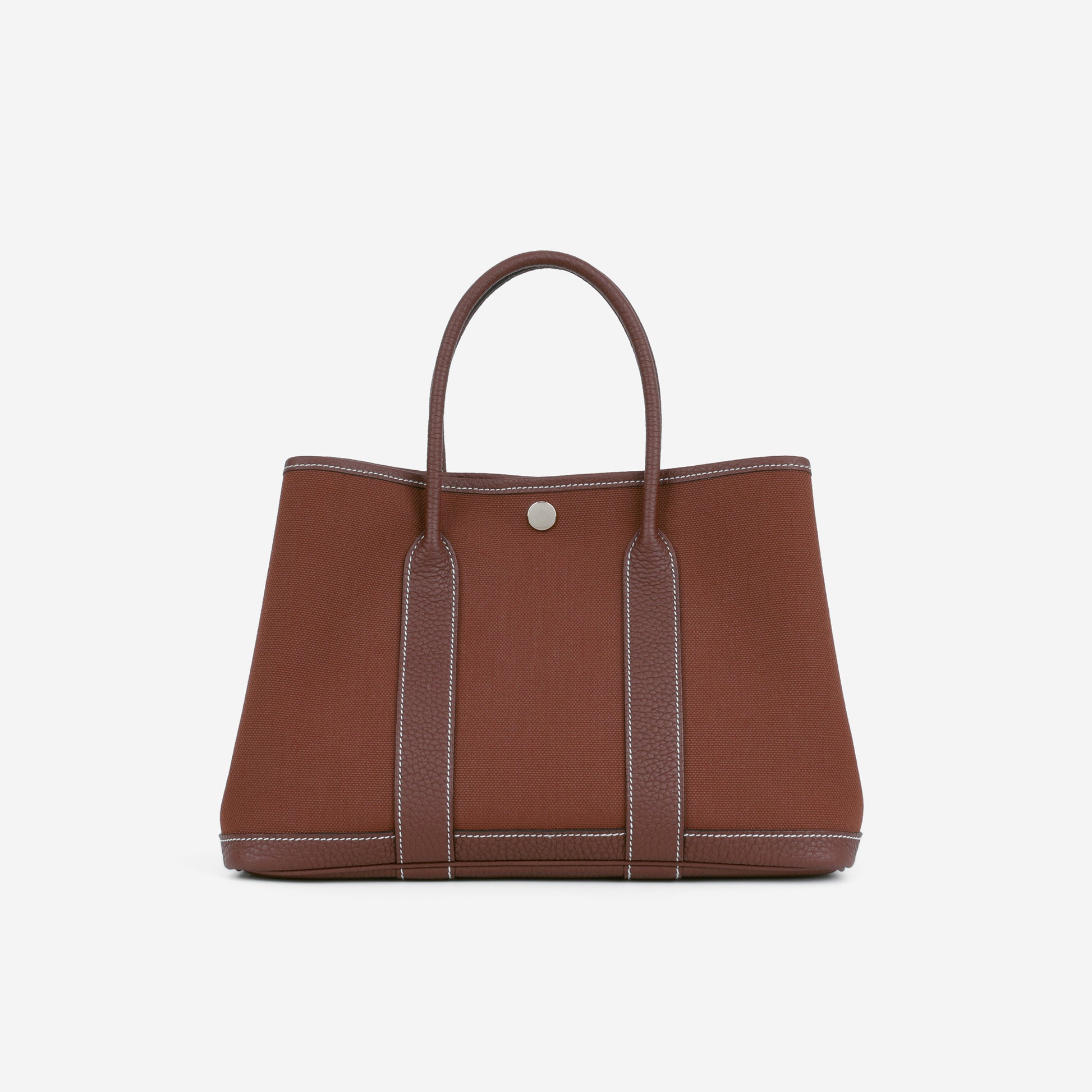 The Hermès Garden Party 30 in Rouge H canvas with Negonda leather and palladium hardware, featuring a K stamp (2025 production). A classic tote silhouette with snap closure and dual top handles.