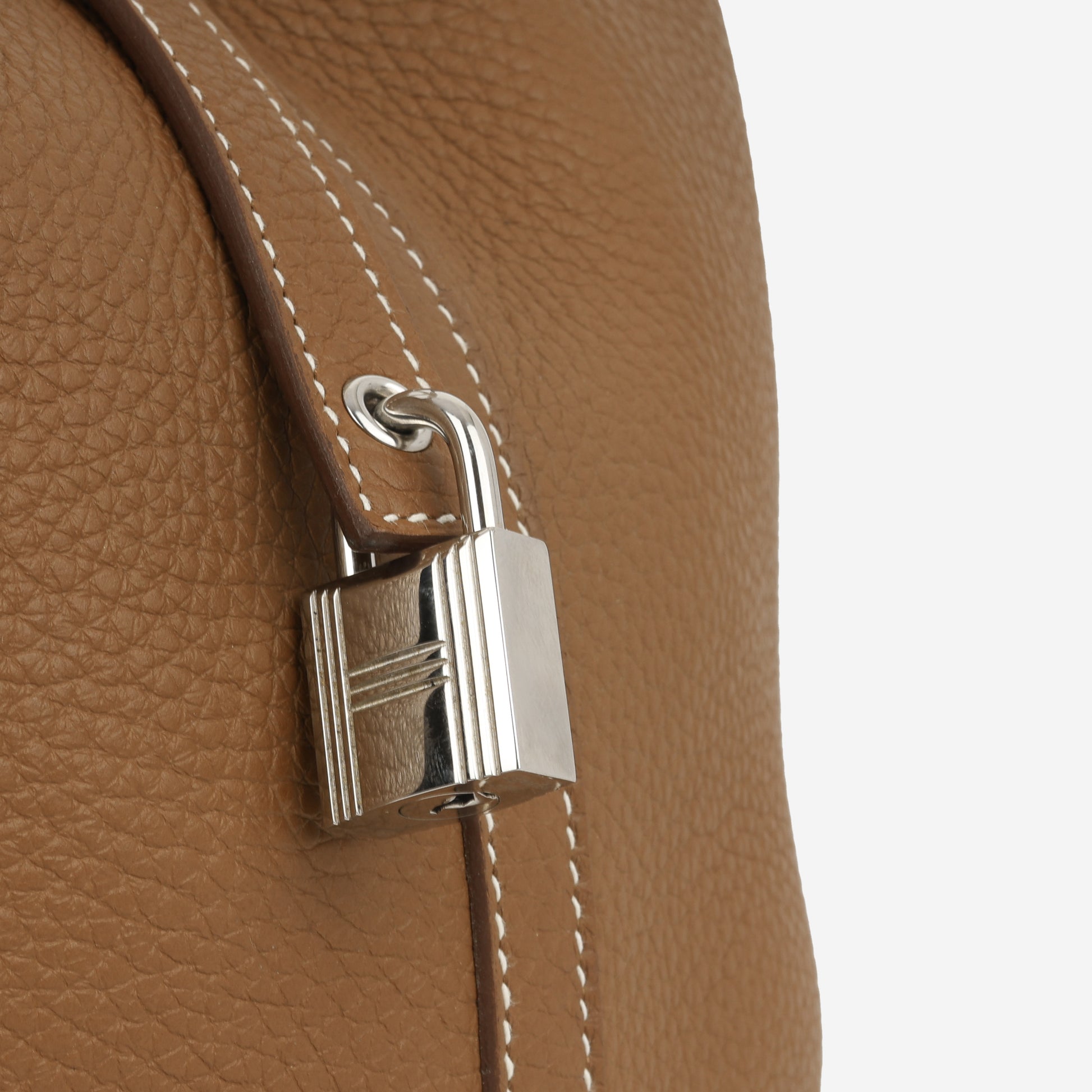 The Hermès Picotin 22 Éclat in Gold and Nata is a striking blend of classic and modern, offering effortless sophistication in a relaxed, functional silhouette. Crafted from luxurious Clemence leather, this elevated bucket bag features Hermès’ iconic Éclat design, pairing the timeless Gold exterior with a fresh Nata leather trim and contrasting edges for subtle dimension and style.