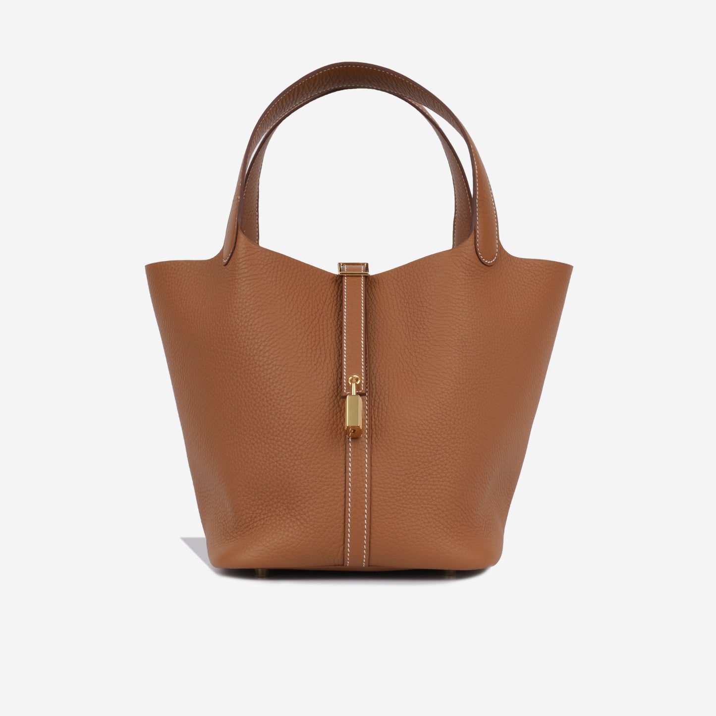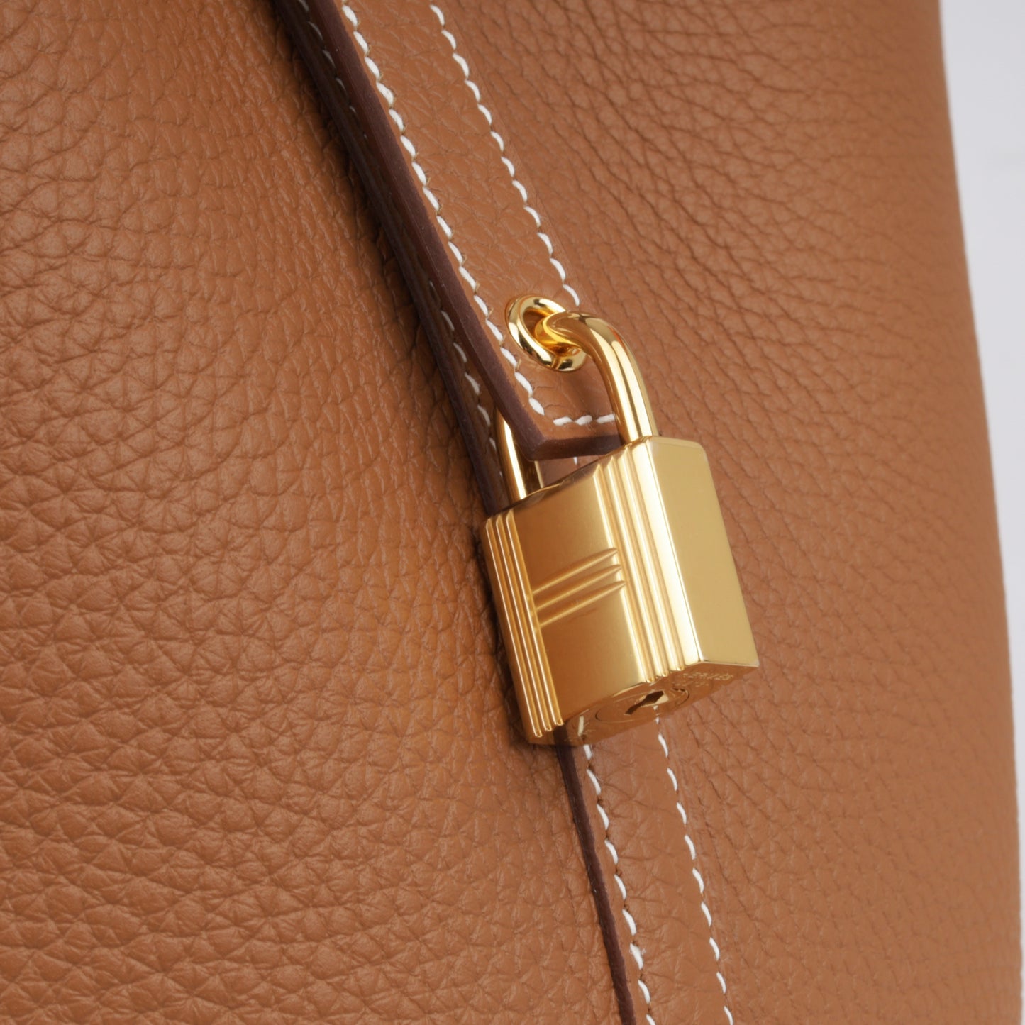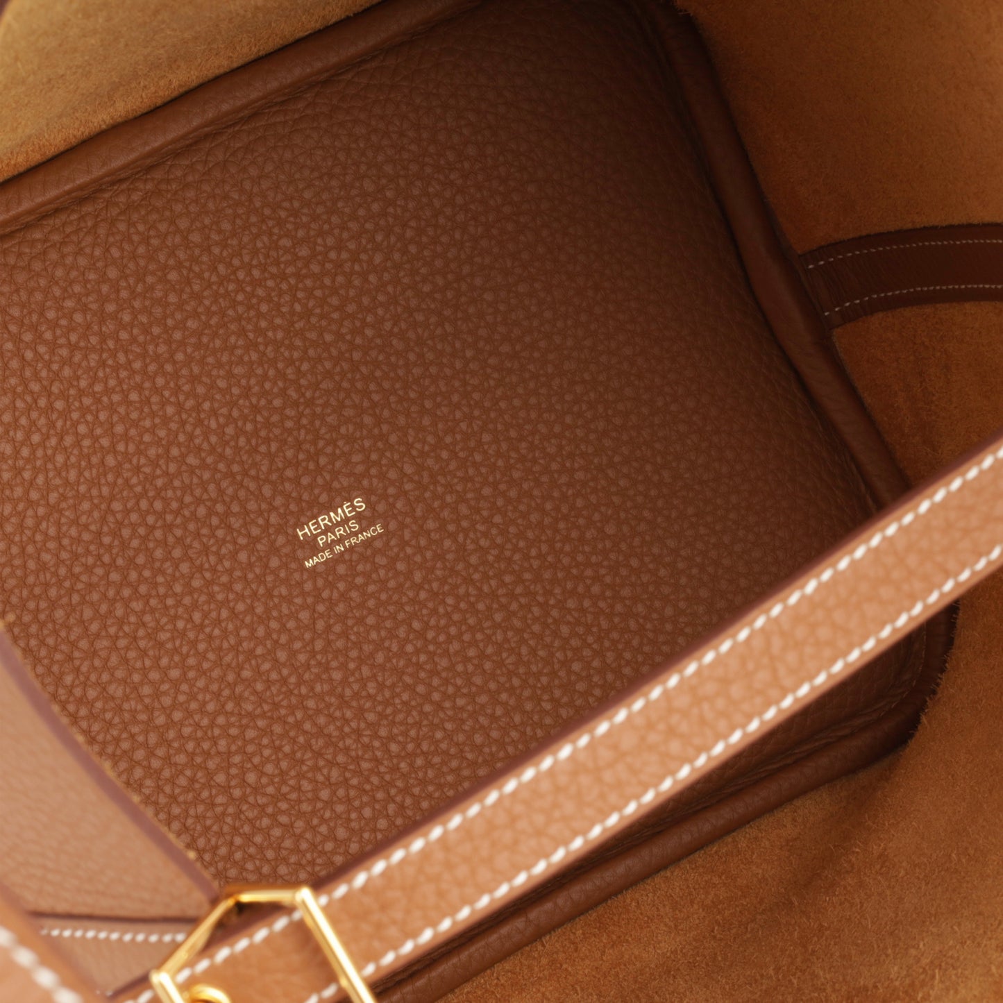 Carefully crafted from supple, textured leather, Hermès presents their stunning Picotin 22 bag in a beautiful combination of Gold Clemence leather and gold hardware. Hermès is acclaimed for their leather quality, as well as being at the very top of the fashion hierarchy. Simple, elegant, and understated, each Hermès bag is timeless and tasteful.