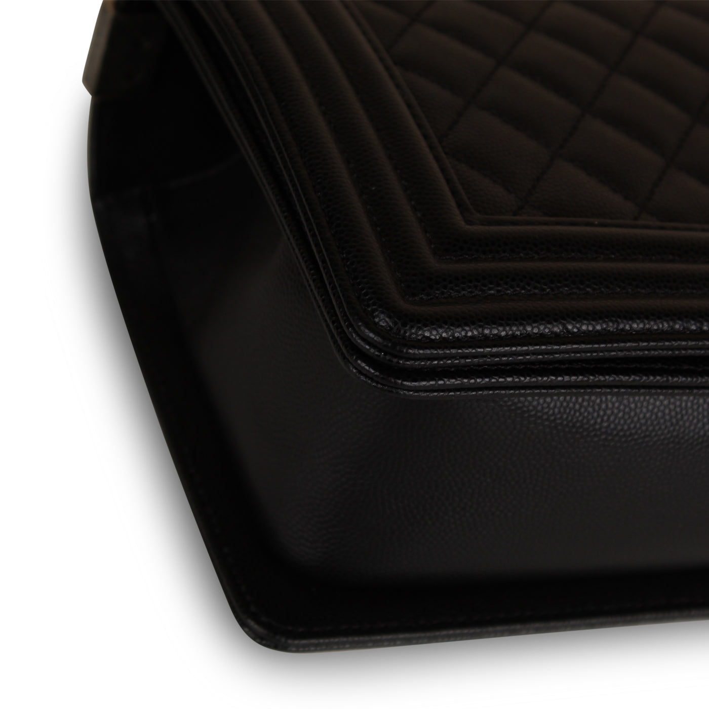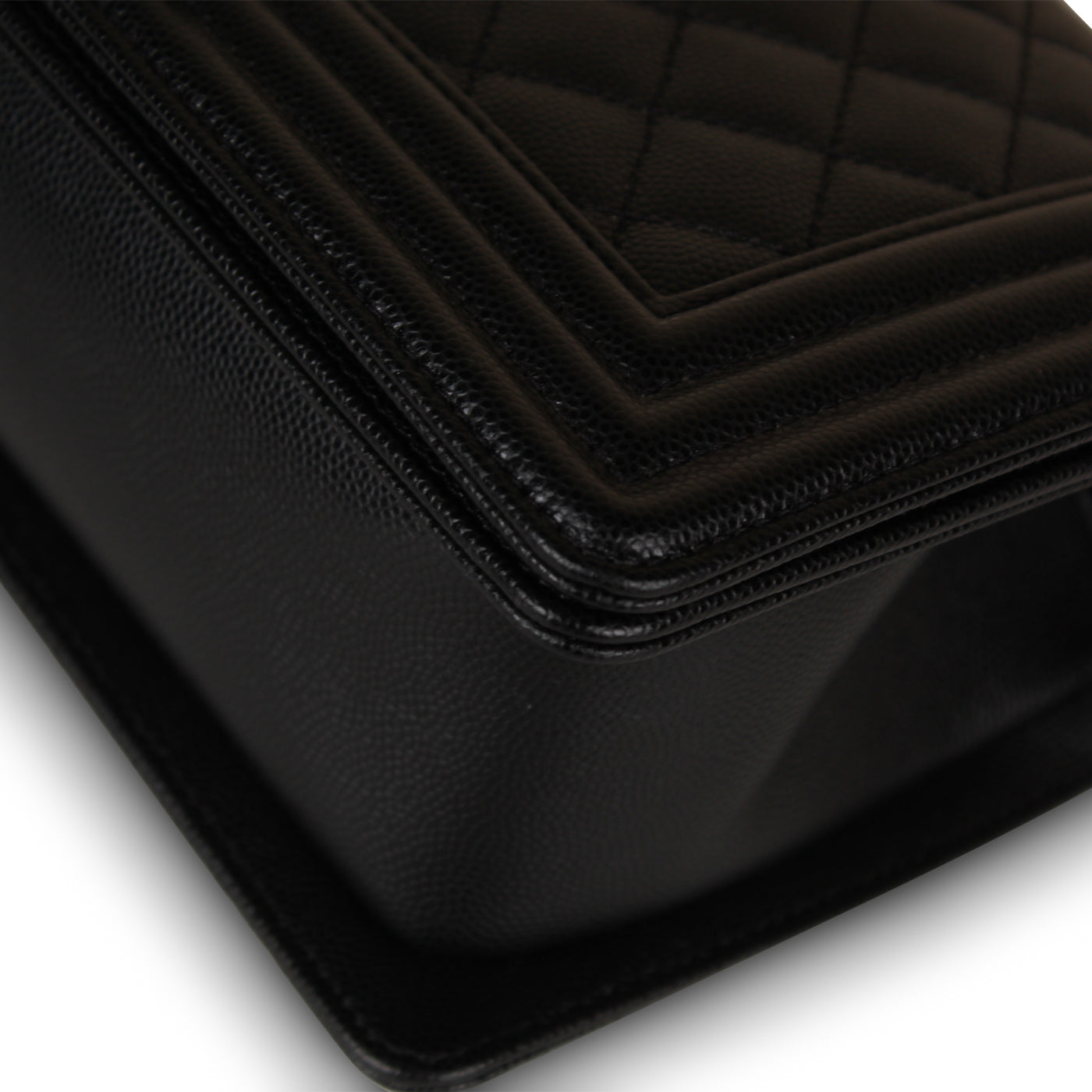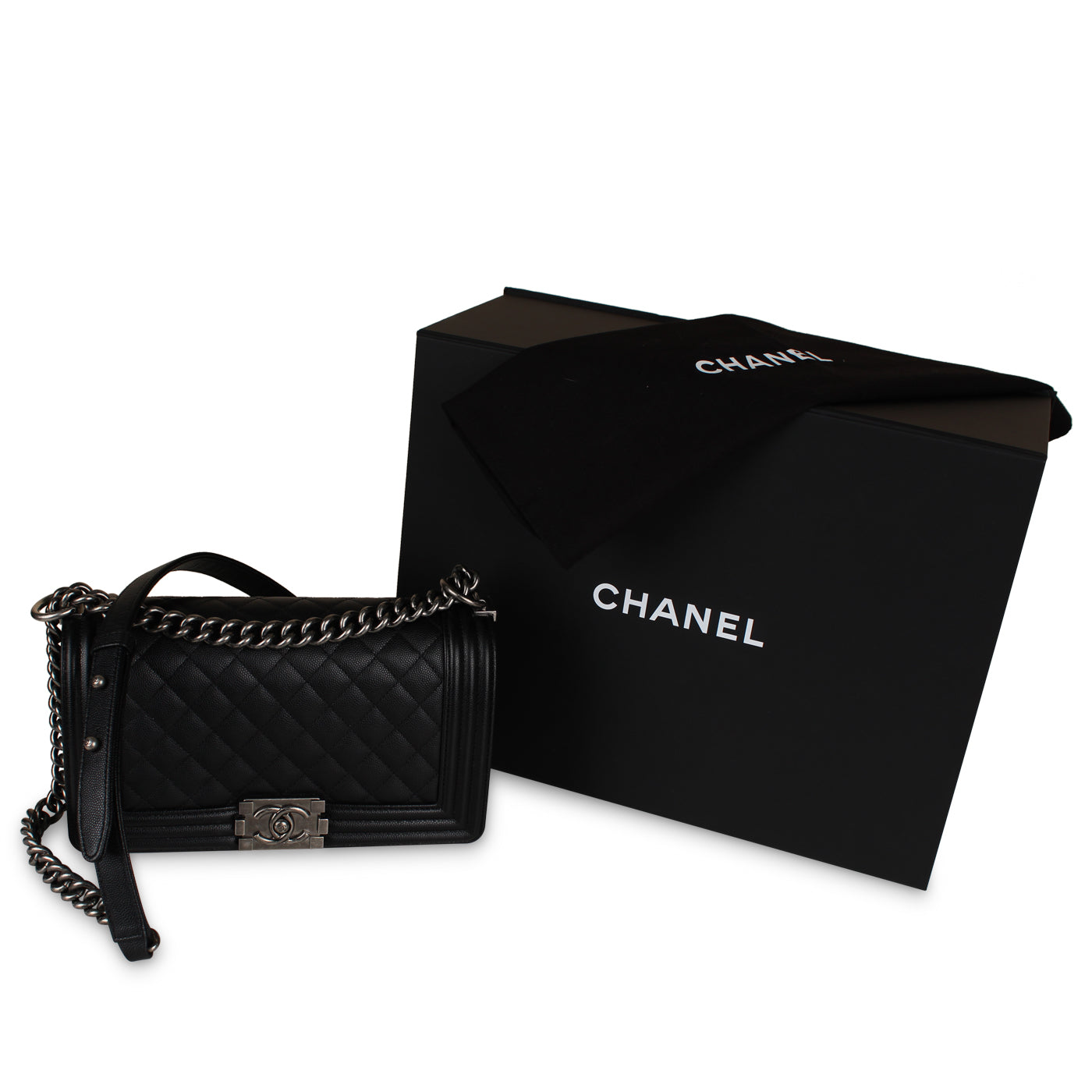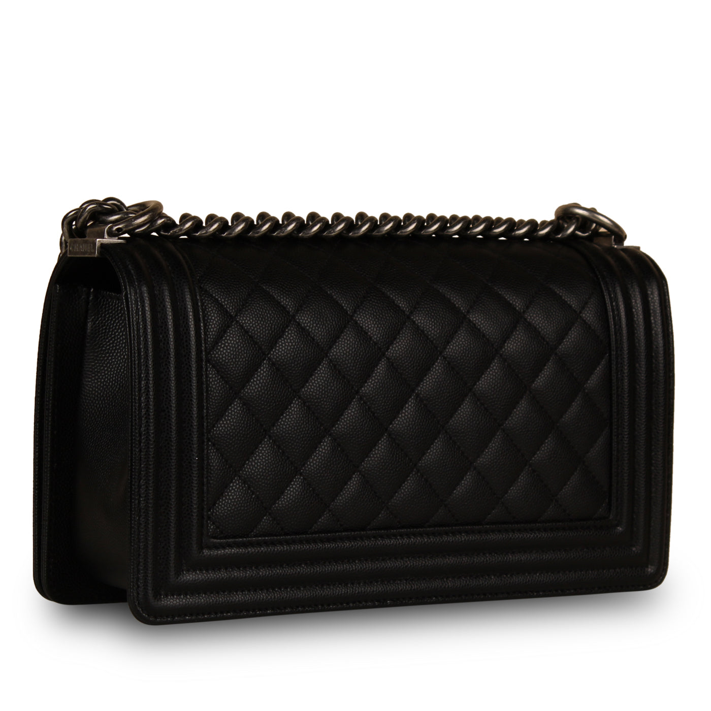 Chanel presents one of its highly acclaimed and most sought-after bags, the Chanel Boy Bag in size Old Medium in the wonderful and classic Boy Bag Combination of Black quilted caviar leather and ruthenium tone hardware. As designed by Karl Lagerfeld, the Boy Bag collection was established to embody boyish charm and femininity.