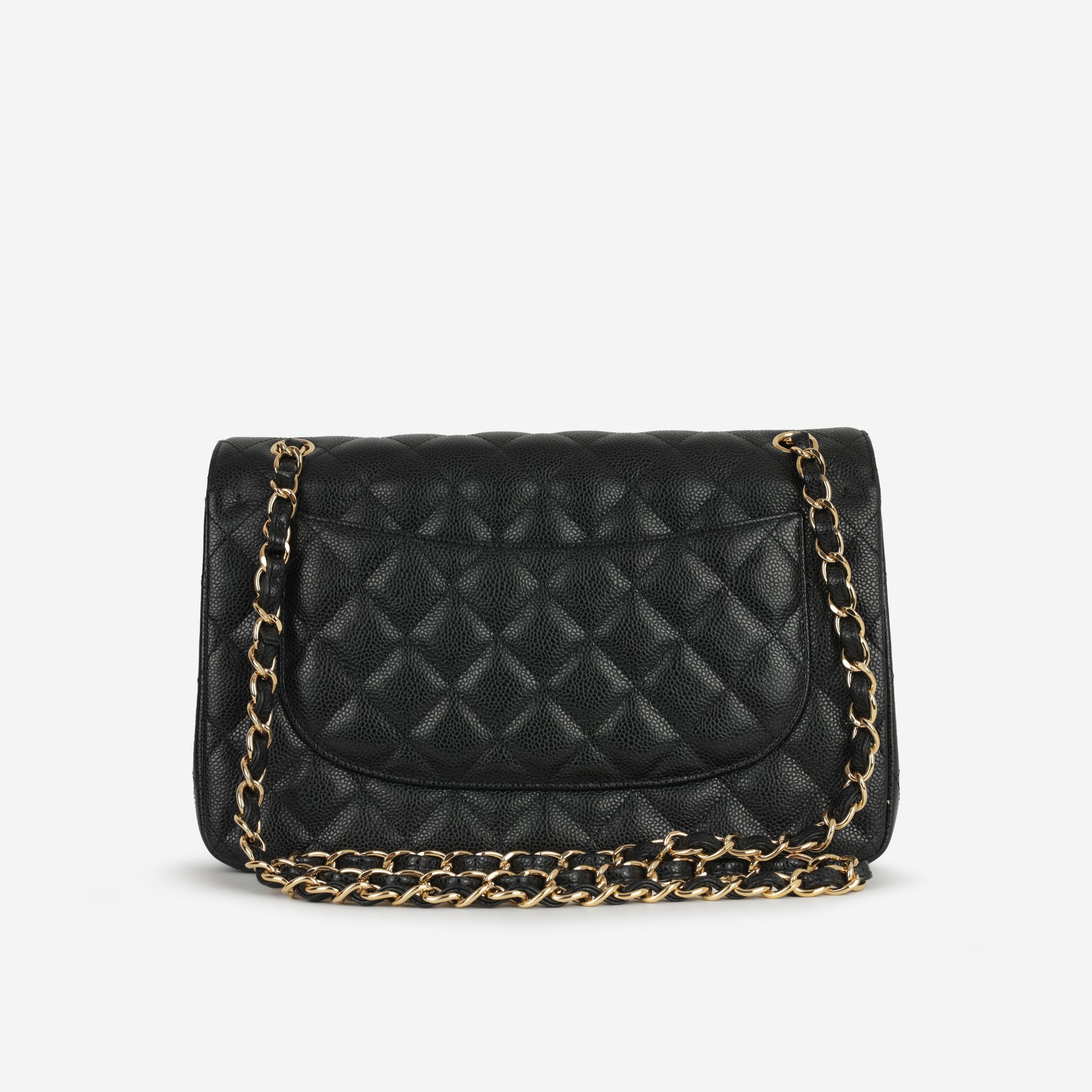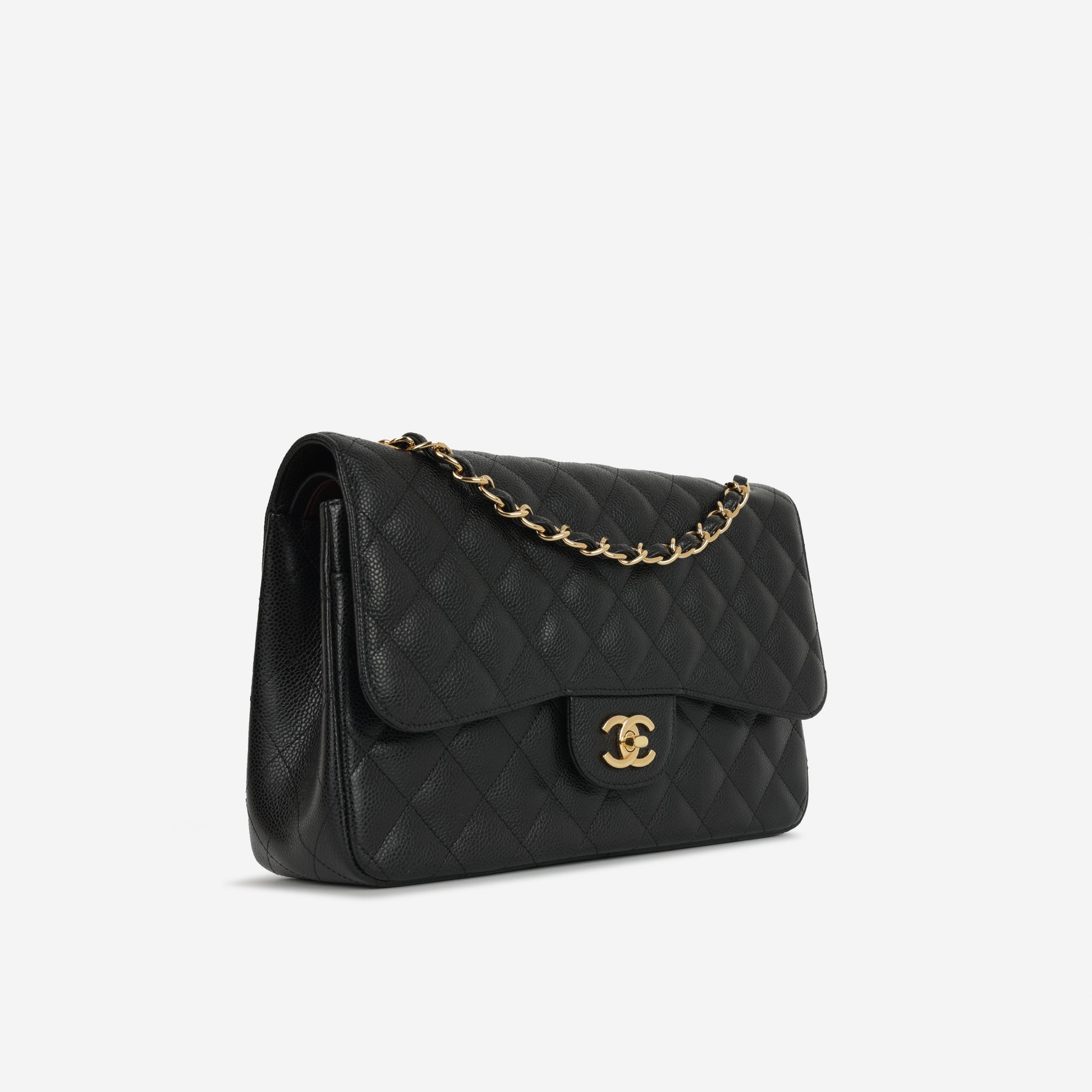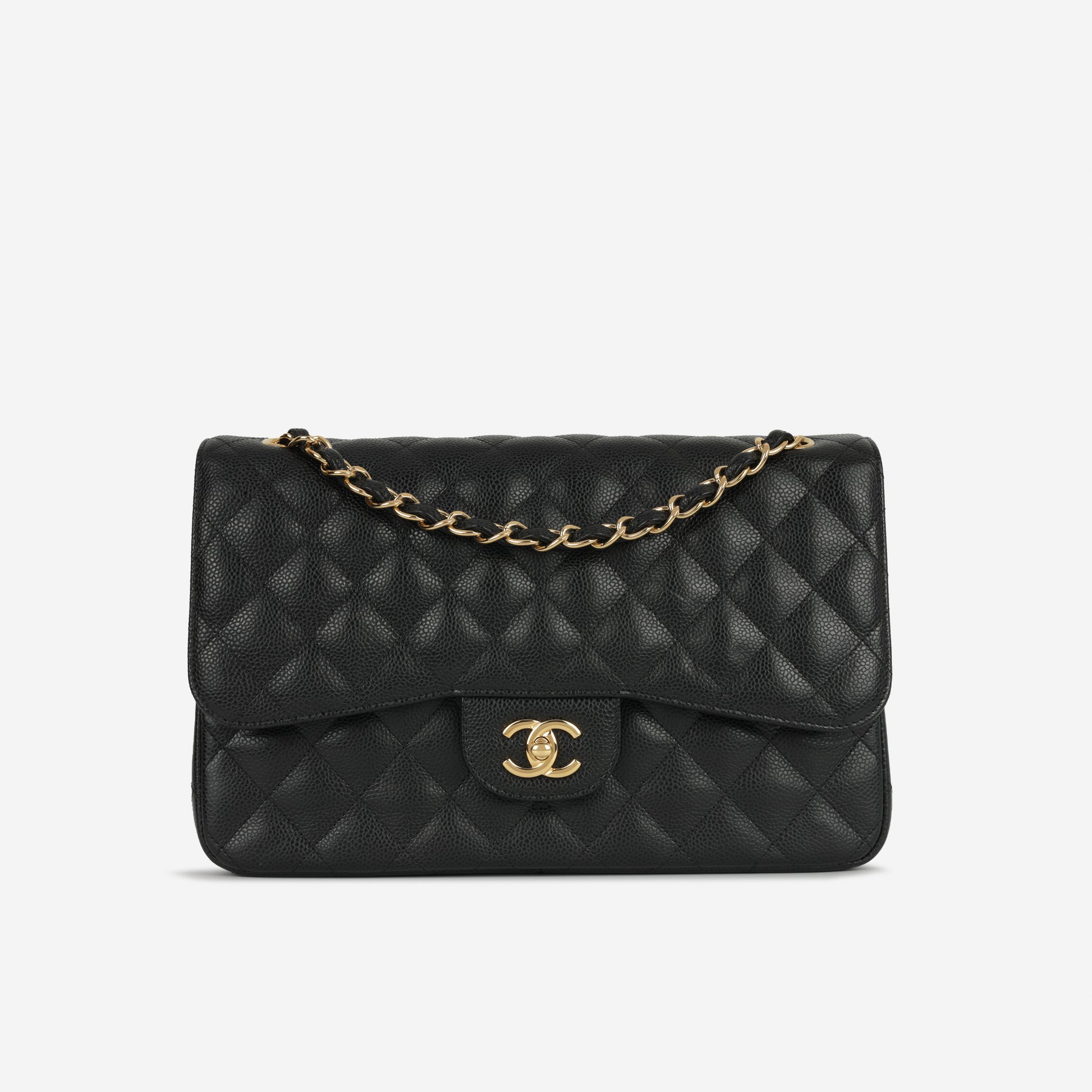 Chanel continues to present its signature line of Classic Flap bags. Under the creative direction of Karl Lagerfeld, the Classic Flap is perhaps the most acclaimed bag in all of fashion history. Timeless, elegant and sophisticated, it's no wonder the Classic Flap is, well, a classic. Featuring its infamous quilted caviar leather and interwoven chain / leather strap, the Jumbo is an absolute must-have in any luxury handbag collection. Not only is this highly coveted, stunning black bag the perfect compliment to pretty much anything you have in your wardrobe, but it's also an investment piece that will never lose its value.