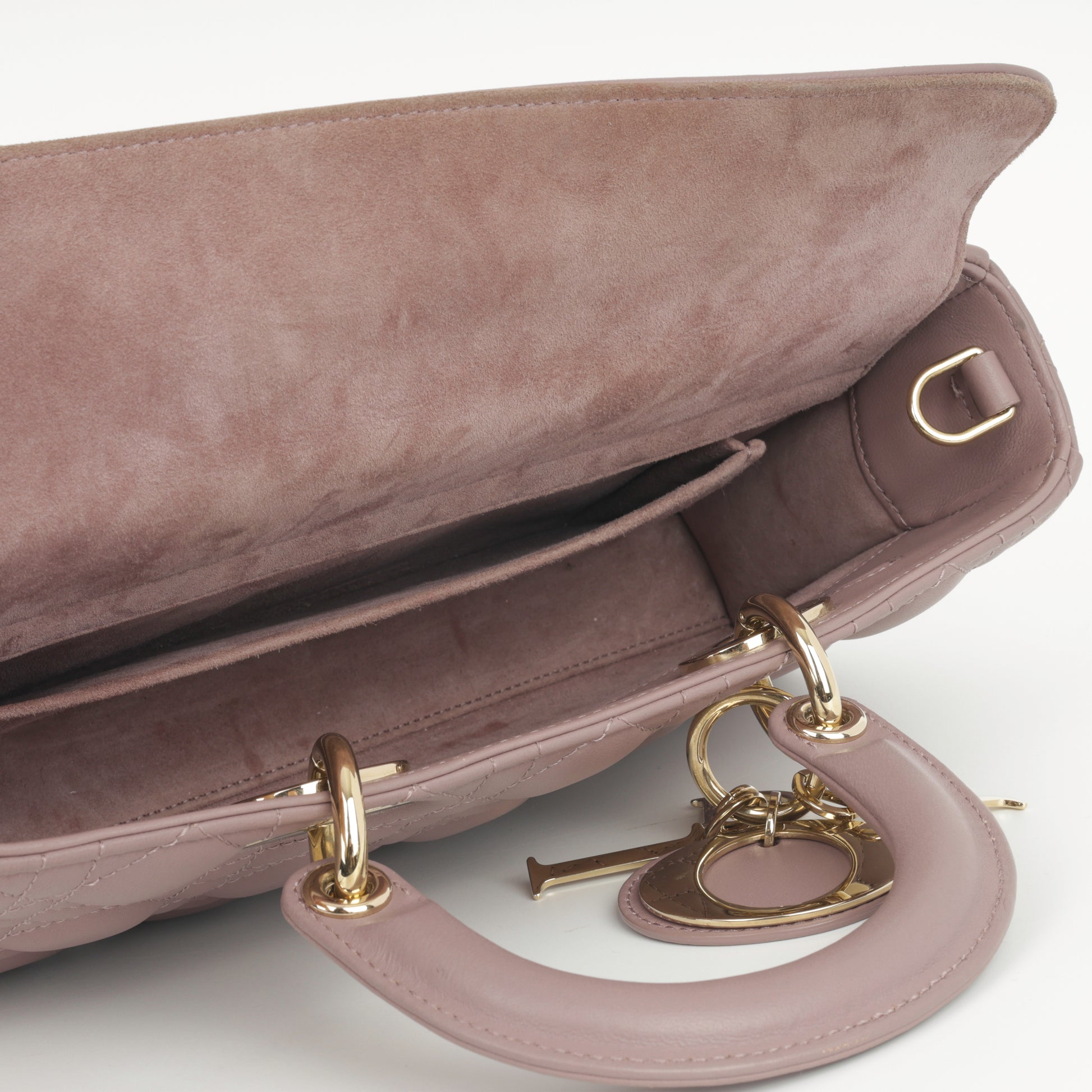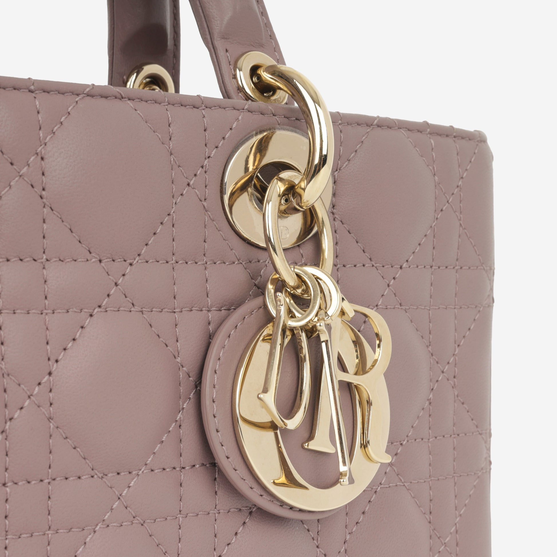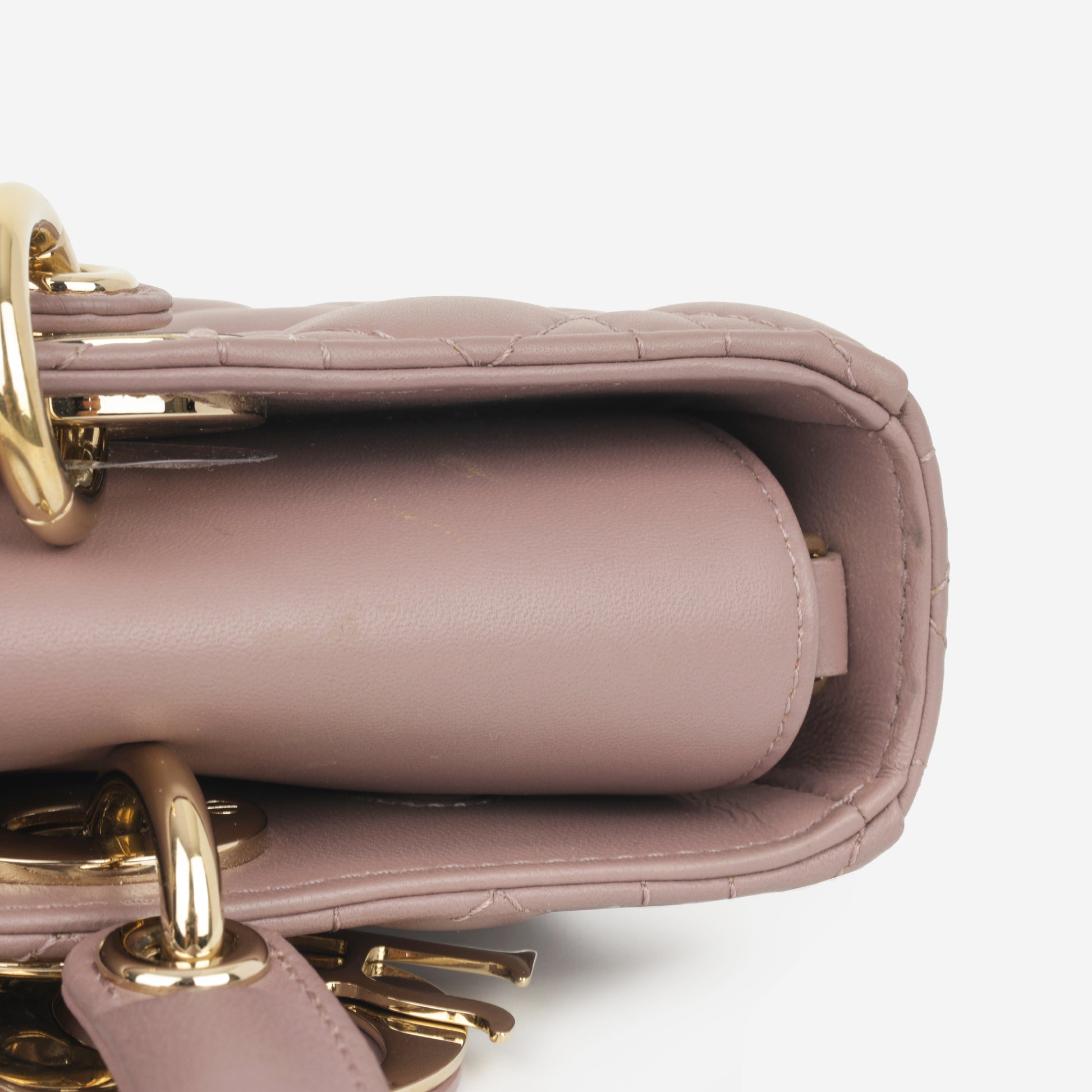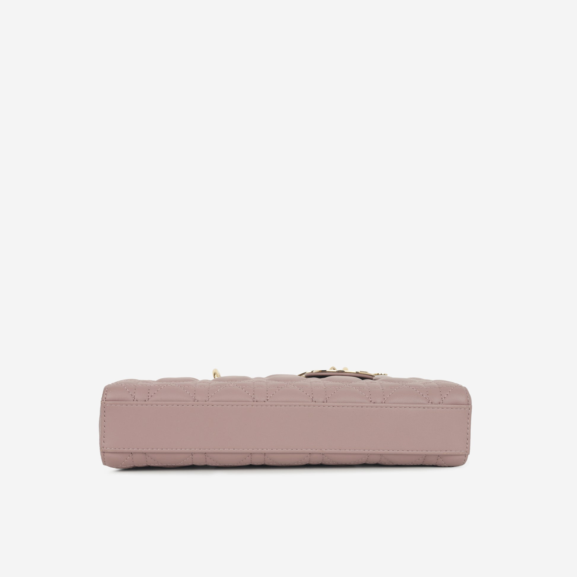 The Lady D-Joy bag effortlessly express the House's unwavering commitment to elegance and refined aesthetics, drawing inspiration from the iconic streamlined design of the renowned Lady Dior line. Crafted with precision from lambskin and adorned with meticulous Cannage stitching, this masterpiece exudes a timeless style that is further elevated by the graceful presence of pale gold-finish metal D.I.O.R. charms delicately adorning its silhouette.