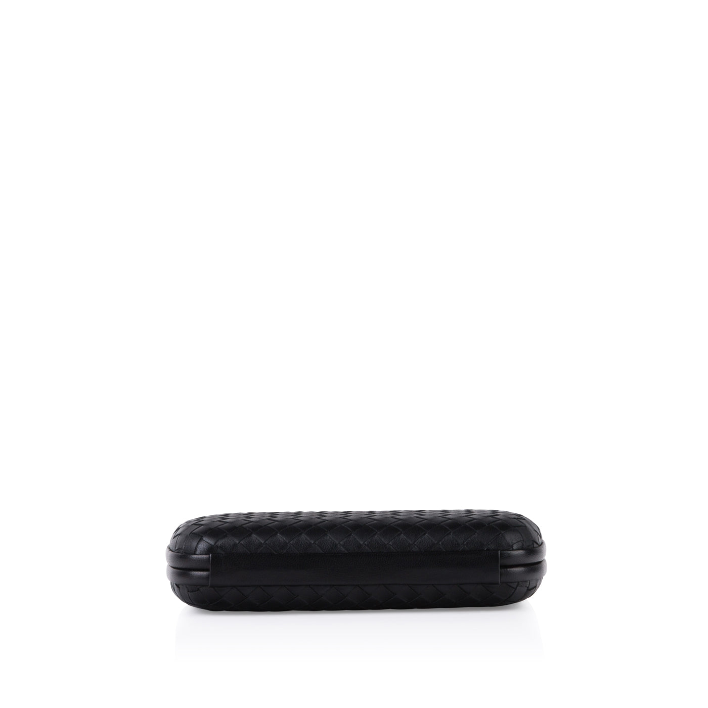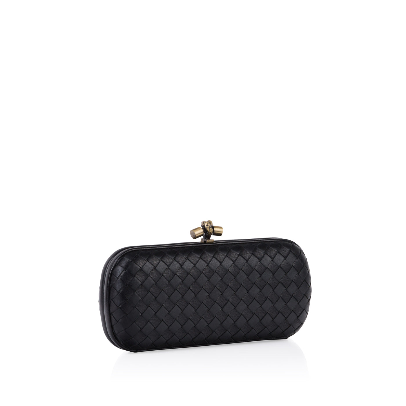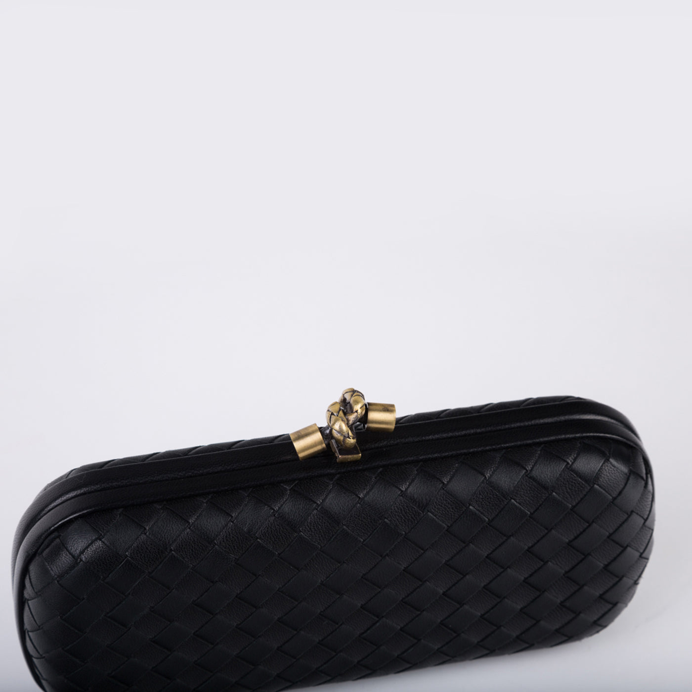 The Bottega Veneta Knot clutch bag is a compact, luxurious bag that is perfect for the evening. Crafted from smooth, black leather with the brand's signature intrecciato design, the delicate and elegant design works perfectly with the rounded, feminine nature of the clutch bag. It is finished with the signature knot fastening in an antique gold tone hue, embossed with the Bottega Veneta logo. Dress this bag up with anything from a simple cocktail dress to a ball gown for more formal occasions, it's the ideal accessory to compliment any evening attire.