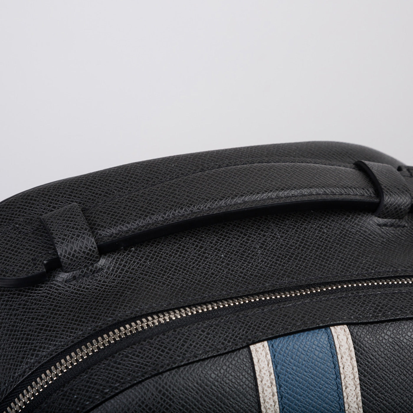 Carefully crafted from Ardoise Taiga cowhide leather, Louis Vuitton presents the Anton backpack. Although this bag is in the mens section, the Anton backpack can be worn by anyone. This piece may be sleek, edgy, and sophisticated, but the blue and white stripe down the front of the bag gives it a youthful touch. Ideal for any individual on the go, it's spacious enough to carry your school books, work laptop, or just your every day necessities. The Anton backpack is functional as well as fashion forward and can be worn with any casual look.