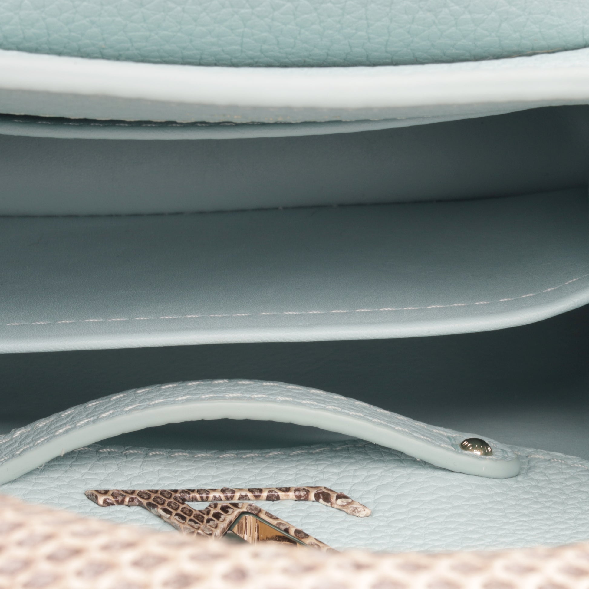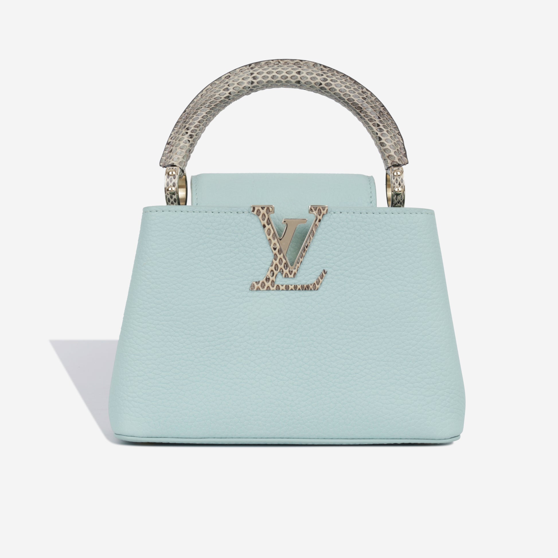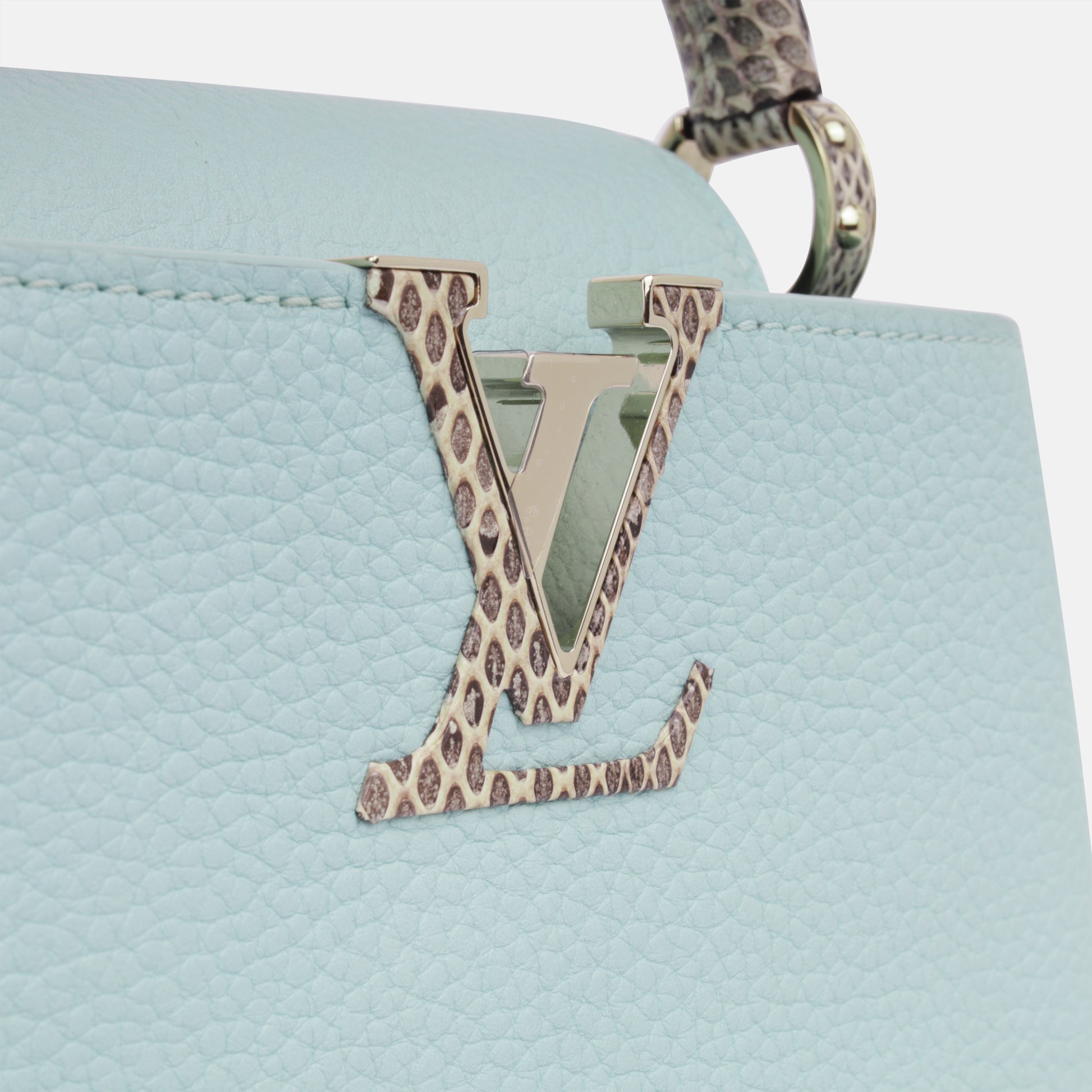 The Capucines BB by Louis Vuitton is the perfect city chic bag. With modern lines and bold statement colours, this will stand out from the crowd. The Capucines line takes its name from the Rue des Capucines in Paris, where Louis Vuitton opened his first store in 1854. Wear the flap on the outside to show the monogram flower, or tuck the flap into the top compartment to reveal the LV initials in stunning silver hardware.