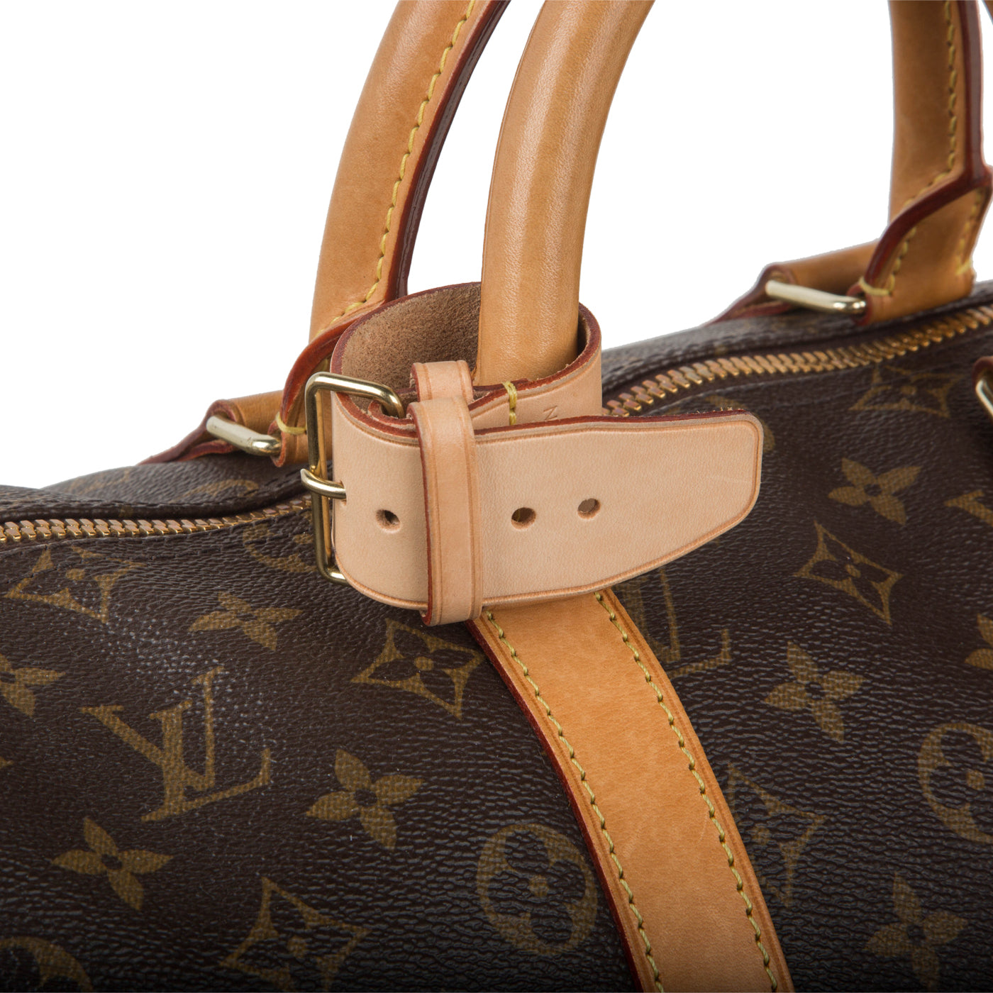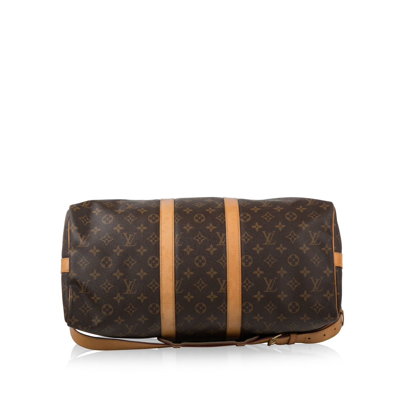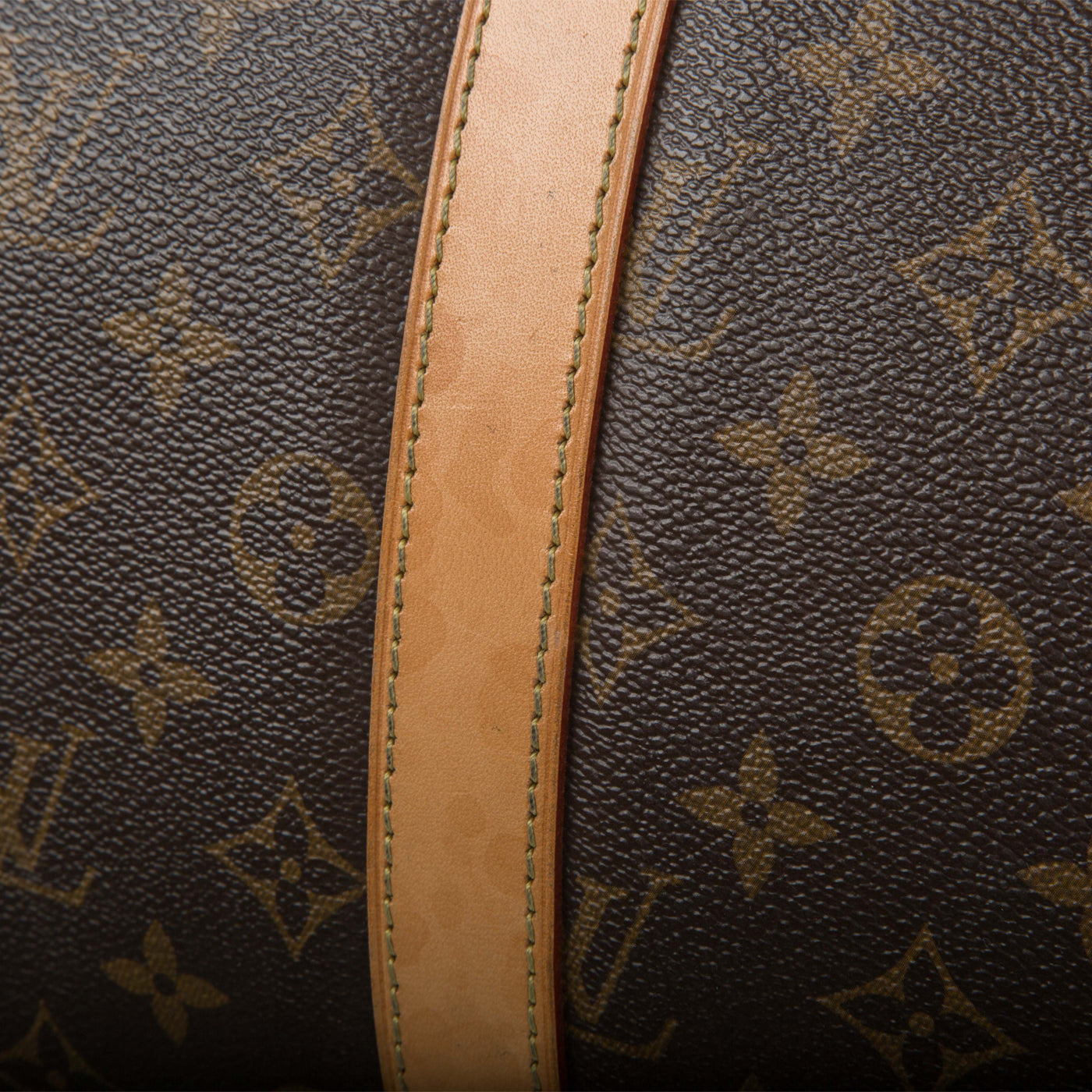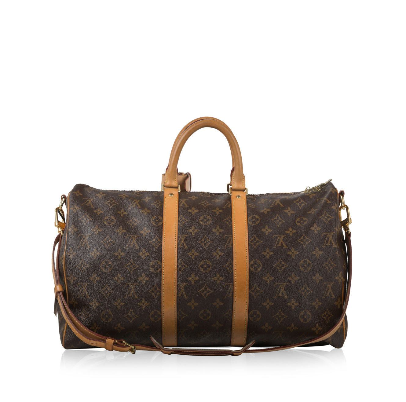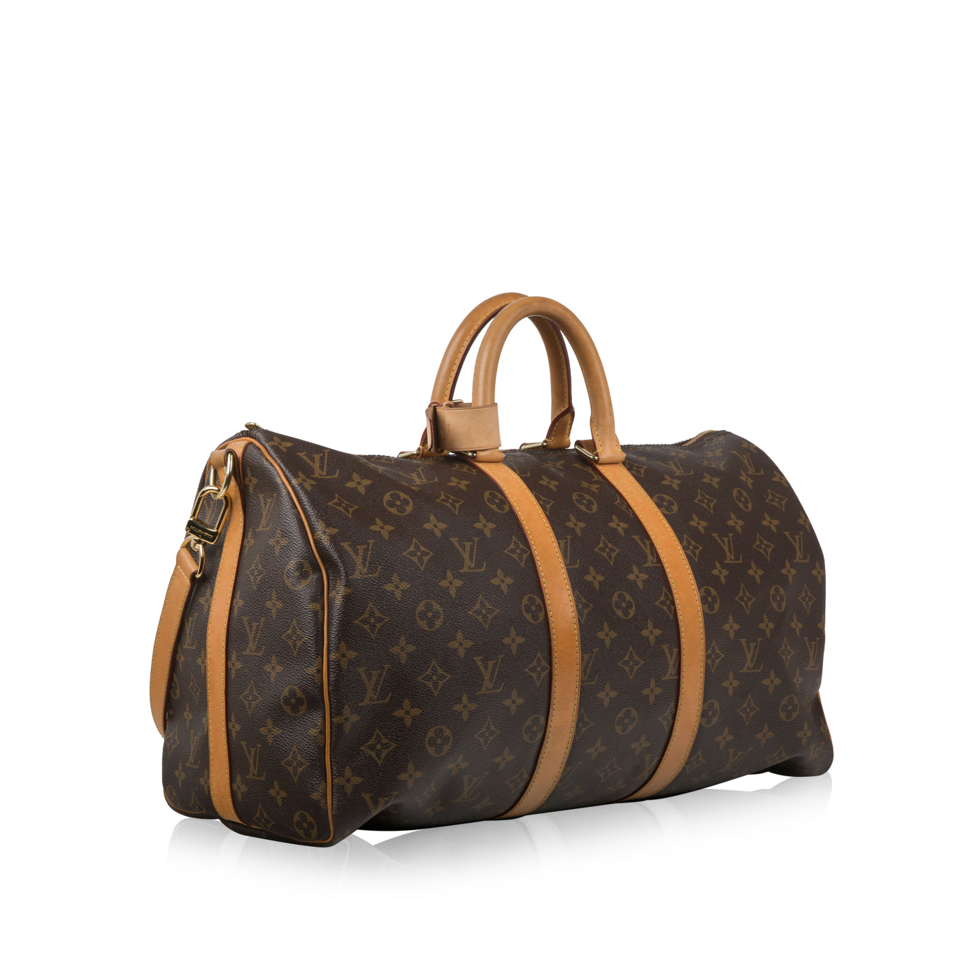 Louis Vuitton presents their signature Keepall bag, the perfect travel accessory for both men and women. Carefully crafted in the brand's iconic Monogram canvas with tan leather trimming, top handles and shoulder strap, the Keepall is sleek and sophisticated. Spacious enough to carry your whole world inside, but small enough to easily accompany you throughout your day, the Keepall is also extremely lightweight. It's the perfect travel companion and a necessary addition to any luxury bag collection, especially luggage. The perfect mix between fashion and function, it's practical as well as stylish. Wherever you go, the LV Keepall will make sure you travel in style.