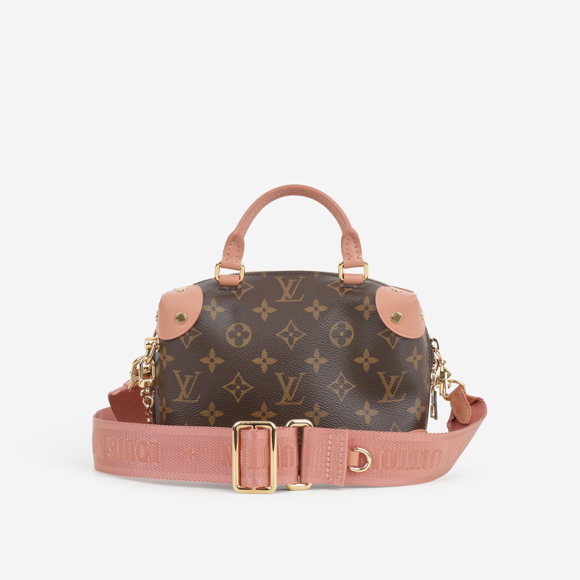 The Louis Vuitton Petite Malle Souple Monogram with Peach Trim & Gold Hardware is a chic, contemporary twist on one of Louis Vuitton’s most iconic designs. Crafted from the brand’s signature Monogram coated canvas, this petite trunk-inspired bag is accented with soft peach leather trim, giving it a playful yet elegant finish.
