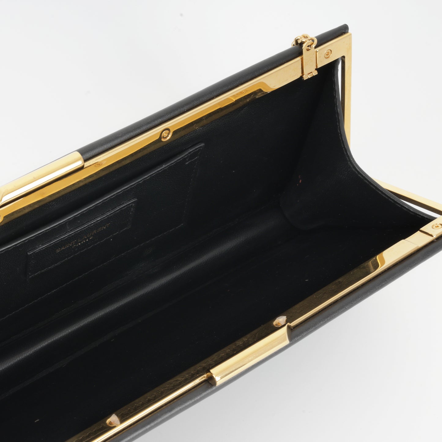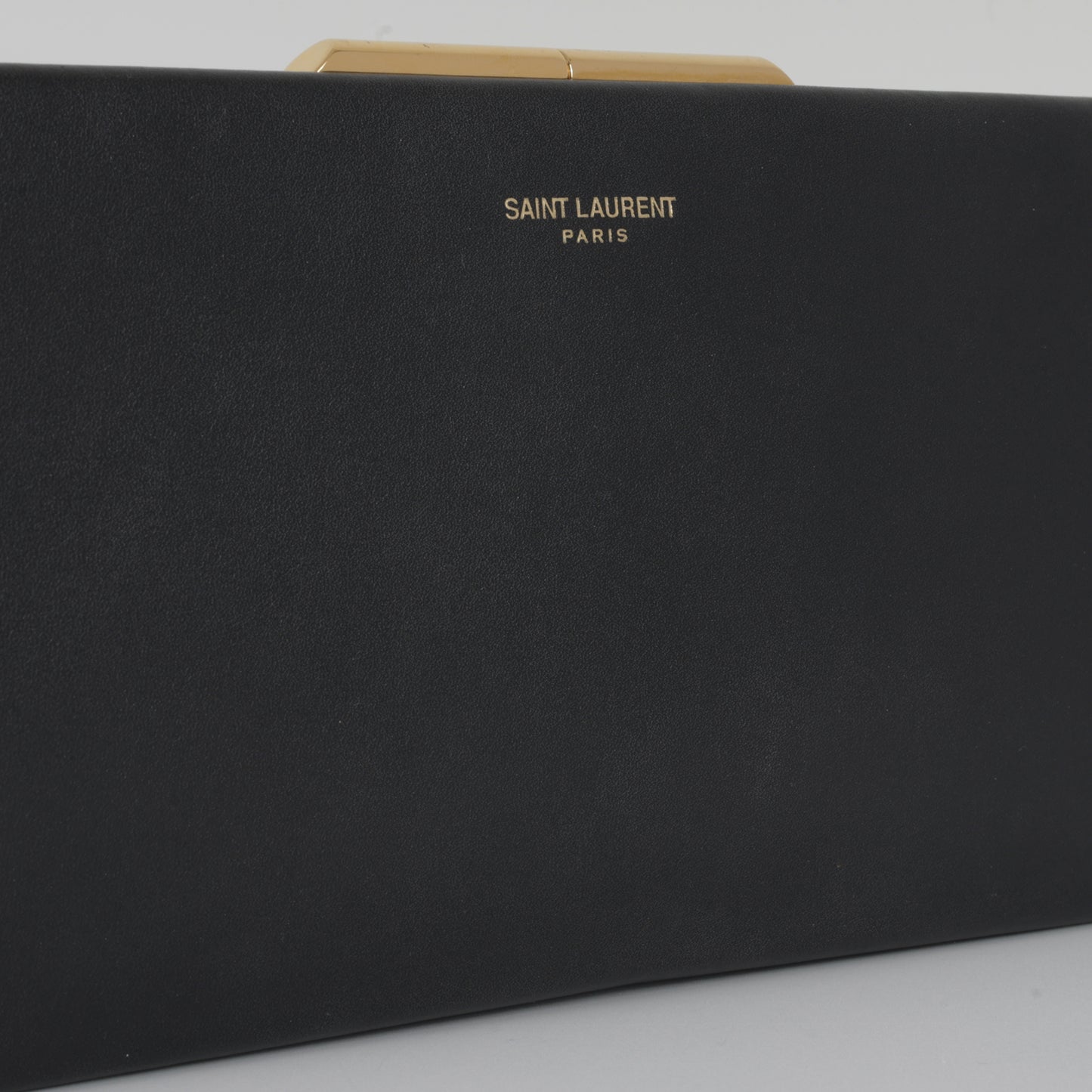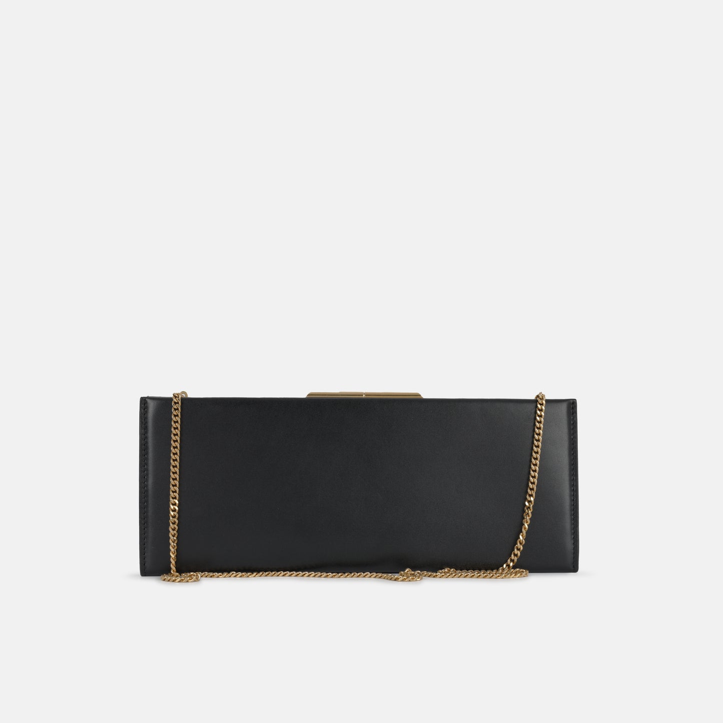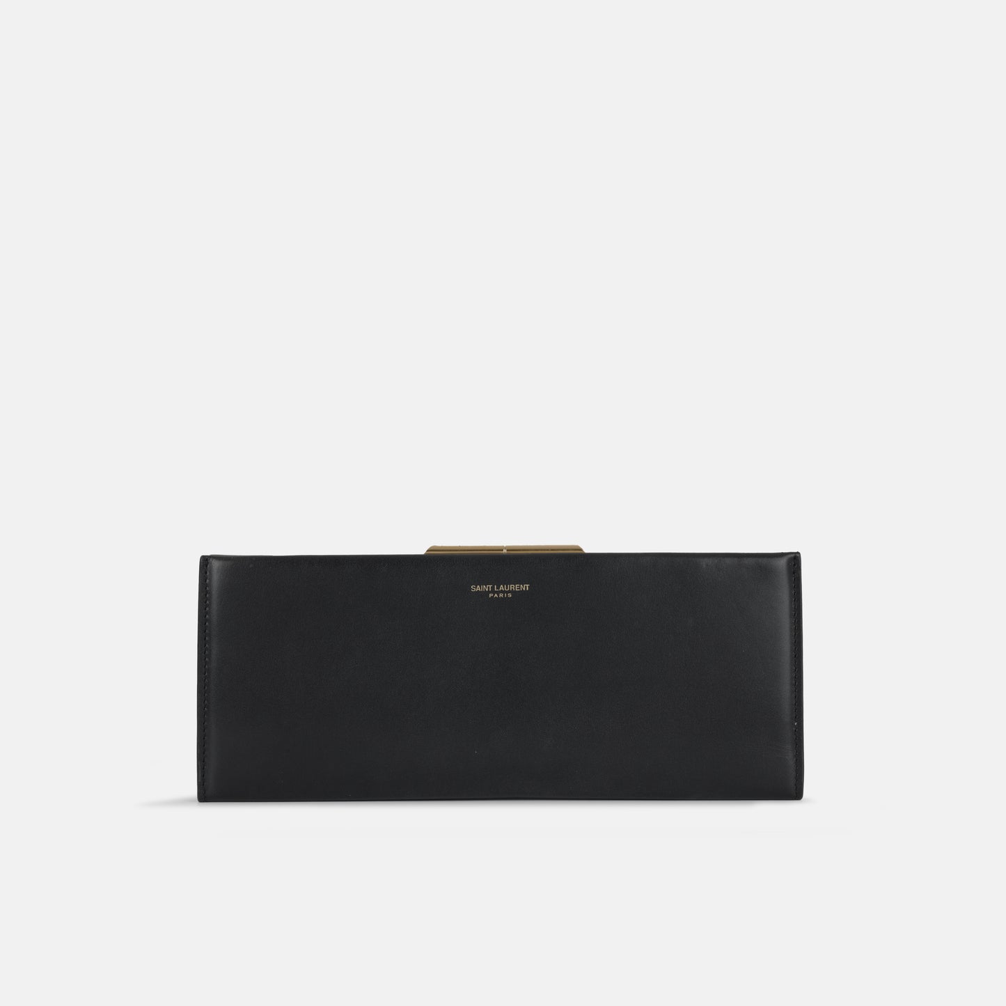 The Midnight clutch is a sleek, sophisticated accessory designed for the modern minimalist. Its slim profile and metal snap closure provide a refined, streamlined look, while the embossed Saint Laurent Paris signature on the front adds a touch of iconic elegance.