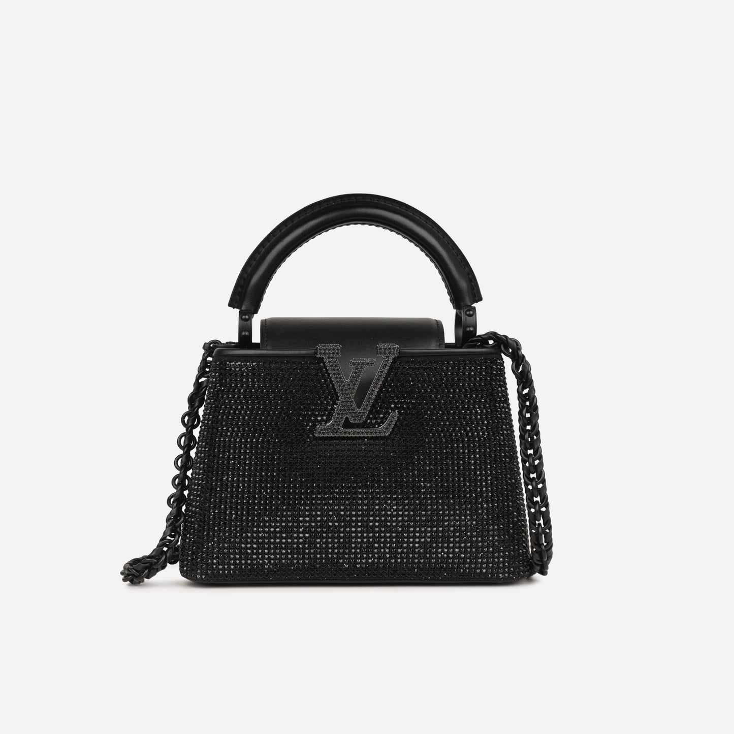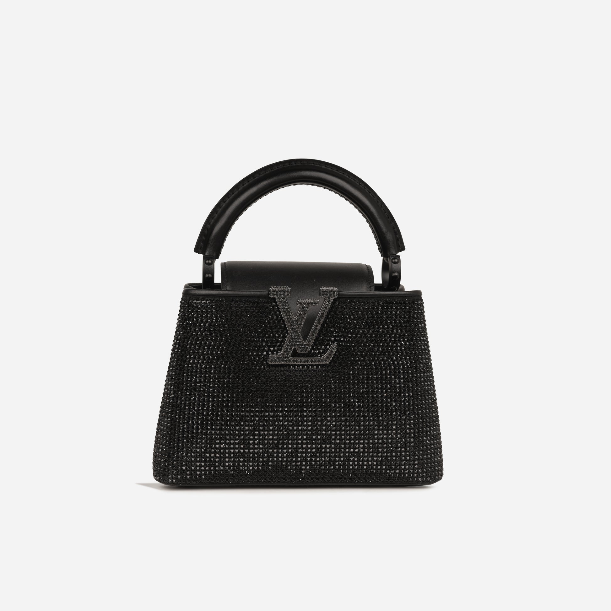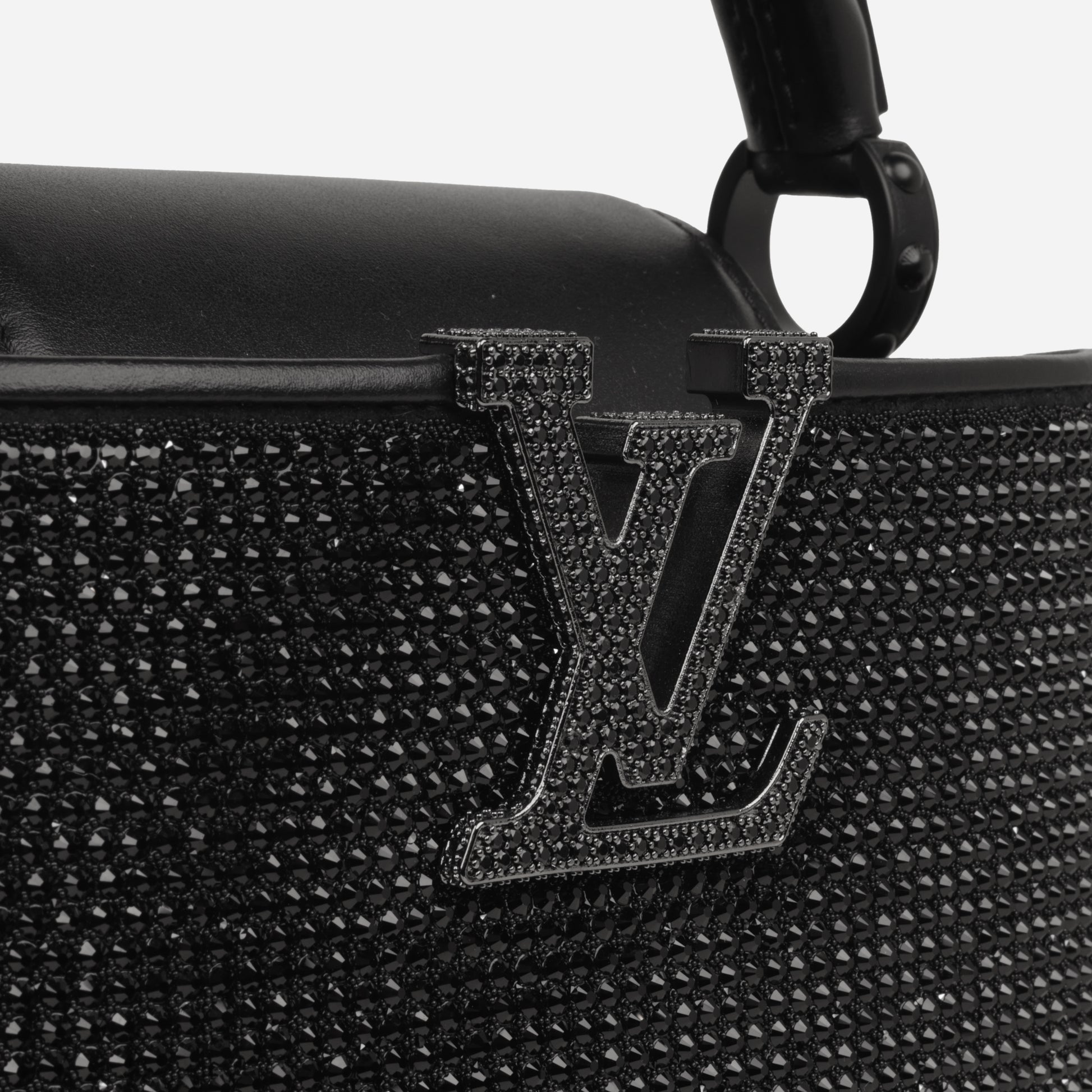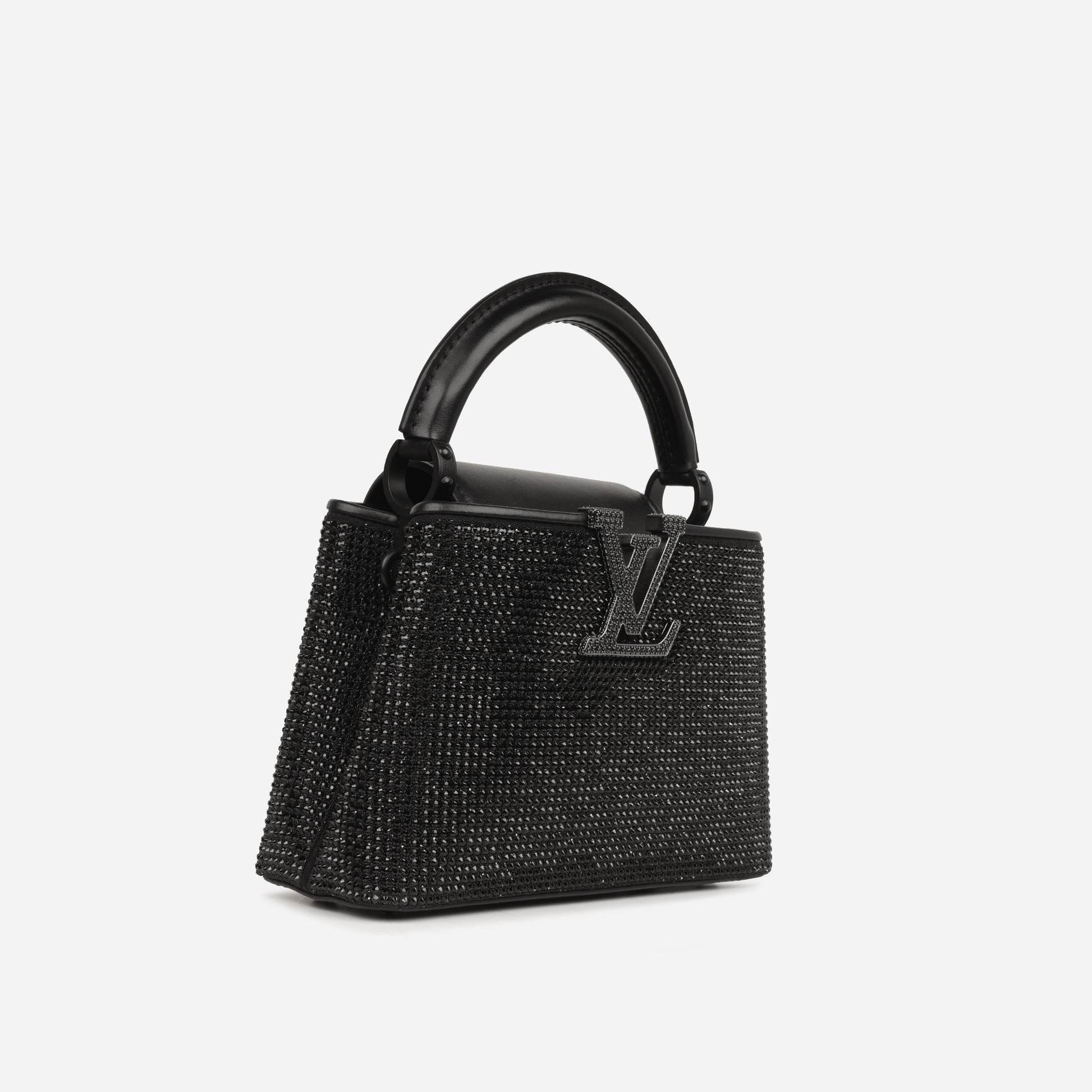Introducing the Capucines Mini bag, a true work of art that embodies luxury and elegance. This exquisite piece features a body and LV Initials adorned entirely with Swarovski crystals, reminiscent of a twinkling night sky.