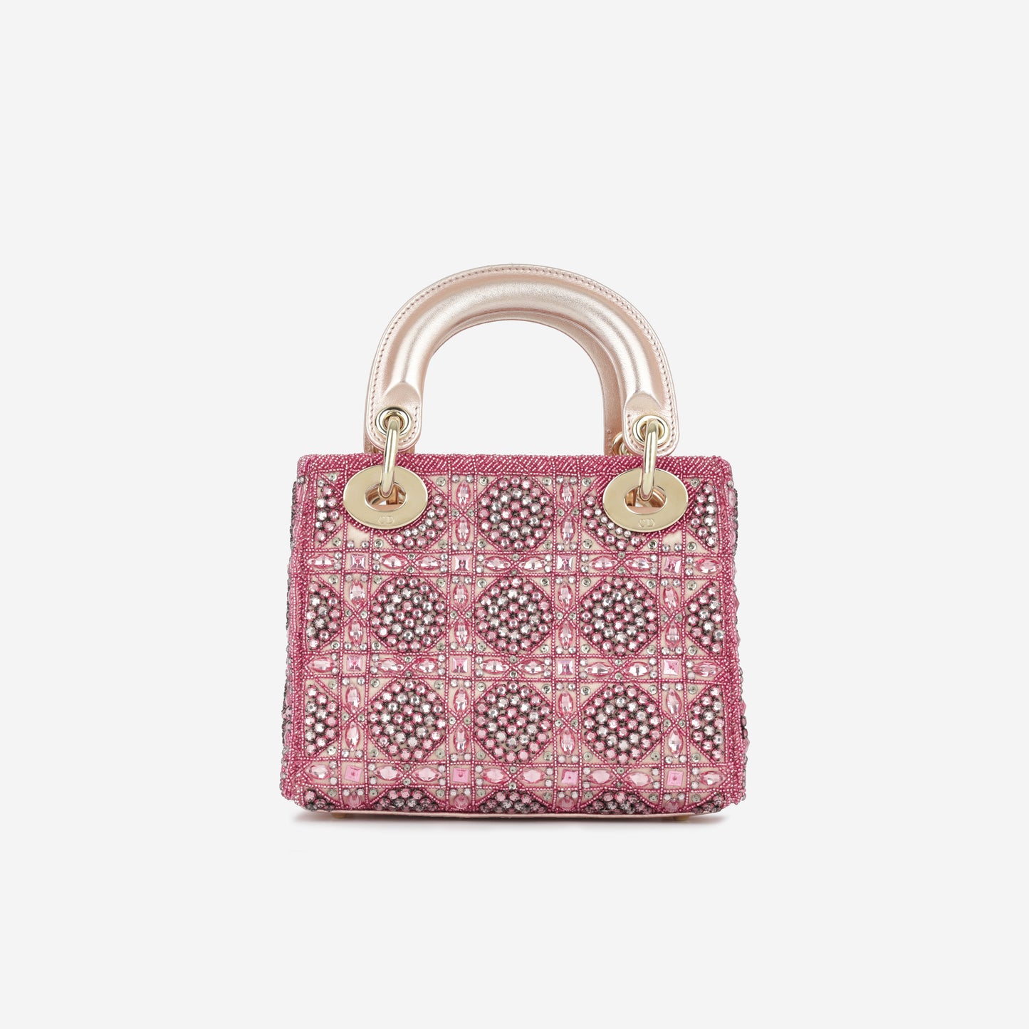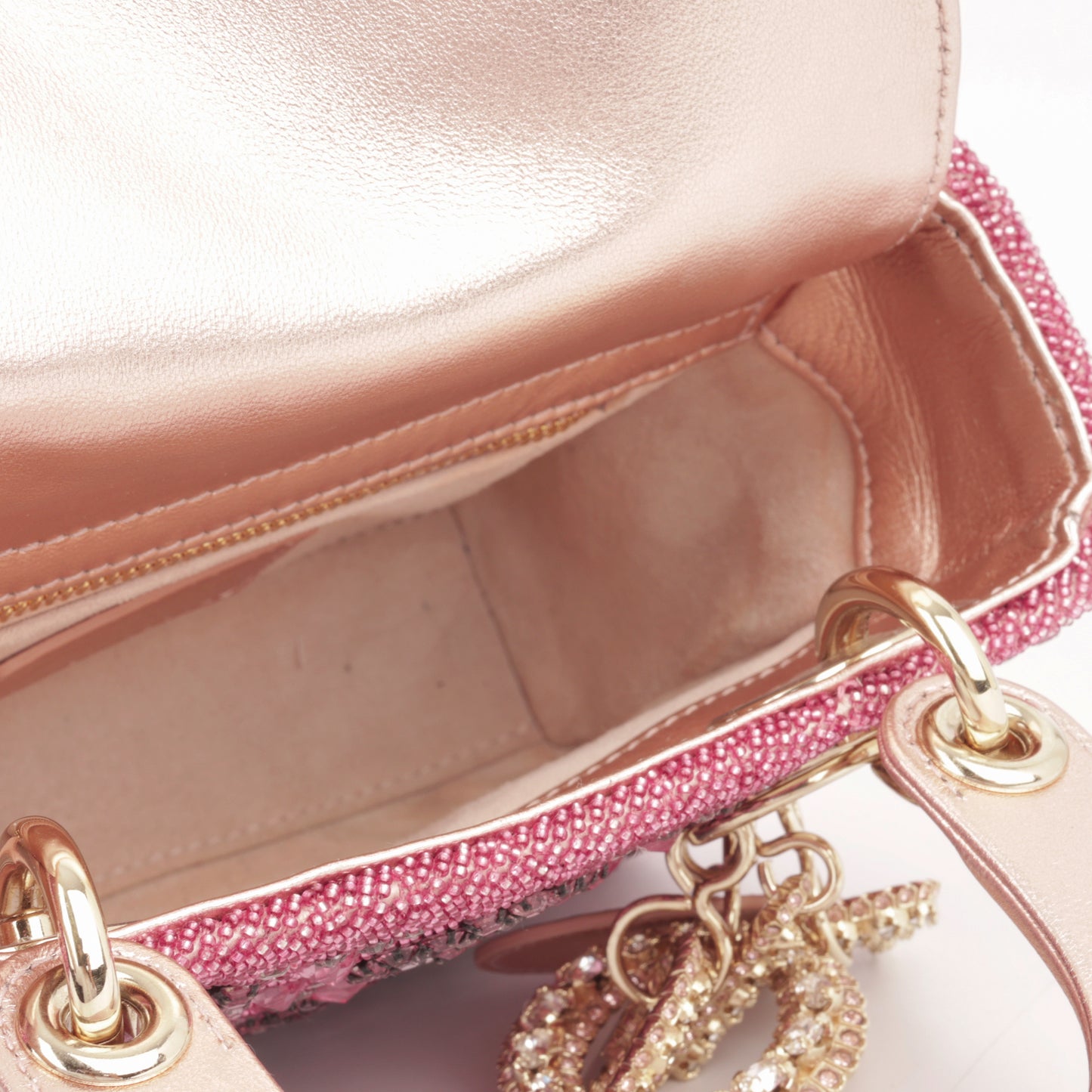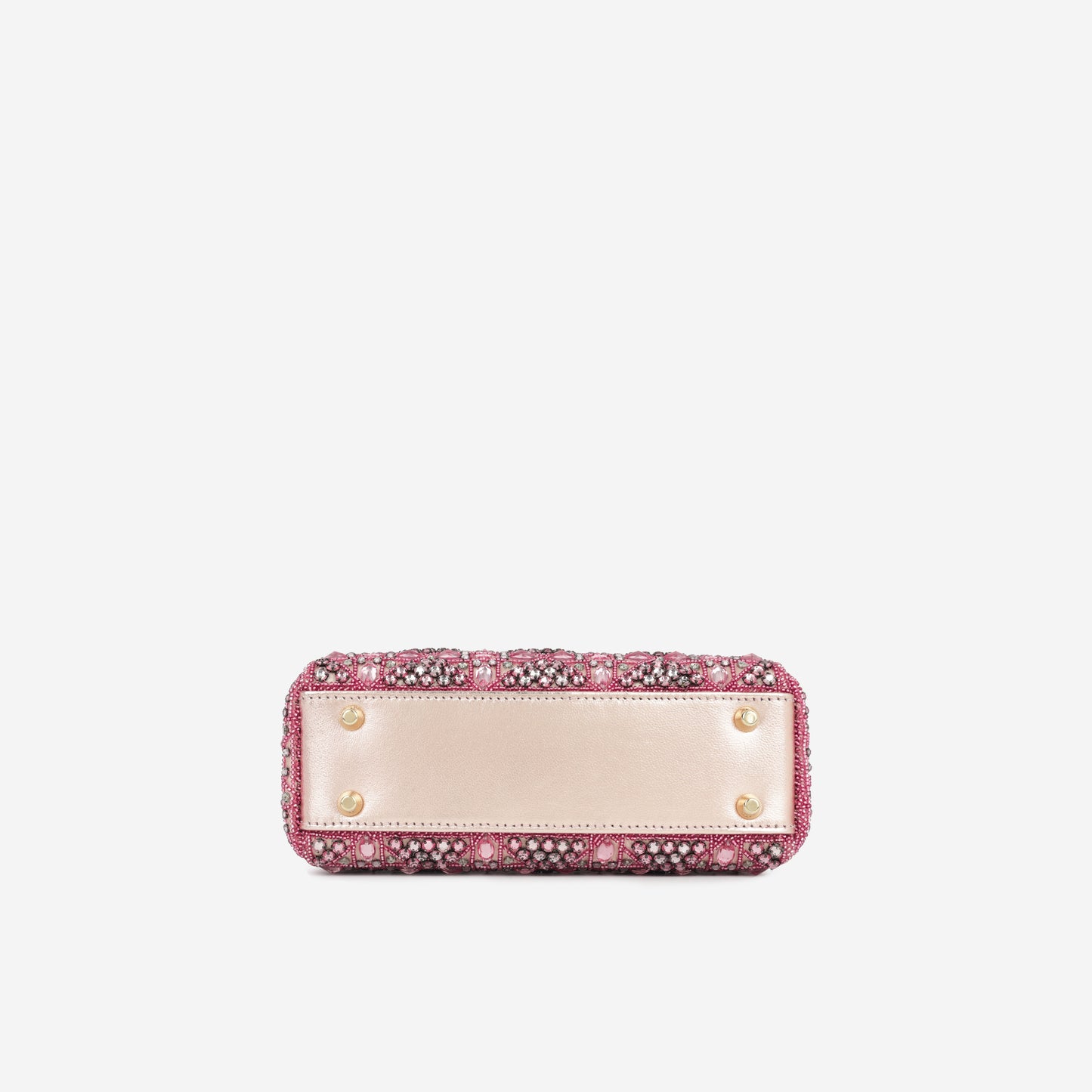 Introducing the Mini Lady Dior, a captivating masterpiece crafted from pink crystal beading. This enchanting piece is adorned with shimmering beads that dance like stars in the night sky, creating a mesmerising effect. Paired with luxurious champagne gold-tone hardware and as well as rose gold leather trims, it exudes elegance and sophistication. Elevate your look with this celestial beauty.