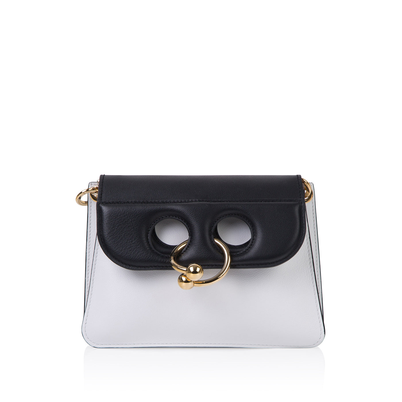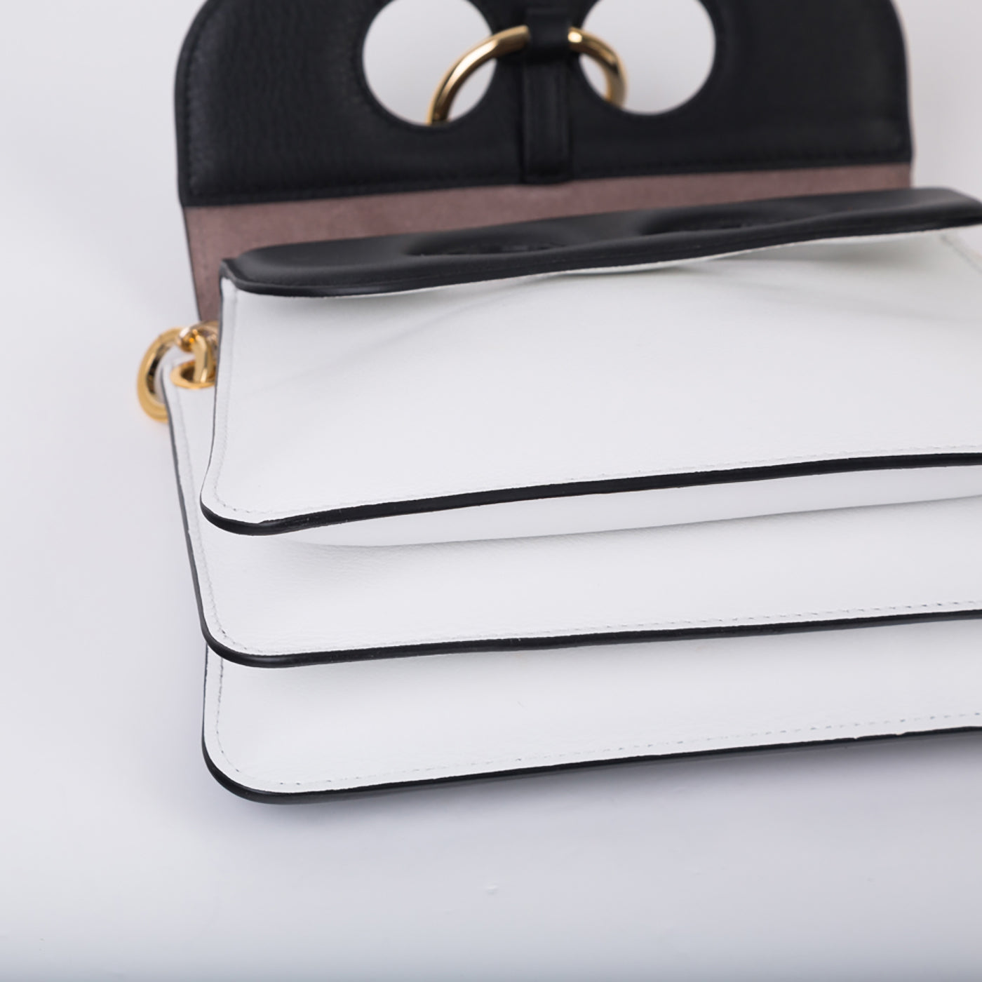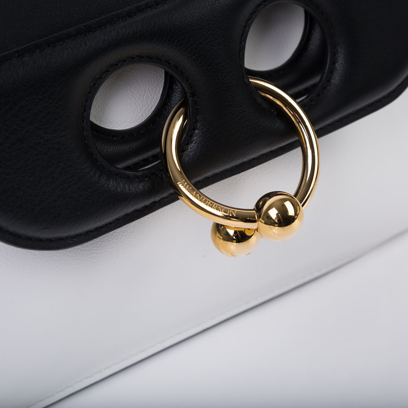 JW Anderson presents their infamous Mini Pierce bag in two-toned, black and white leather. An acclaimed piece from the brand, the Pierce features its iconic gold, ring barbell along with its classic gold hardware and chain strap. With its unique and original design, the Pierce is ideal for any young woman living in the modern world with a fashion forward sense of style. carry all your tiny, daily inside the small compartment while remaining sleek and stylish. Seen on it-girls, celebrities, and social media influencers, the Pierce bag is definitely a must-have.