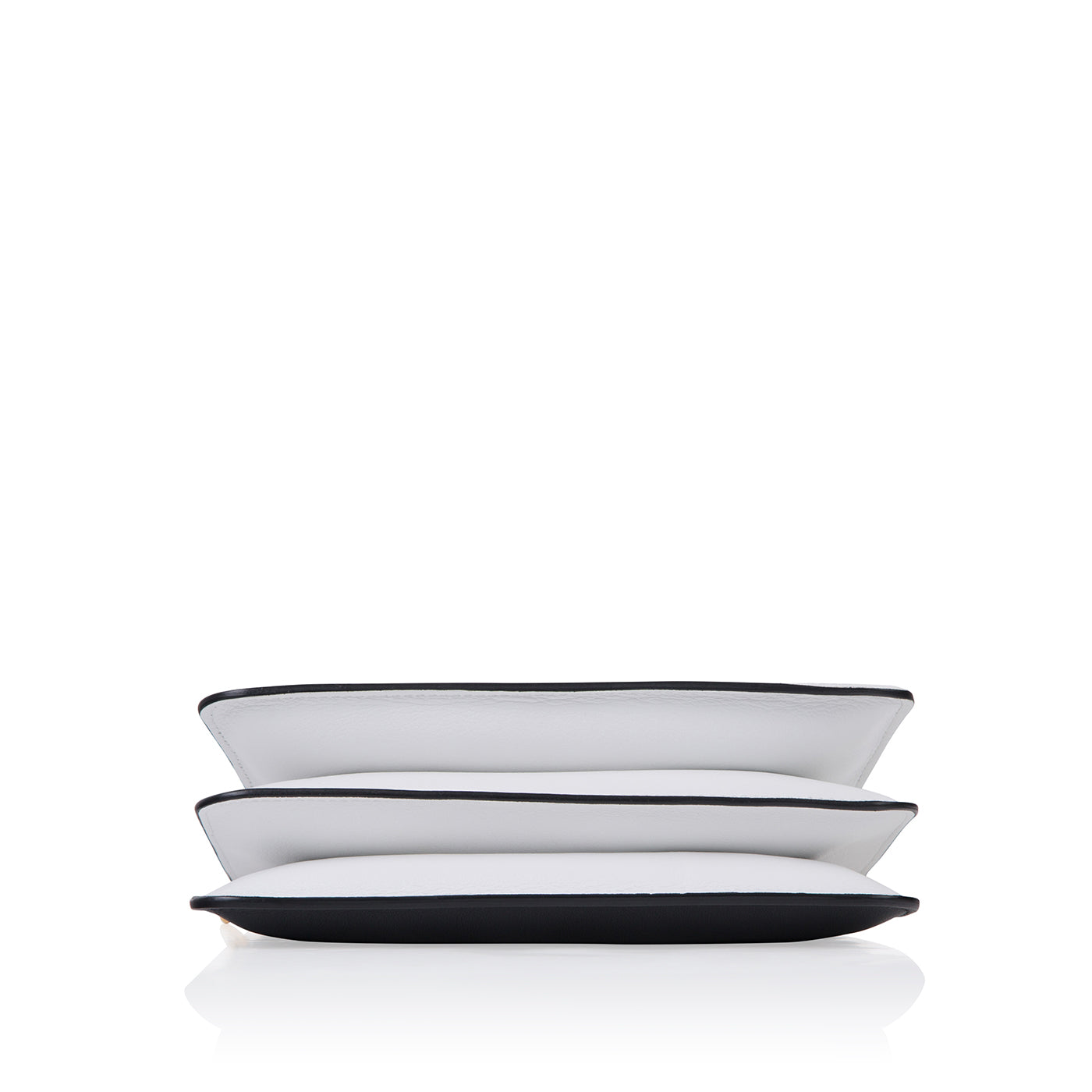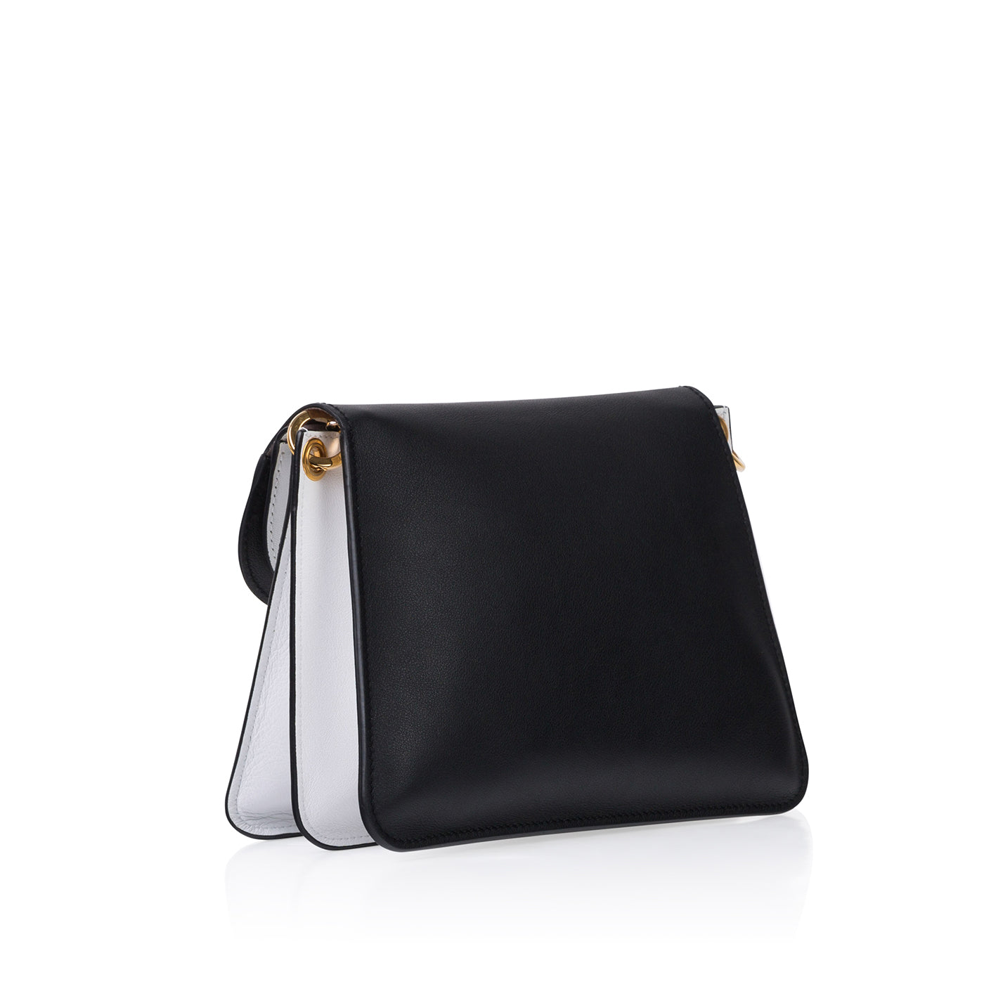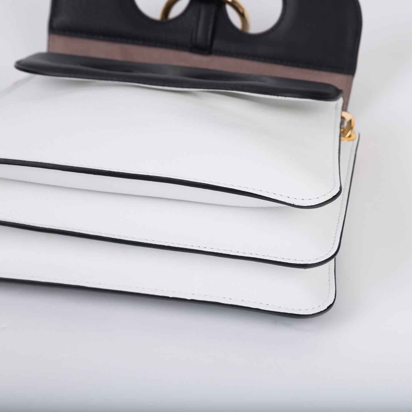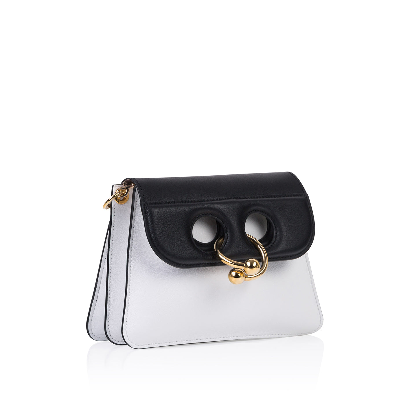 JW Anderson presents their infamous Mini Pierce bag in two-toned, black and white leather. An acclaimed piece from the brand, the Pierce features its iconic gold, ring barbell along with its classic gold hardware and chain strap. With its unique and original design, the Pierce is ideal for any young woman living in the modern world with a fashion forward sense of style. carry all your tiny, daily inside the small compartment while remaining sleek and stylish. Seen on it-girls, celebrities, and social media influencers, the Pierce bag is definitely a must-have.