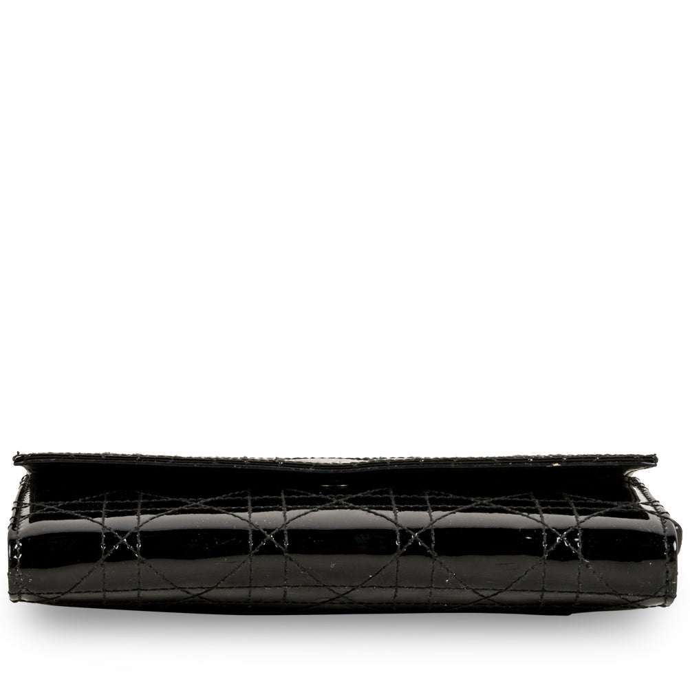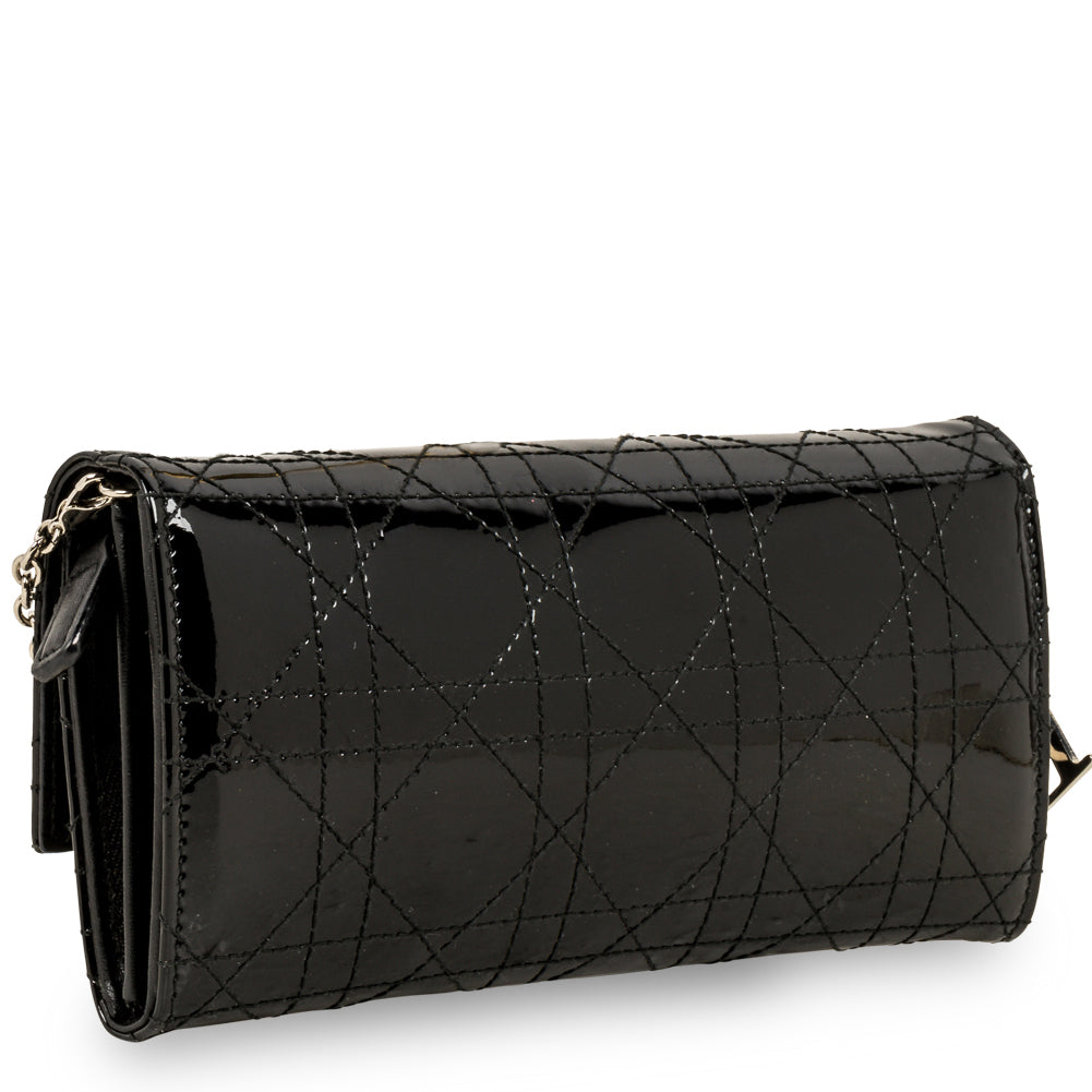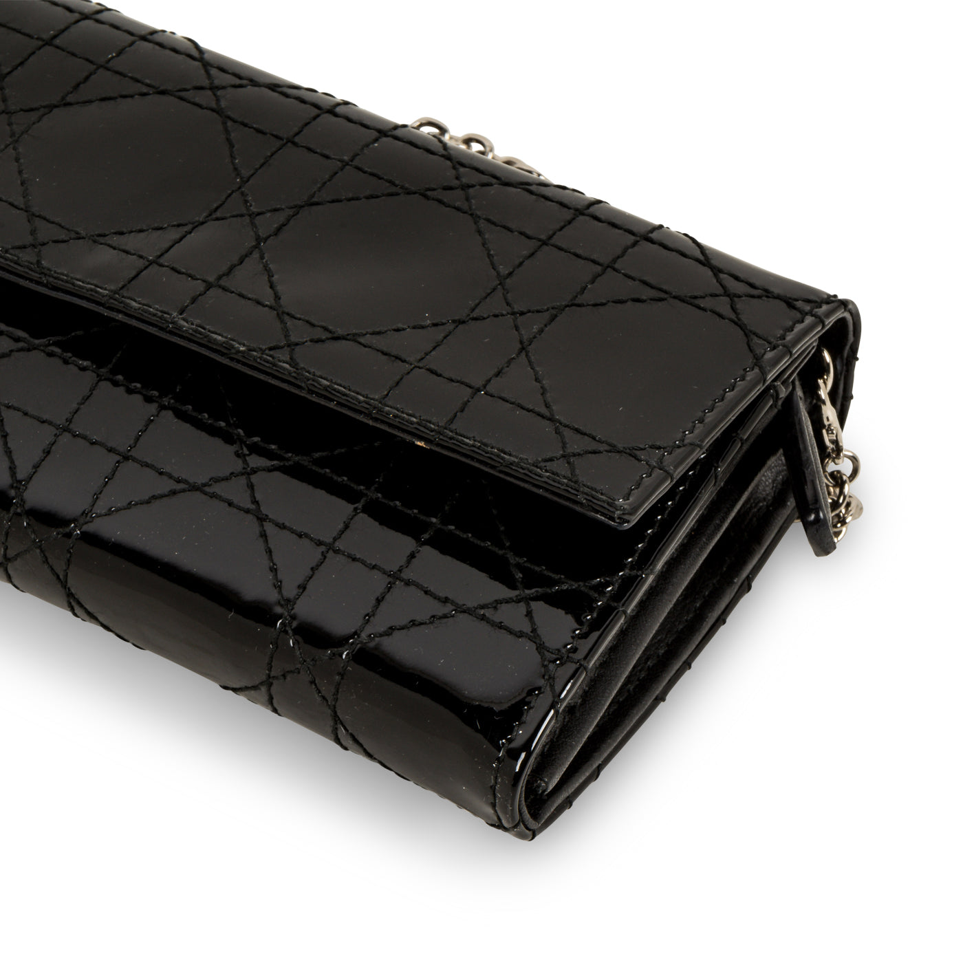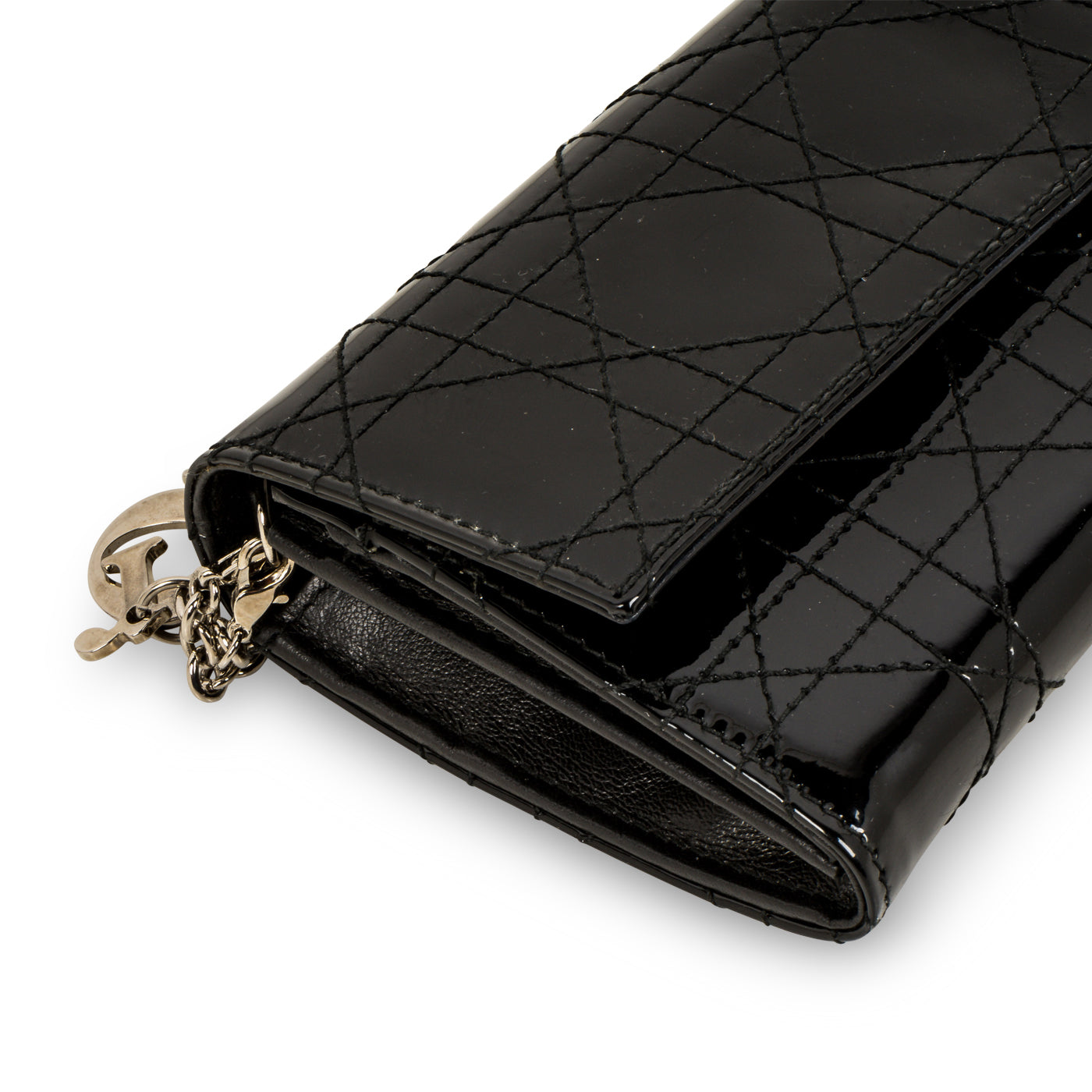 The Lady Dior rectangular clutch is a mini clone of the Lady Dior handbag, from its cannage quilted patent leather to its tone to tone stitching and its standout charm lettering. The clutch is presented in a stunning shiny black which is further accented by the patent leather. The magnificent cannage stitching is said to be inspired by the rattan style Napoleon III style and the clutch’s tone to tone stitching serves only to reinforce the bag’s sophisticated tone, alongside its removable chain. The D.I.O.R charm letters with their distinctive larger O, hang from the handle are galvanised to maintain the bag’s femininity. The Lady Dior clutch is ideal for the femme-fatale who embraces the night.