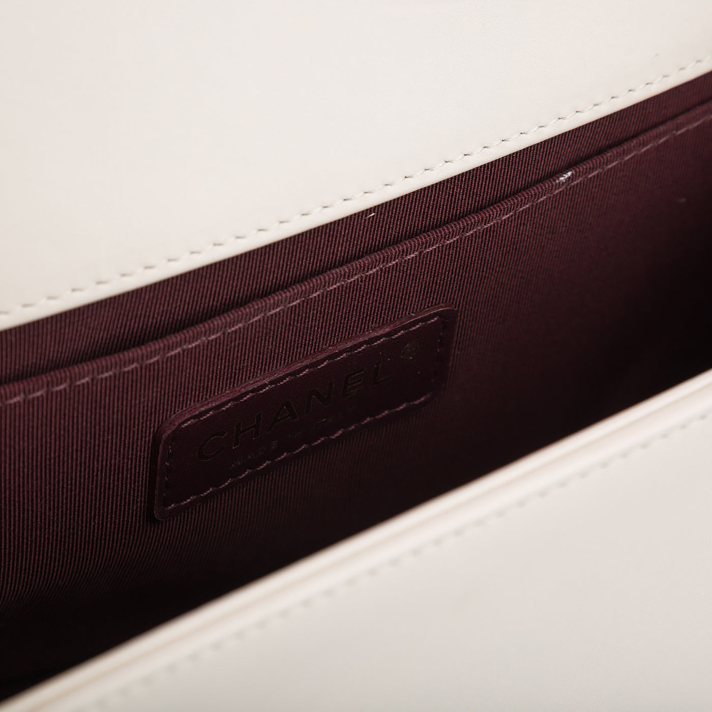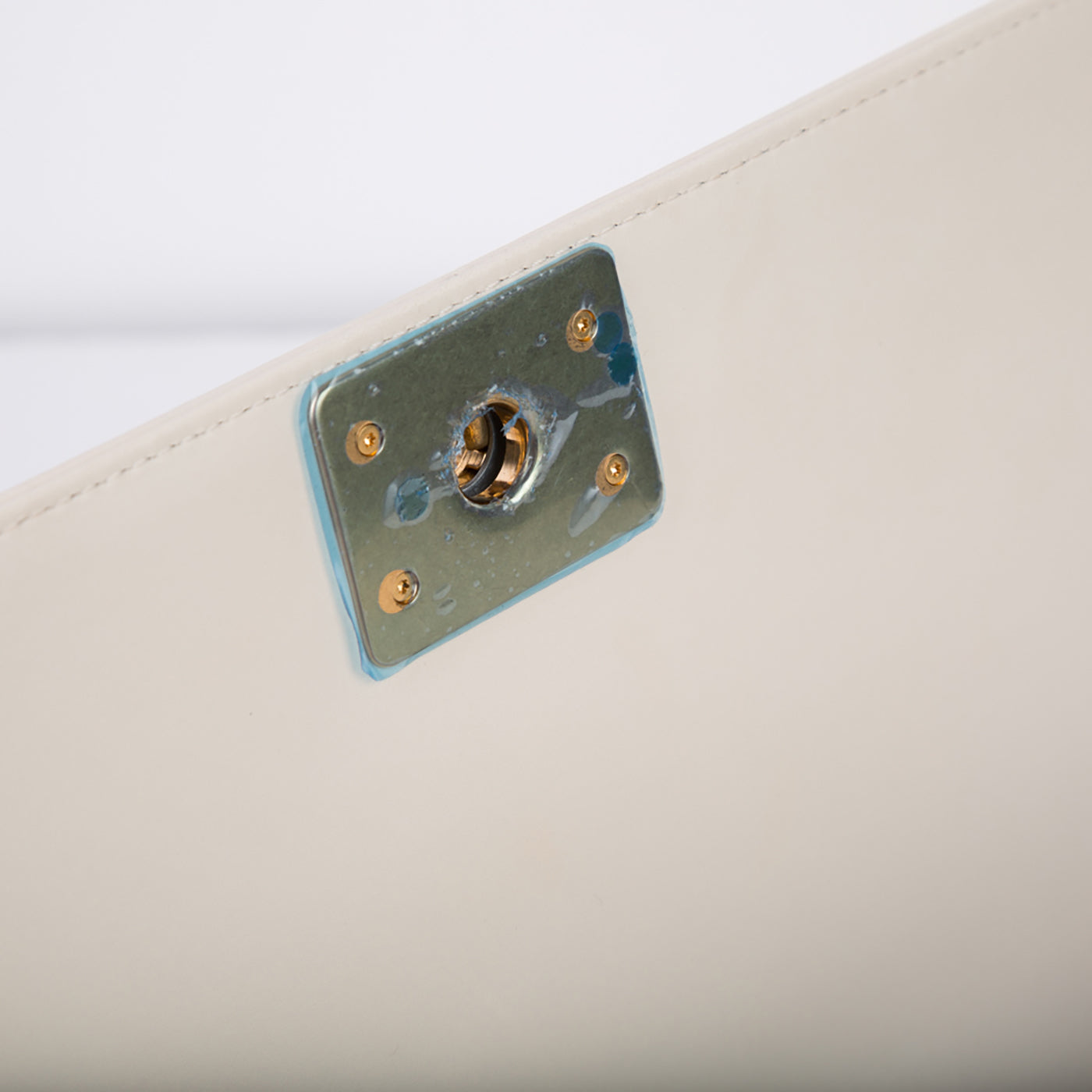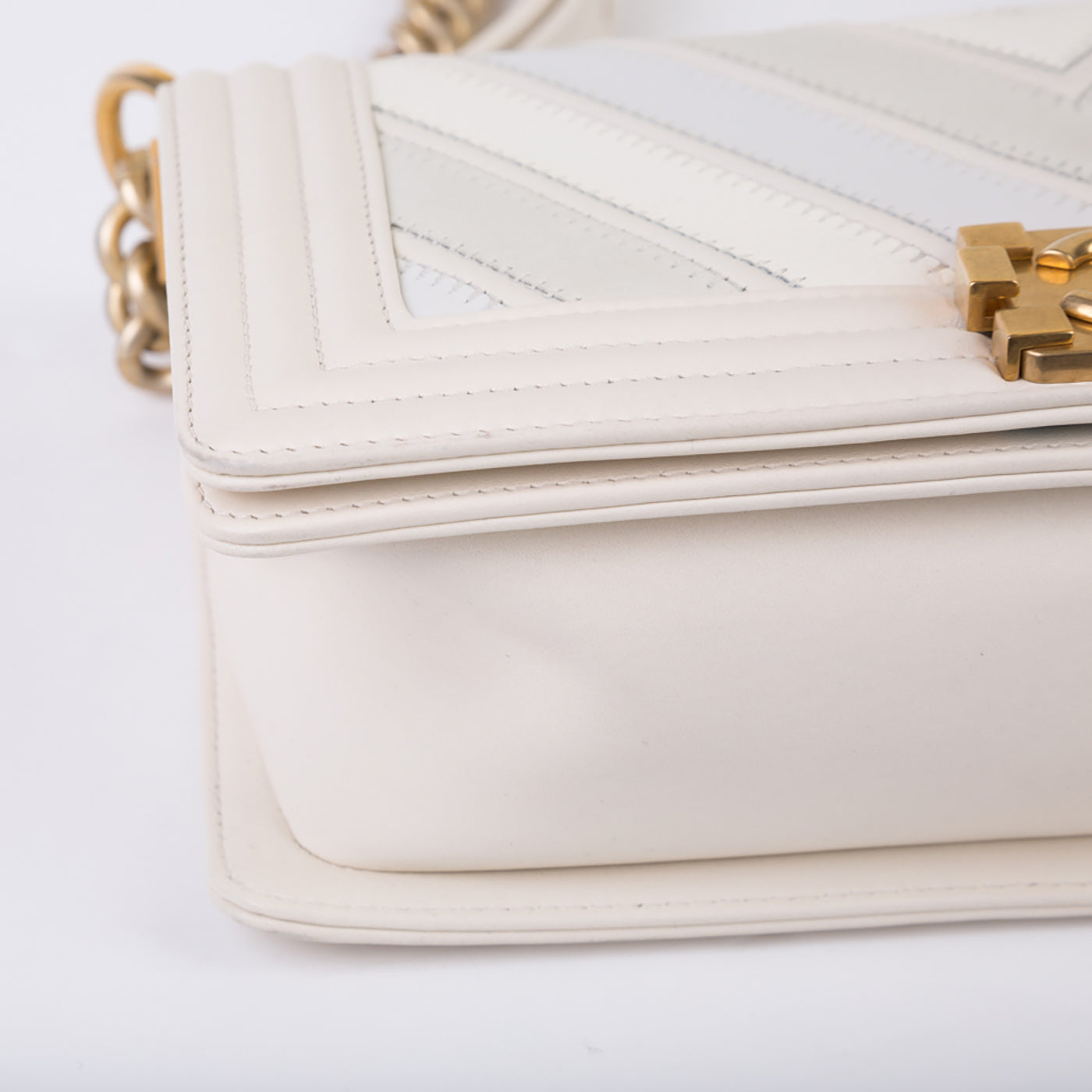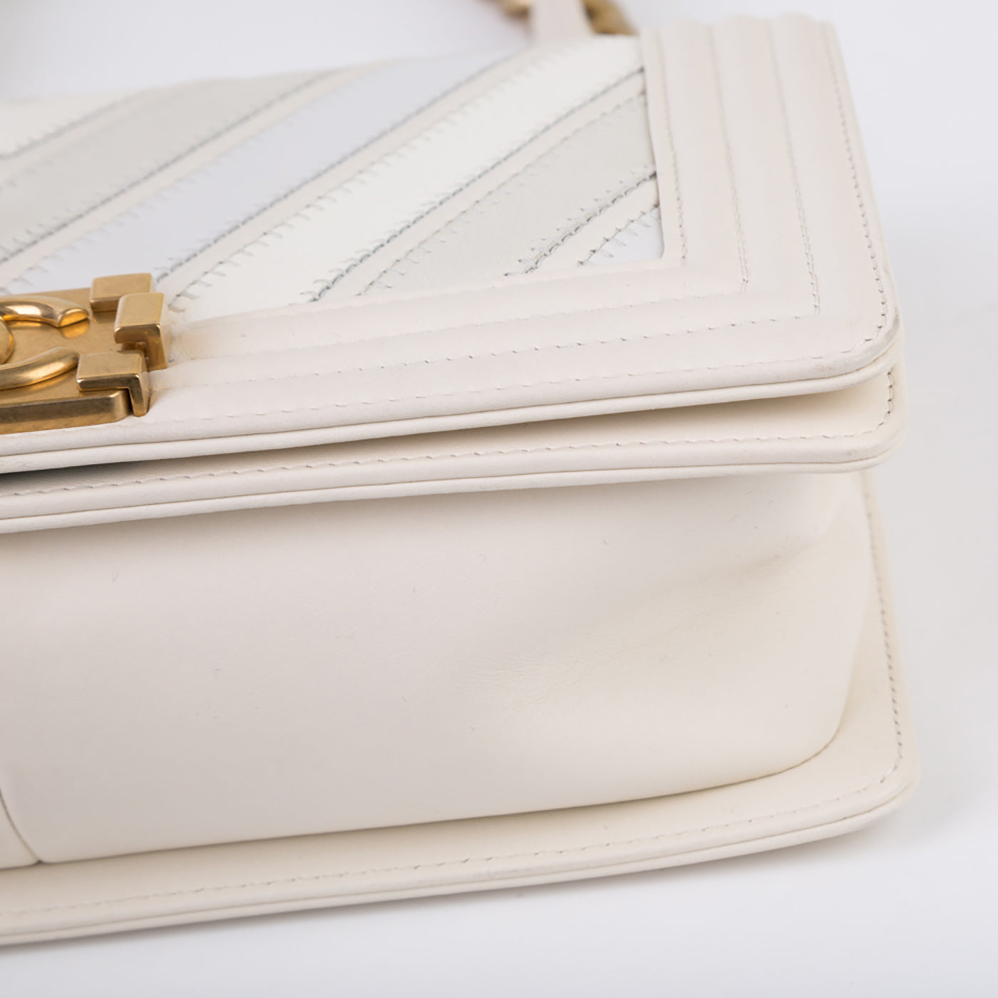 From their Spring / Summer 2016 collection, Chanel presented this unique Boy bag, crafted from multiple leathers in a stunning chevron design with gold-tone hardware. This seasonal piece is the ideal investment for any woman with a love for luxury and a soft spot for Chanel. With hints of light blues, light greys, and true whites in the chevron detailing, this mostly off-white coloured bag is the perfect compliment to any neutral-toned outfit. The Boy bag is a signature piece from Chanel that will never go out of style, this unique twist on a classic bag makes this signature piece a true collector's item that belongs in any luxury lover's wardrobe.