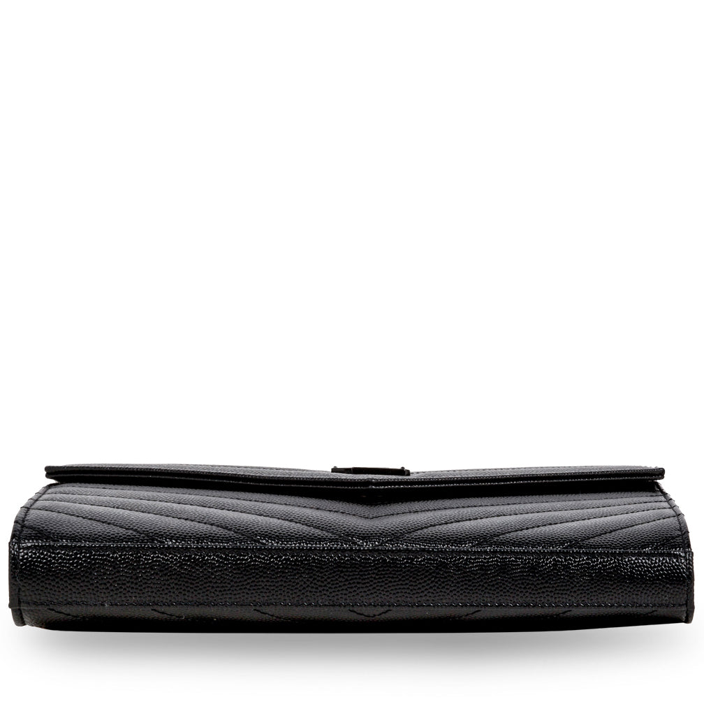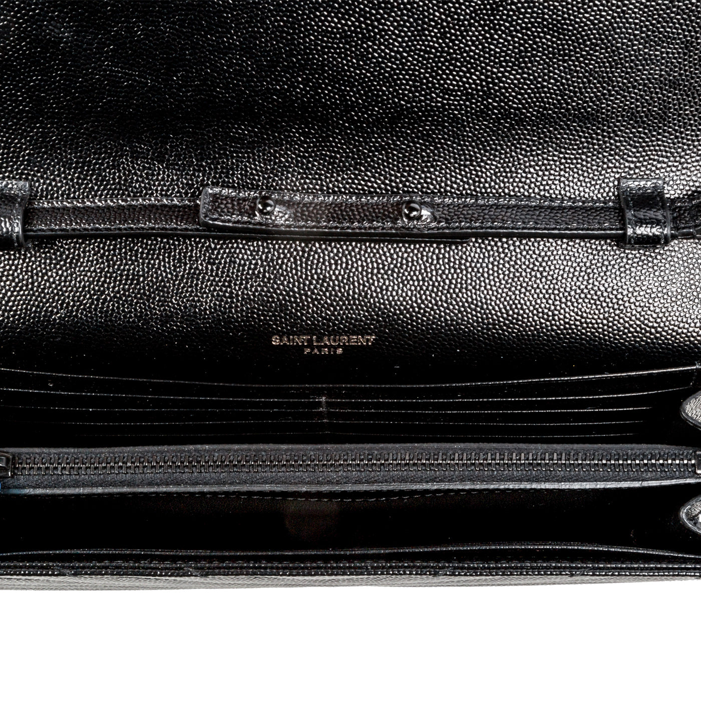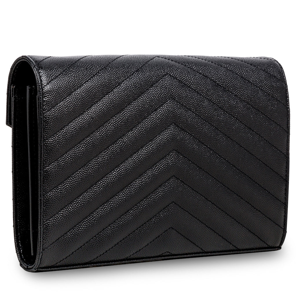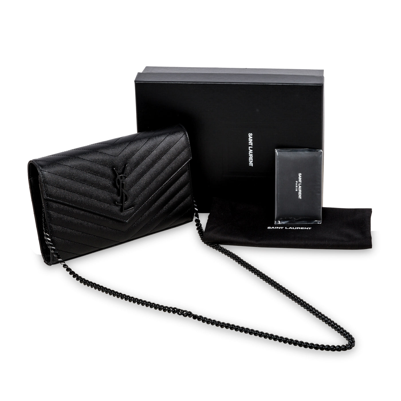 Why carry a wallet inside a bag when you could just wear your wallet and be practical, handsfree, AND stylish? The Saint Laurent wallet on chain is the perfect, easy bag for a dressy night out or a casual day piece. Featuring its iconic YSL logo in black hardware, this bag is the ideal choice for a chic woman with a love for luxury. With its discreet black on black combination, you can be sure to make a statement whilst remaining subtly chic by adding this bag as a statement piece to a neutral toned outfit. This bag is truly a must-have piece and a worthy addition to any handbag collection.