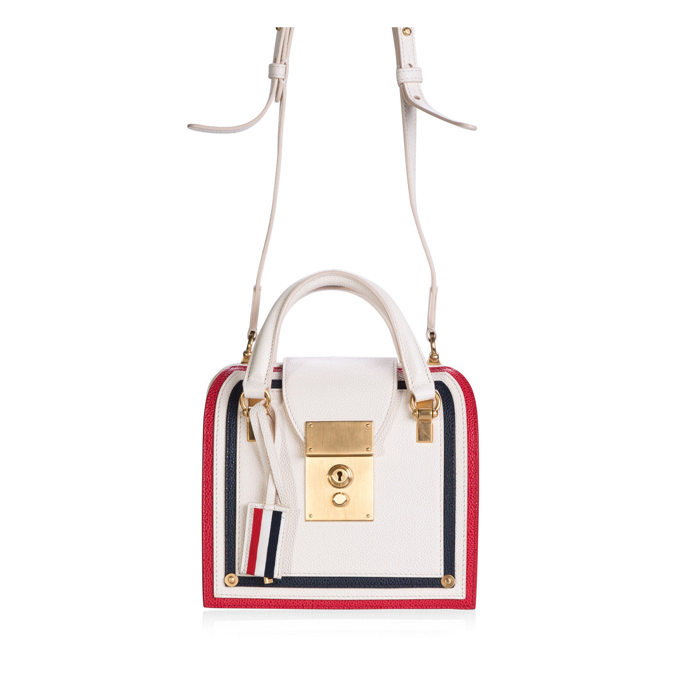 Old-word charm for the Mrs, the beautifully constructed pebbled calf skin mini tote by Thom Browne. Adorned detailing in the brand’s signature red, white and blue stripes. Versatile styling that can either be carried as a handheld or worn on the shoulder with its adjustable sleek strap.
