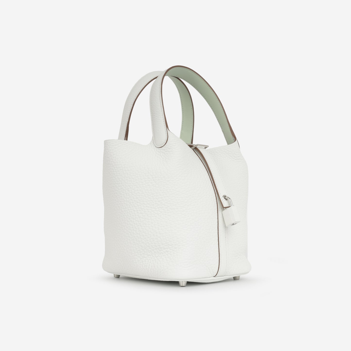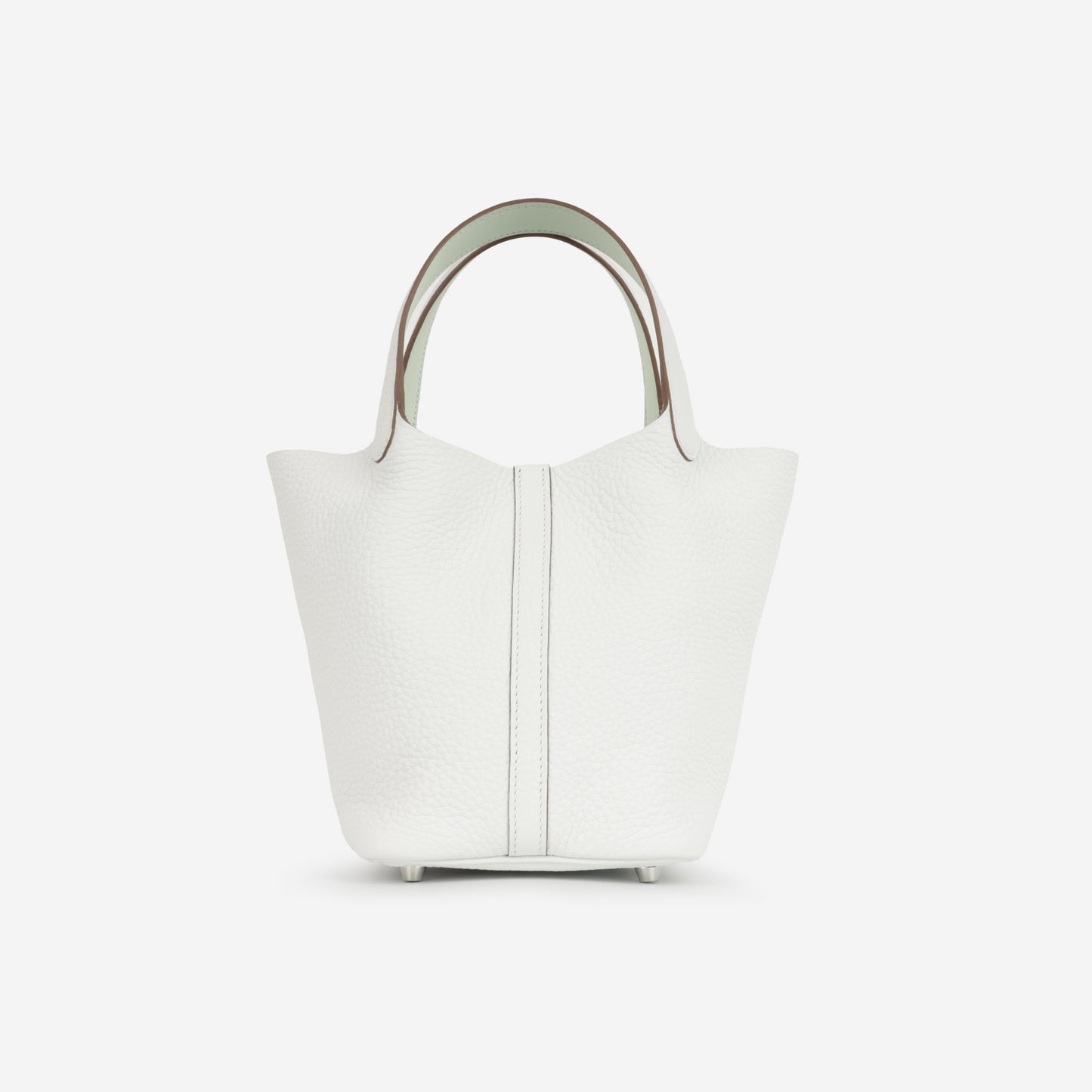 Carefully crafted from supple, Clemence leather, Hermès presents their stunning mini Picotin 18 bag in a beautiful combination of Clemence leather and complimented with palladium hardware. Hermès is acclaimed for their leather quality, as well as being at the very top of the fashion hierarchy. Simple, elegant, and understated, each Hermès bag is timeless and tasteful.