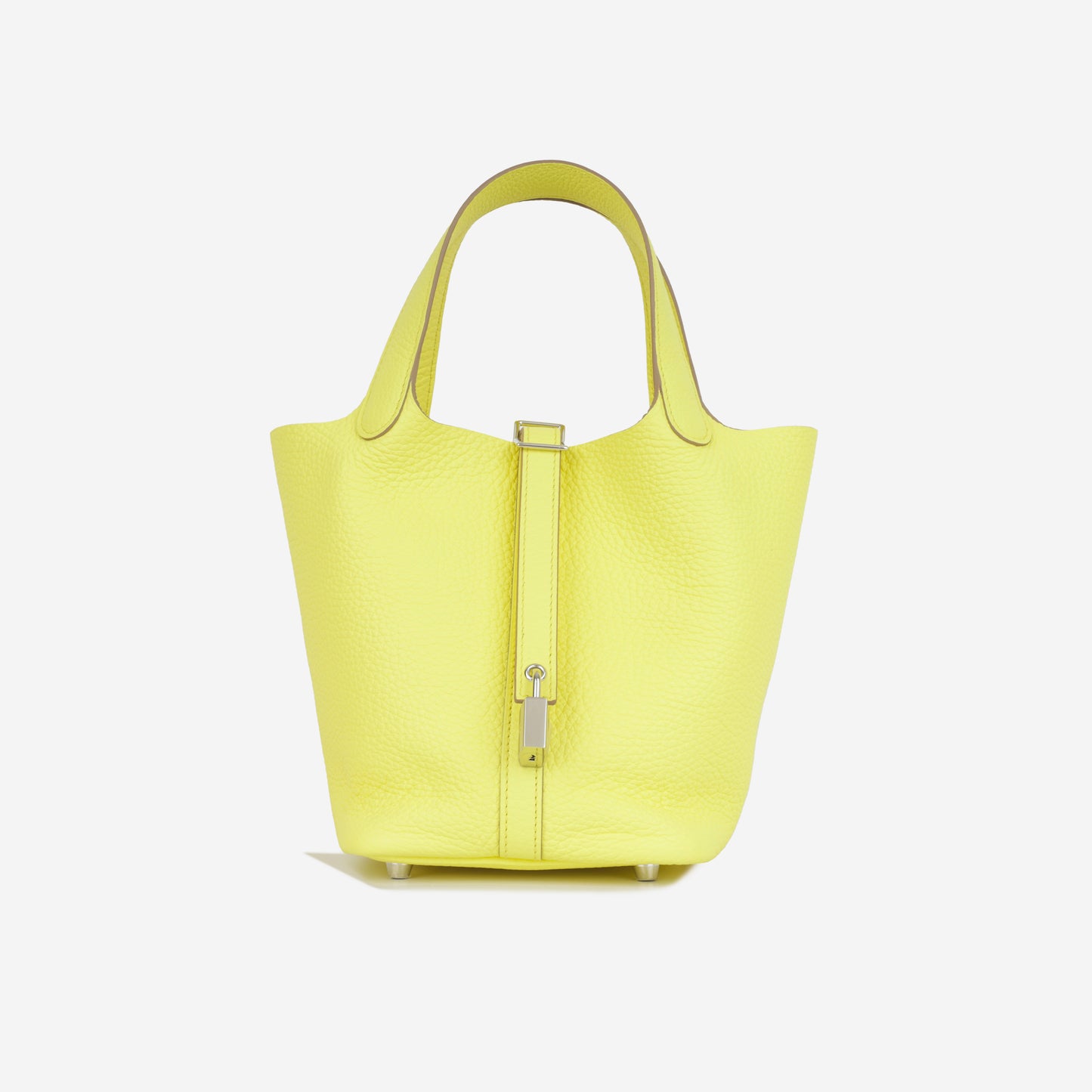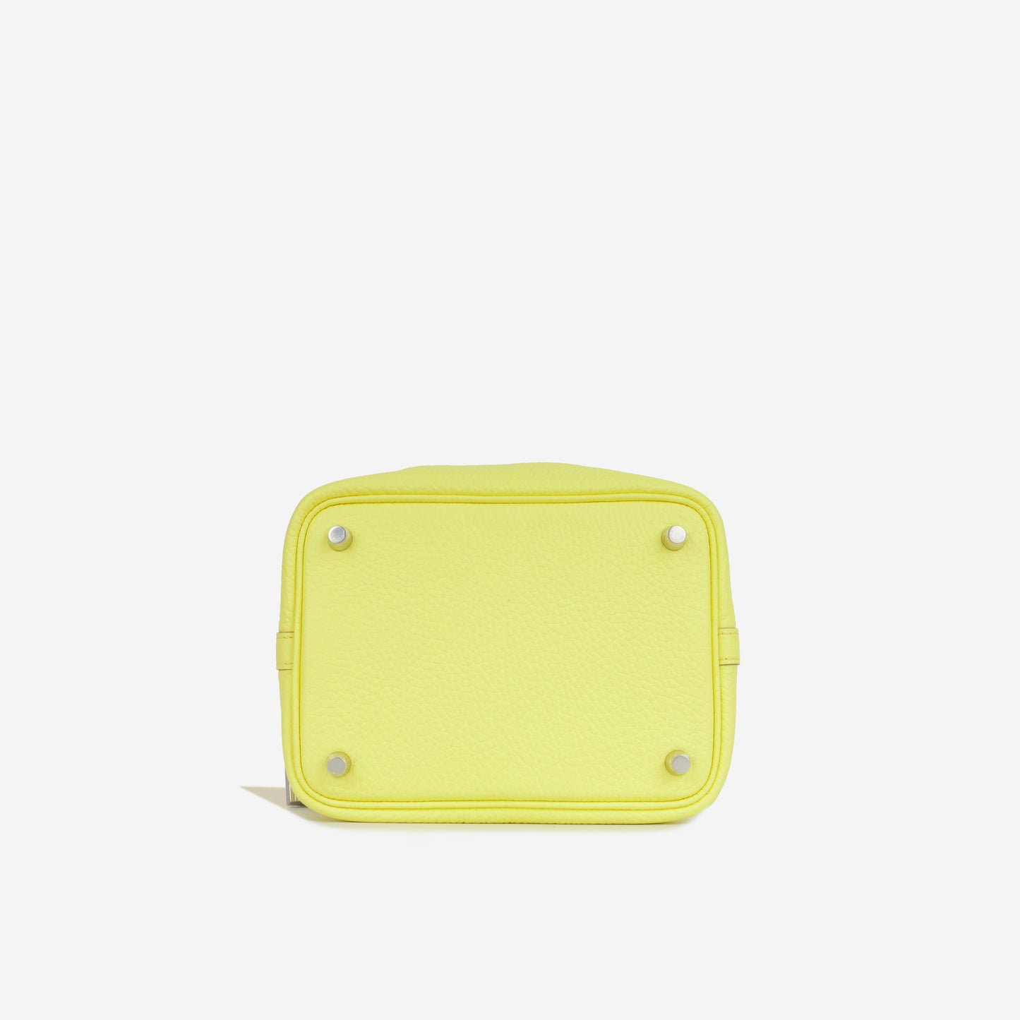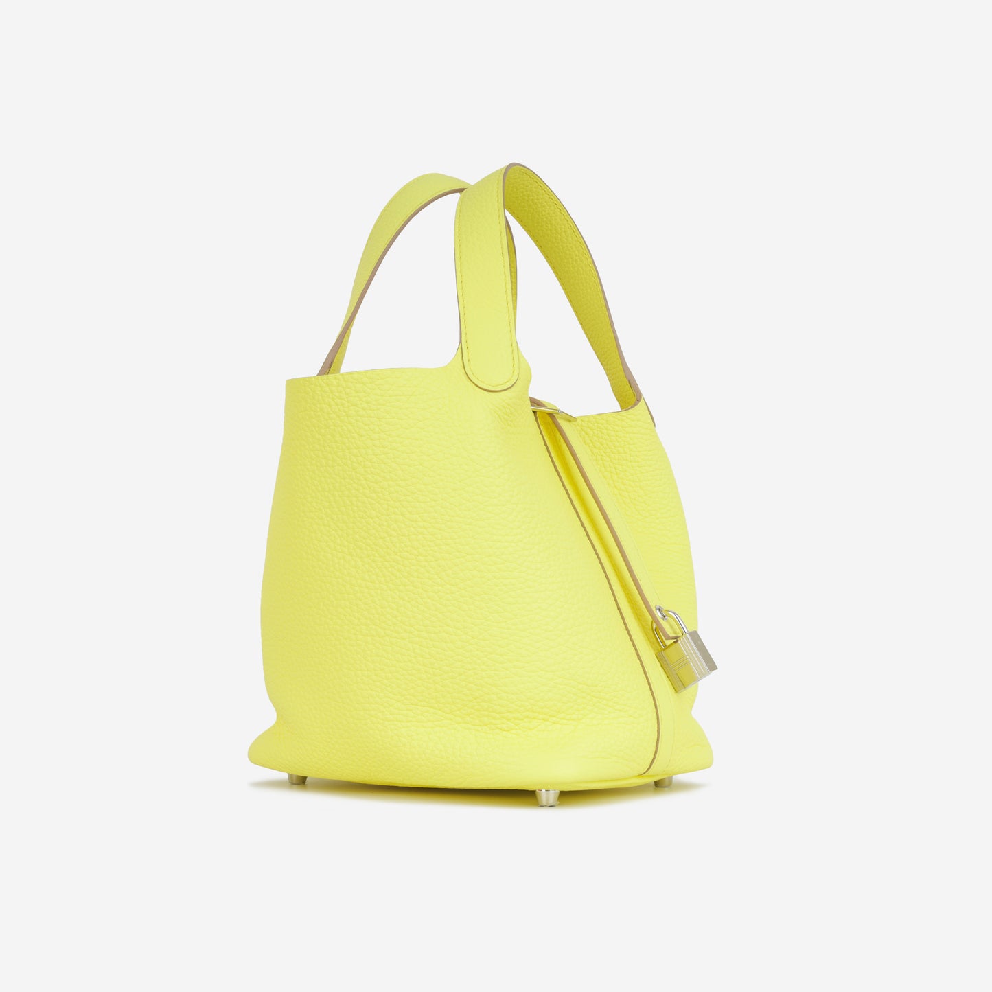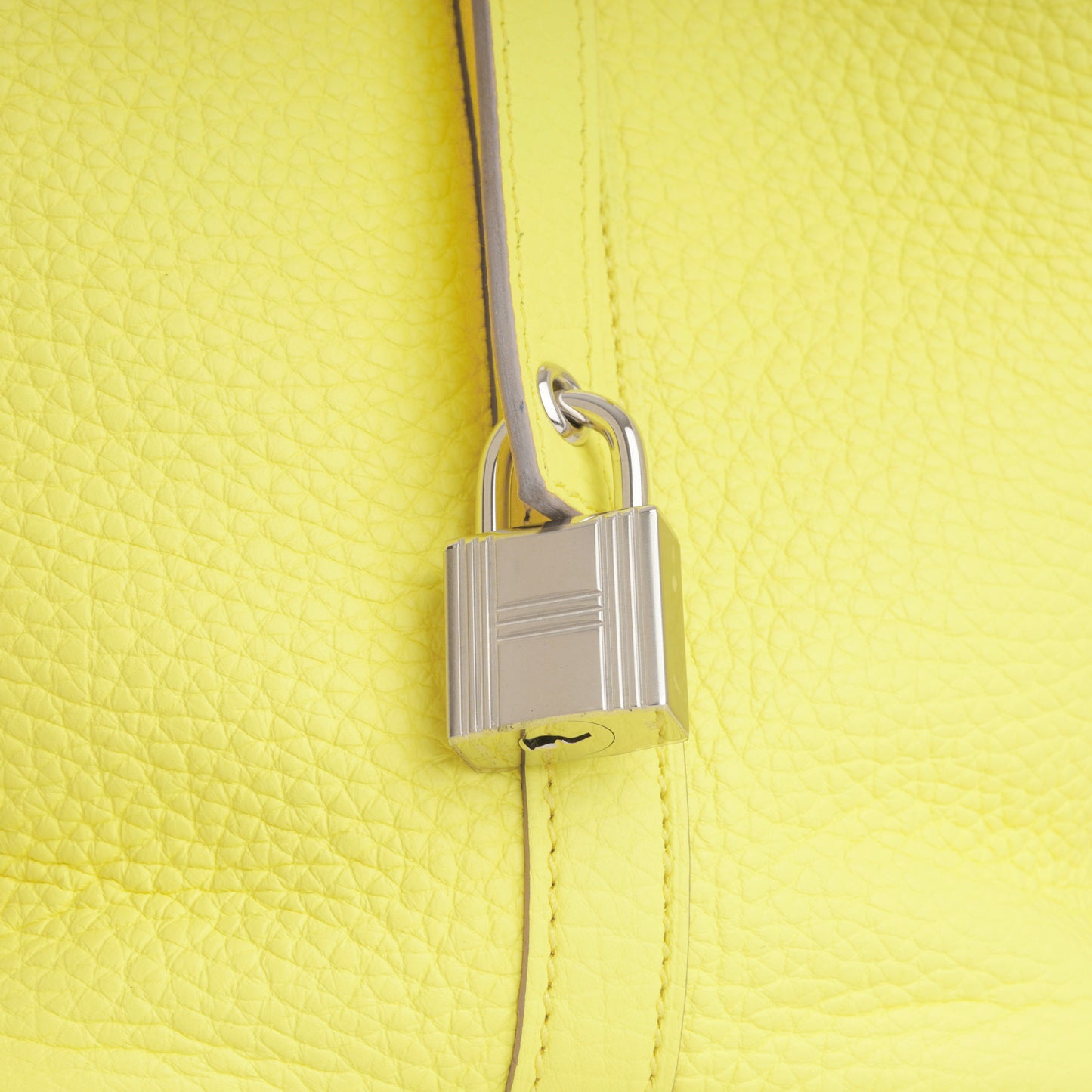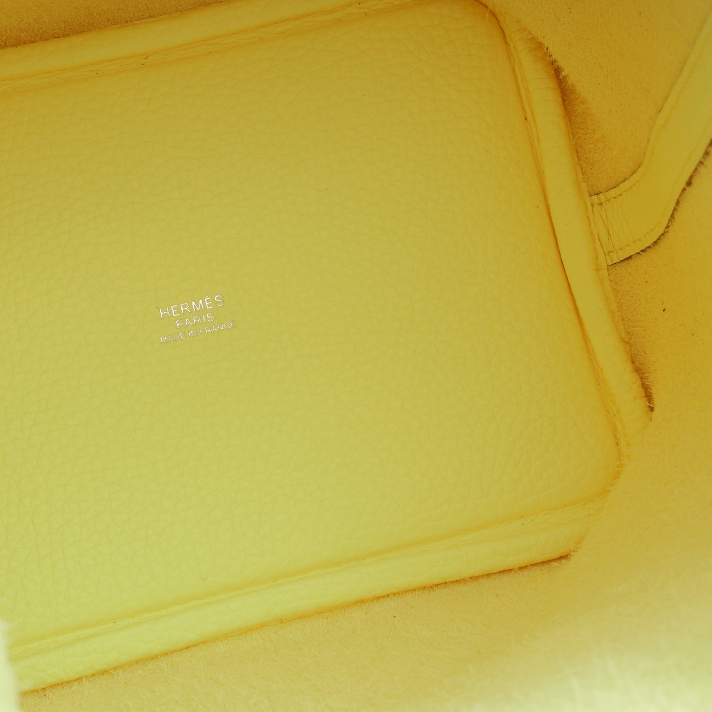 Carefully crafted from supple, Clemence leather, Hermès presents their stunning mini Picotin 18 bag in a beautiful combination of Limoncello and accented with palladium hardware. Hermès is acclaimed for their leather quality, as well as being at the very top of the fashion hierarchy. Simple, elegant, and understated, each Hermès bag is timeless and tasteful.