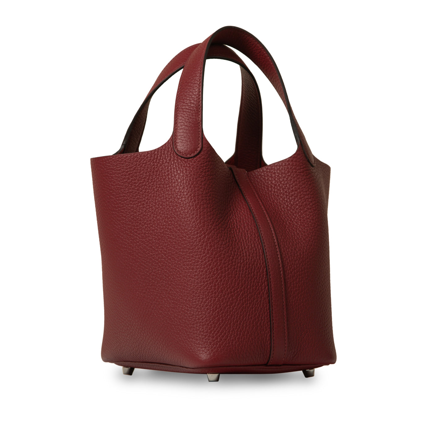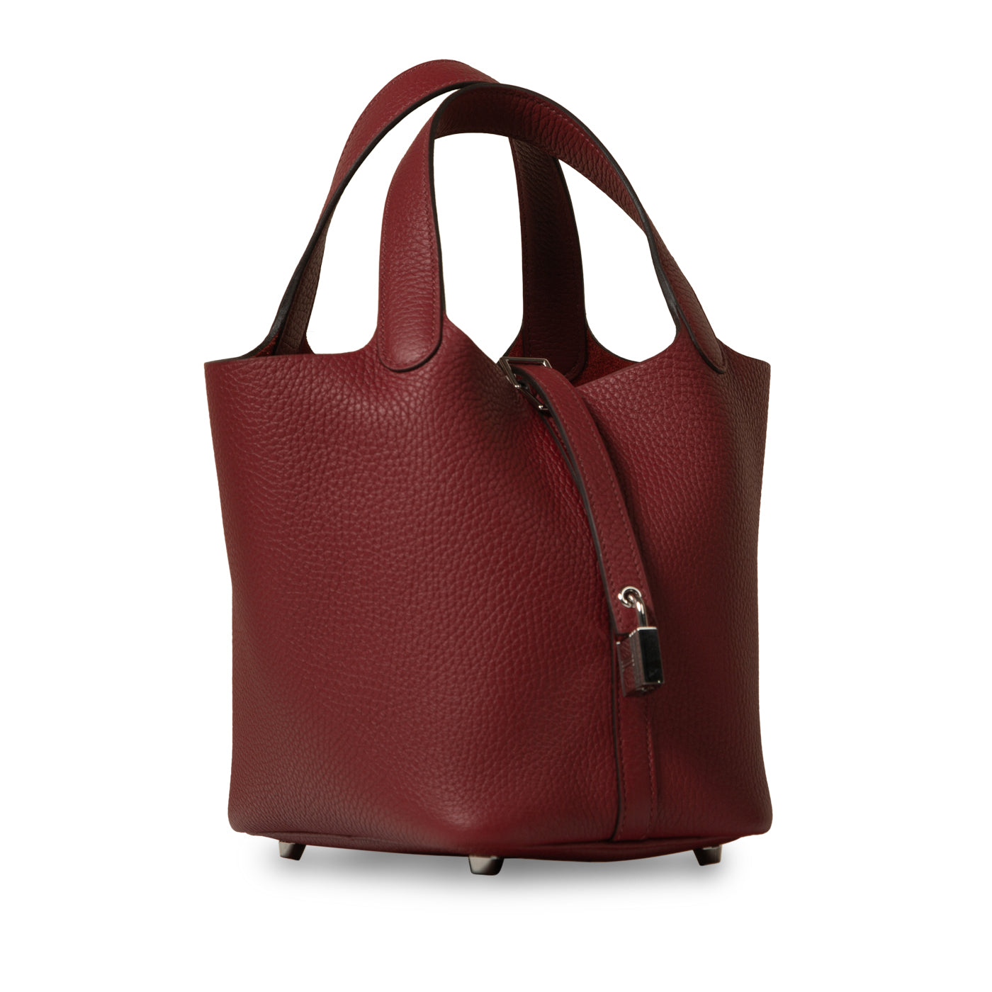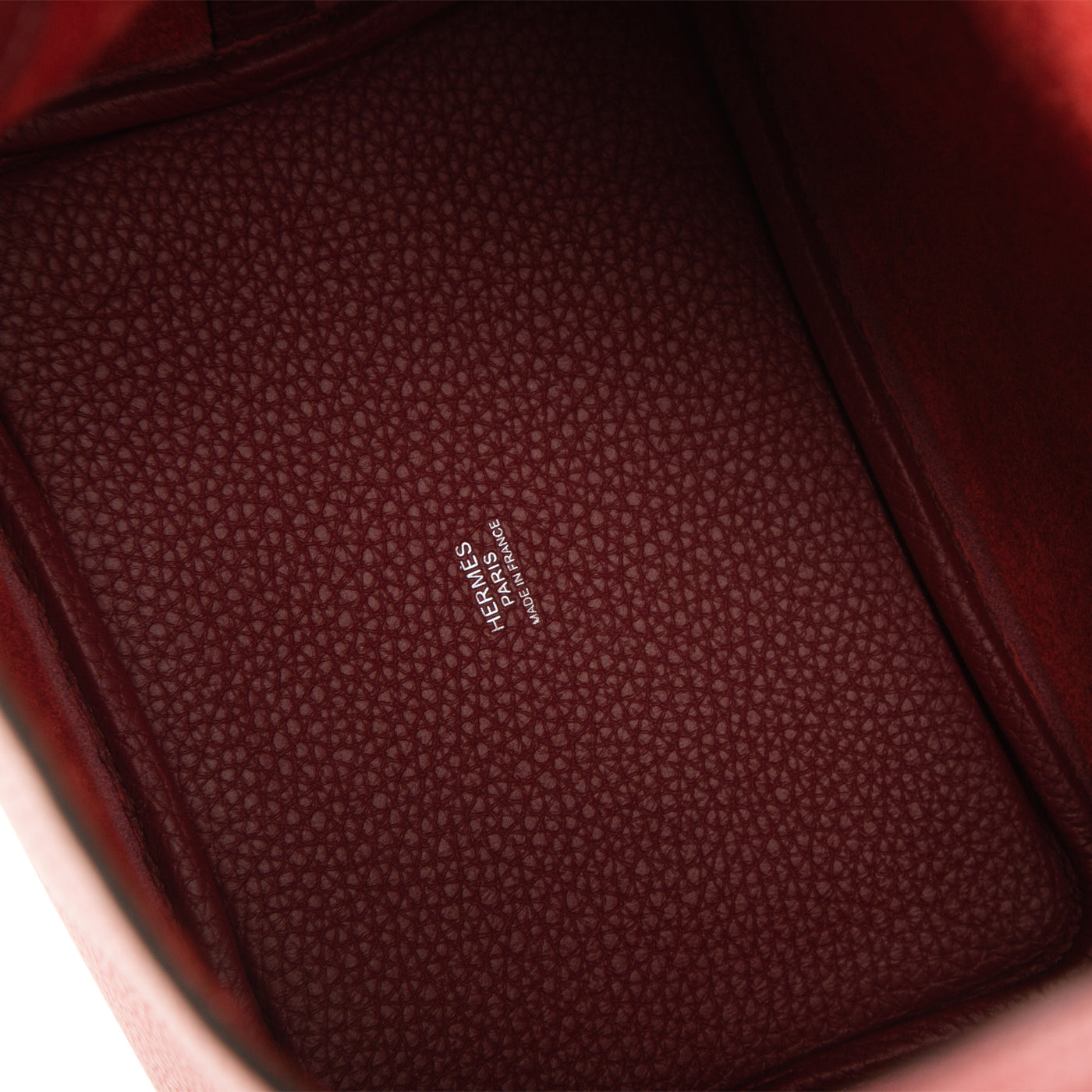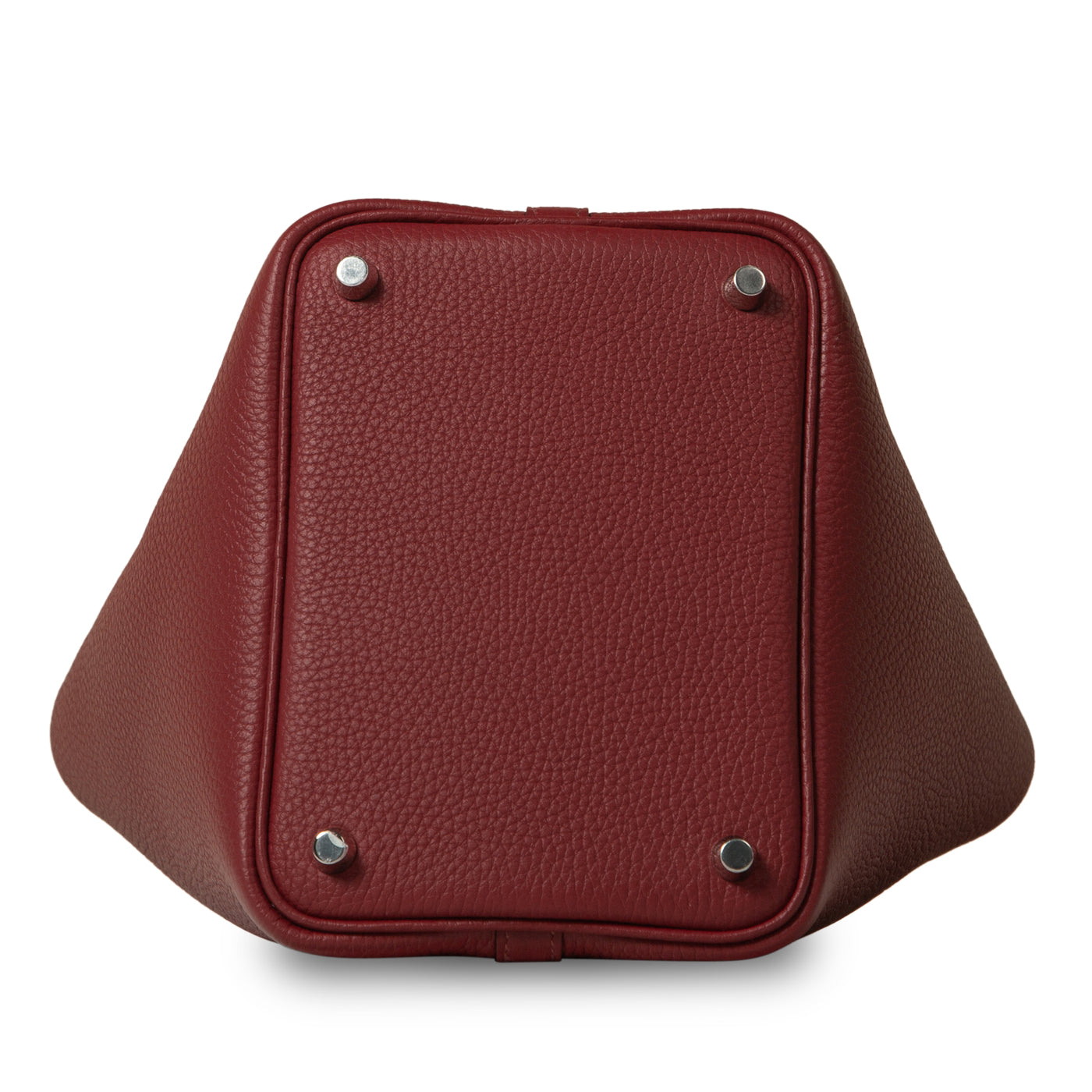 Carefully crafted from supple, textured leather, Hermès presents their stunning mini Picotin 18 bag in a beautiful combination of Rouge Grenat Clemence leather and Palladium hardware. Hermès is acclaimed for their leather quality, as well as being at the very top of the fashion hierarchy. Simple, elegant, and understated, each Hermès bag is timeless and tasteful. This bag is no exception. Carry all your everyday essentials in style while remaining sleek and sophisticated. The Picotin lock exudes Hermès classic "if you know, you know" aesthetic. A well-worthy addition to any luxury handbag collection and a true investment piece for any person with a simple style and a special spot for Hermès.