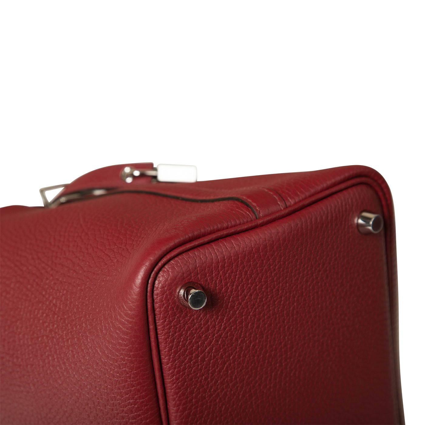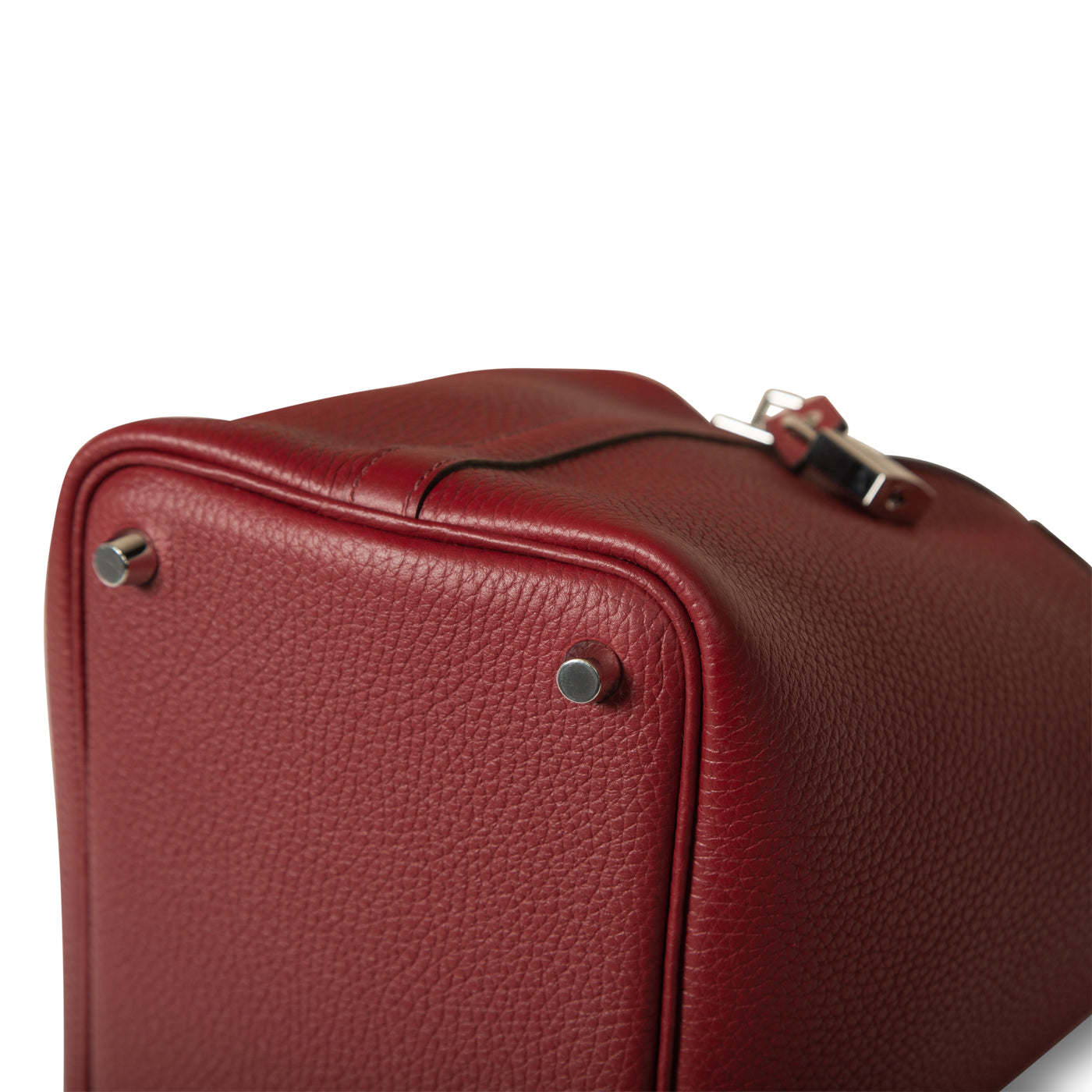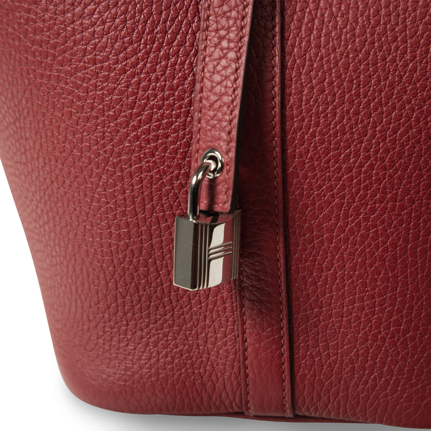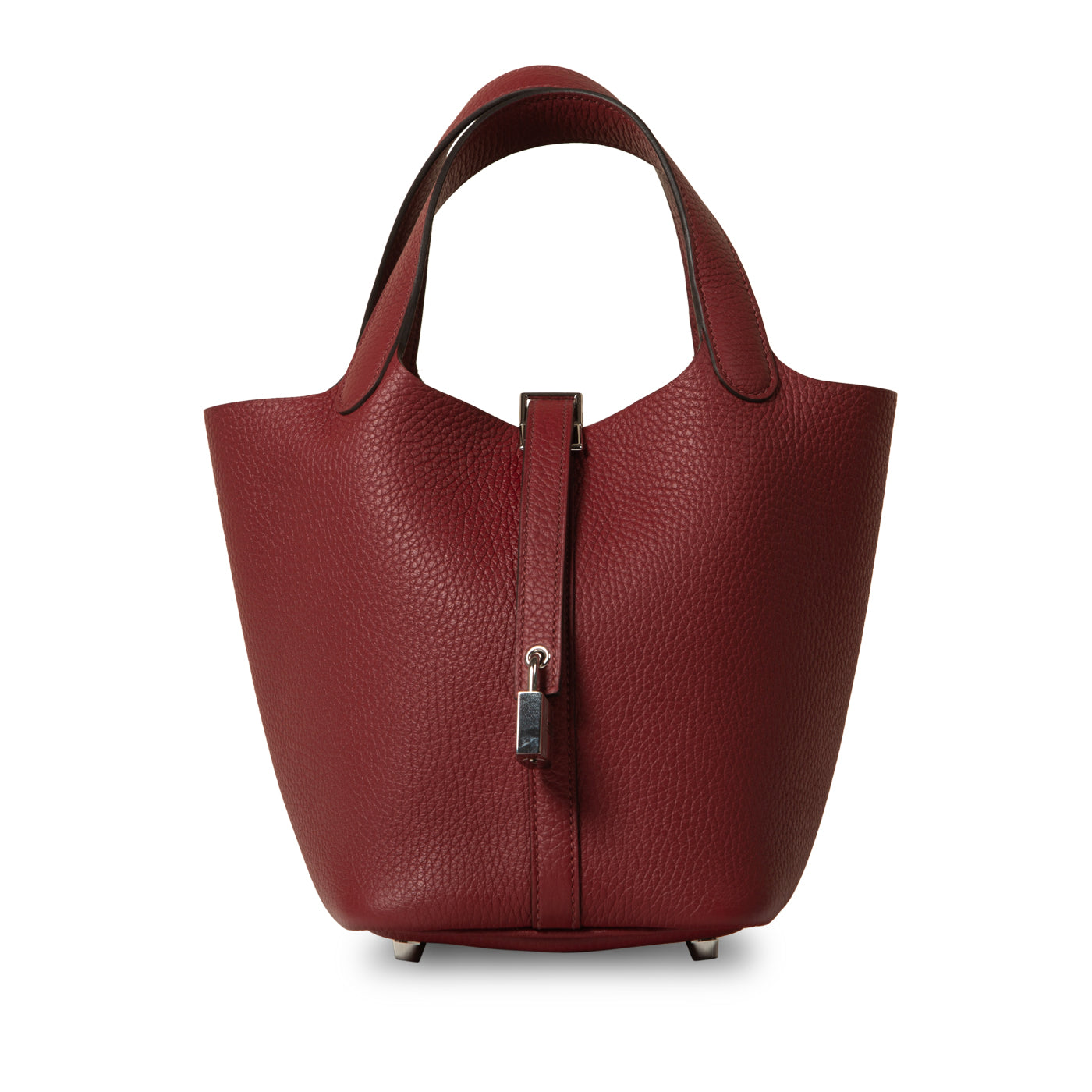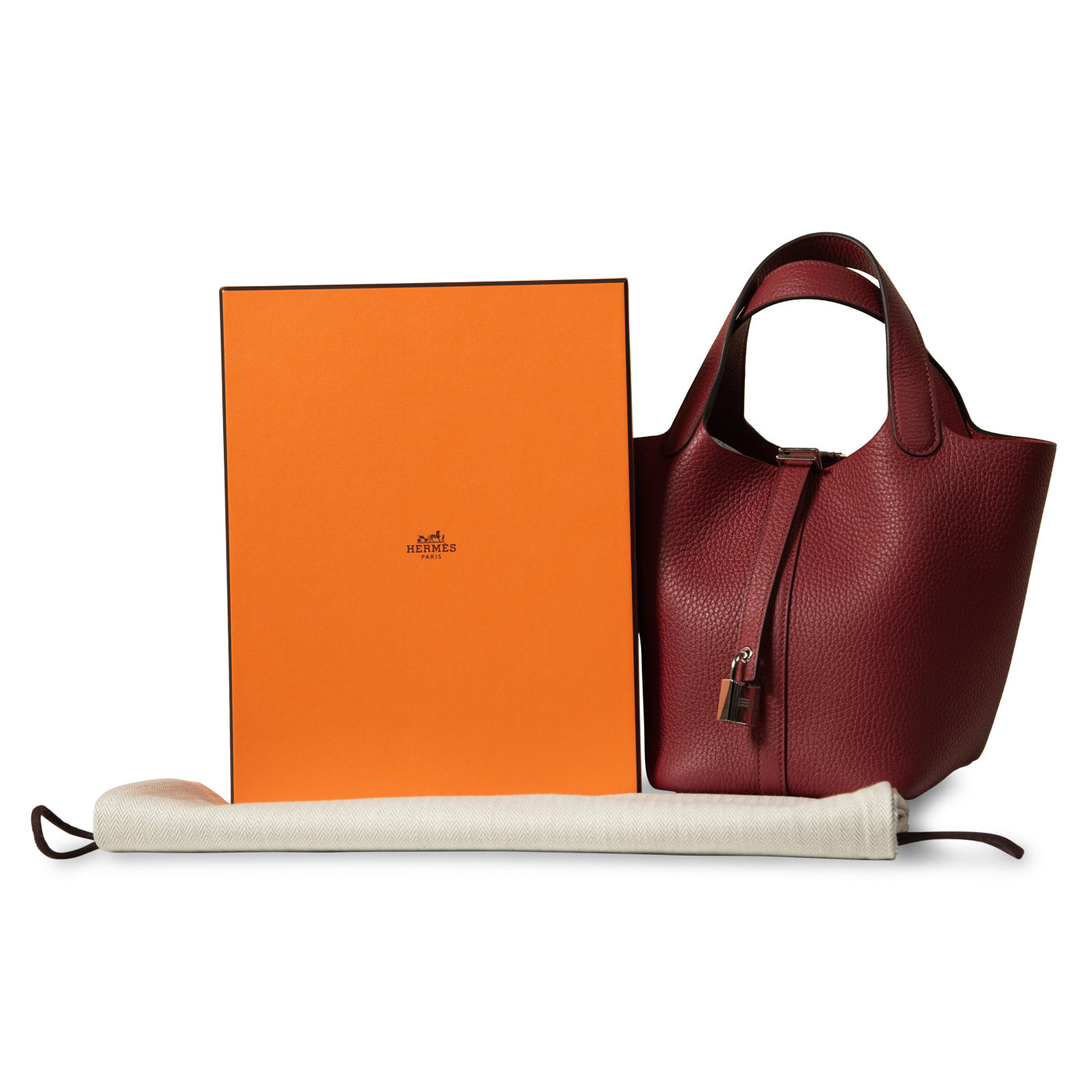 Carefully crafted from supple, textured leather, Hermès presents their stunning mini Picotin 18 bag in a beautiful combination of Rouge Grenat Clemence leather and Palladium hardware. Hermès is acclaimed for their leather quality, as well as being at the very top of the fashion hierarchy. Simple, elegant, and understated, each Hermès bag is timeless and tasteful. This bag is no exception. Carry all your everyday essentials in style while remaining sleek and sophisticated. The Picotin lock exudes Hermès classic "if you know, you know" aesthetic. A well-worthy addition to any luxury handbag collection and a true investment piece for any person with a simple style and a special spot for Hermès.