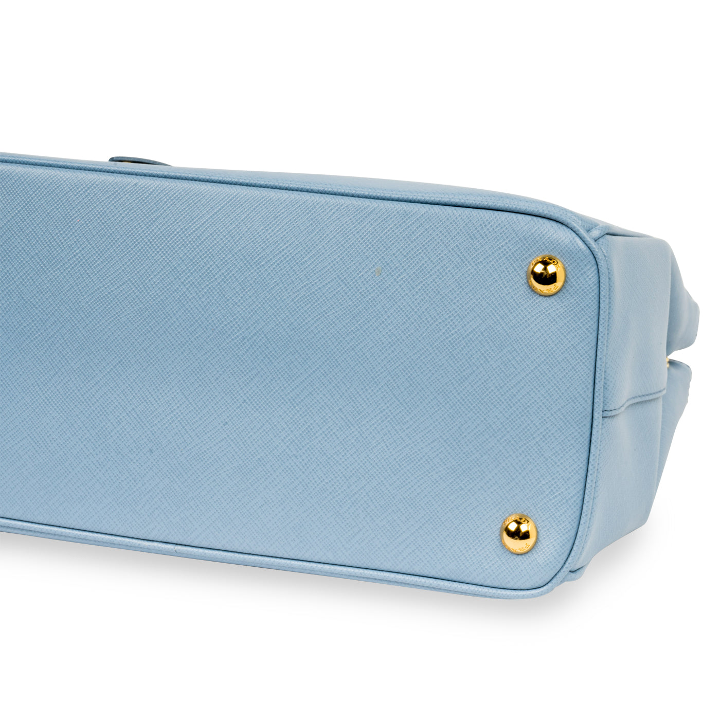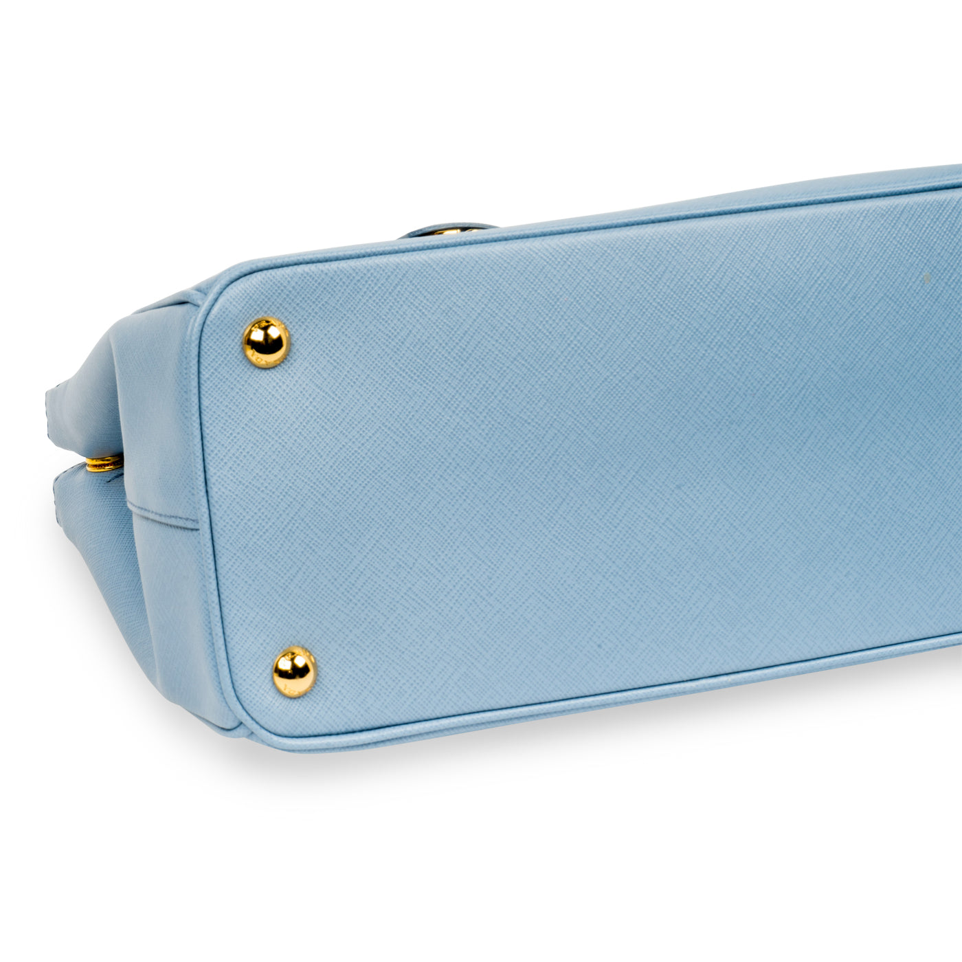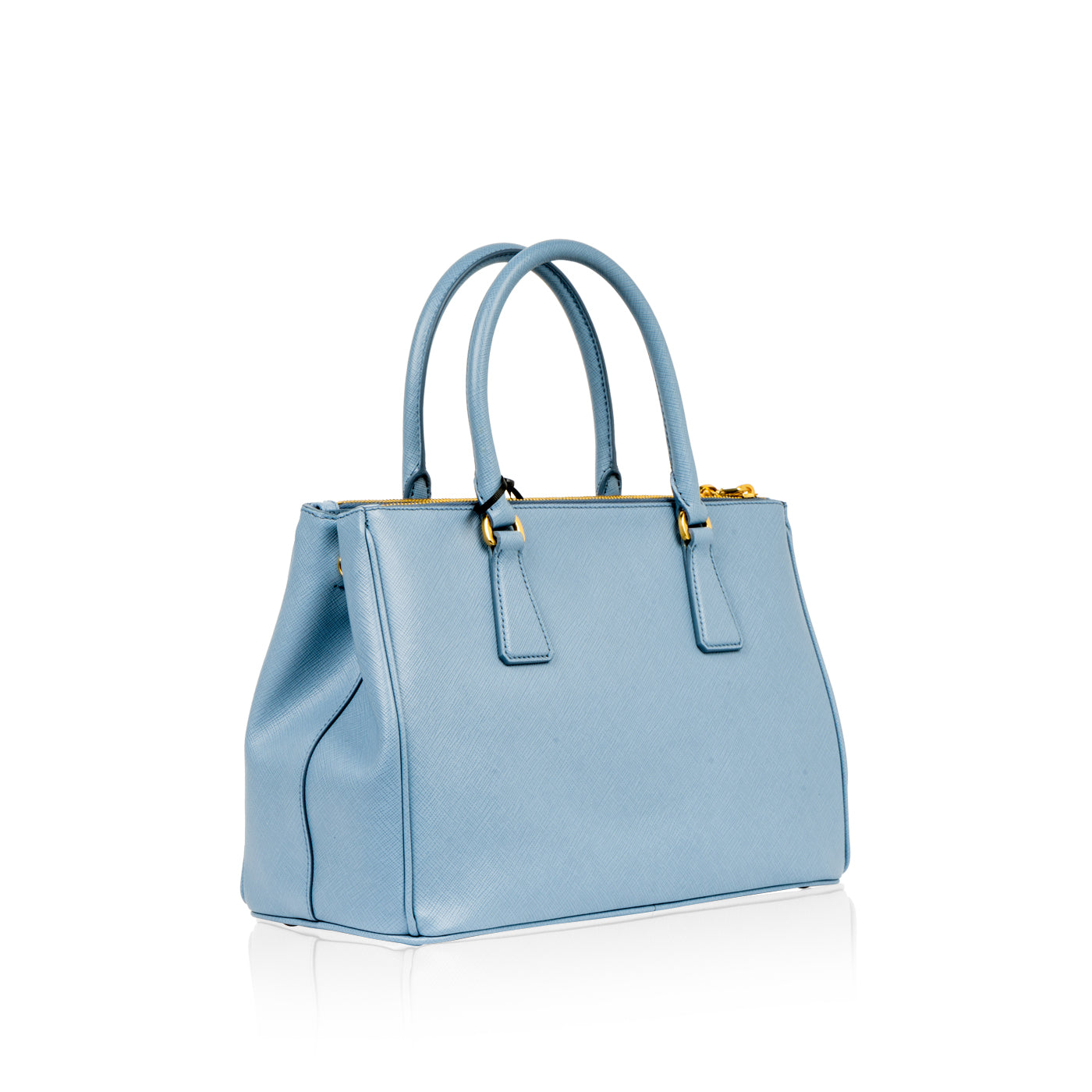 The Prada Galleria bag is modern and sleek in its design, showcasing Italian glamour. Although versatile and understated enough for everyday wear, it is a stunning and unique design with textured Saffiano leather, structured leather straps and gorgeous gold tone trims. The baby blue colour way is the perfect addition to your spring/summer wardrobe. Wear on the shoulder with the detachable strap for daytime or carry but the structured leather handles for the evening; this bag suits any occasion.