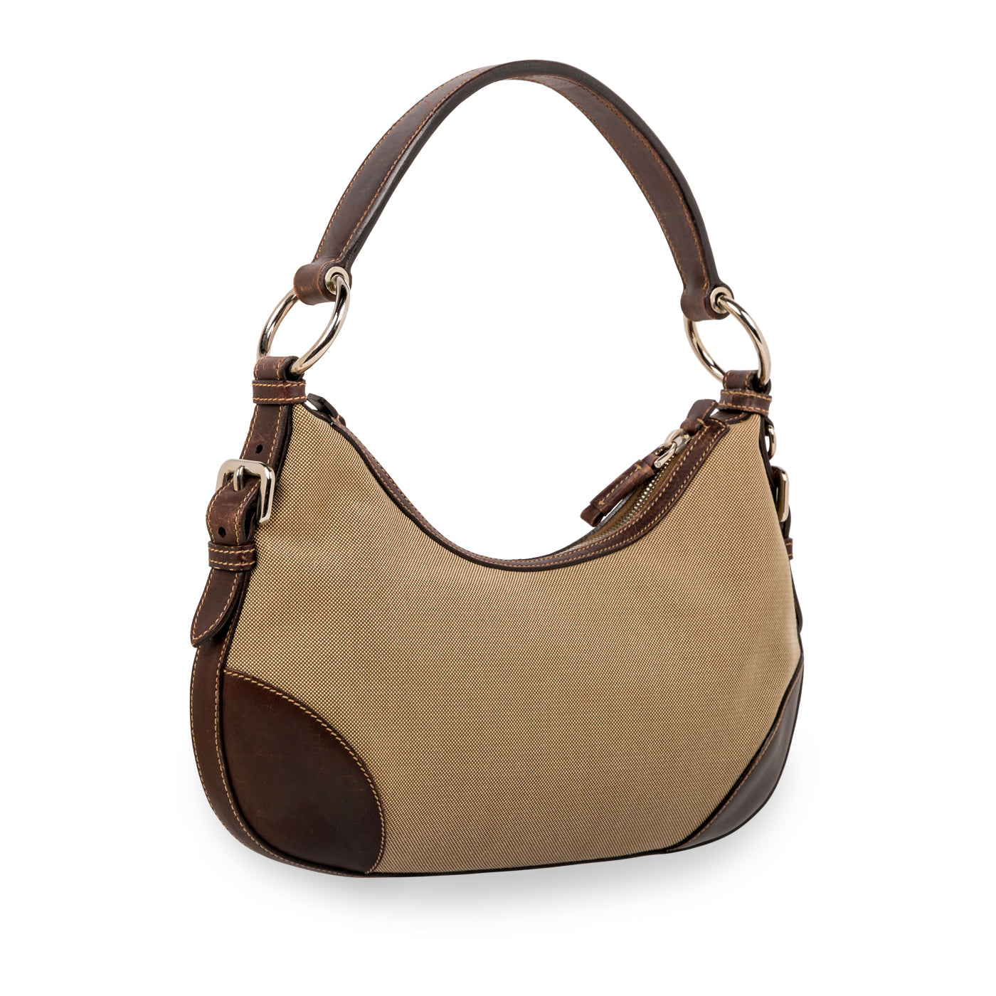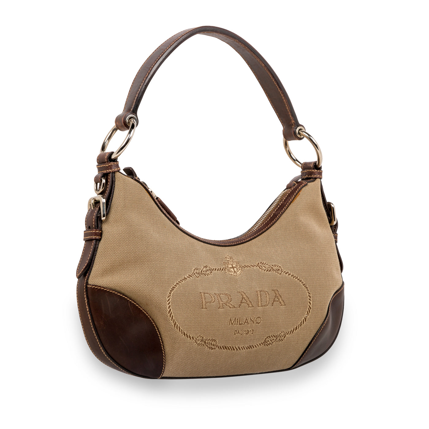 The Prada Canvas Tessuto bag is a small, classic hobo shoulder bag, perfect for everyday use. Adorned with the iconic logo print featured on the base of the bag and contrasting dark brown leather features, the tessuto hobo is perfect for daytime casual use – a great bag to grab on the go. With the classic neutral brown tones in both canvas and leather, Prada have crafted a perfect functional bag for casual daytime use.