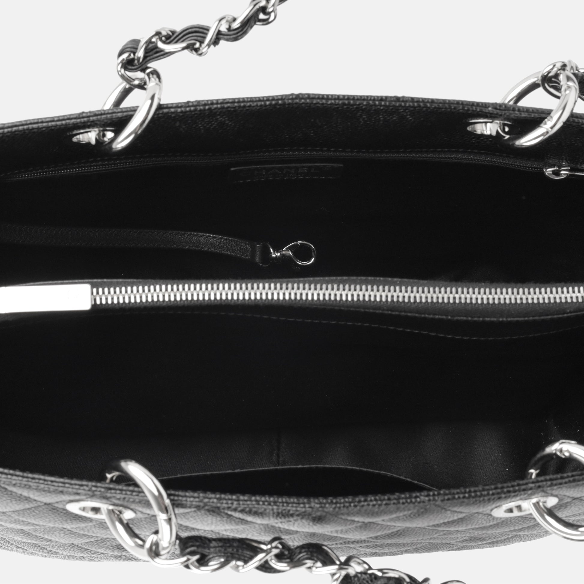 Chanel presents one of its most exclusive and coveted handbags; the Grand Shopping Tote. The bag is presented in durable caviar leather and features the brand’s iconic quilted pattern alongside a large CC stitched logo. Its spacious interior features two open compartments separated by a middle zip pocket.