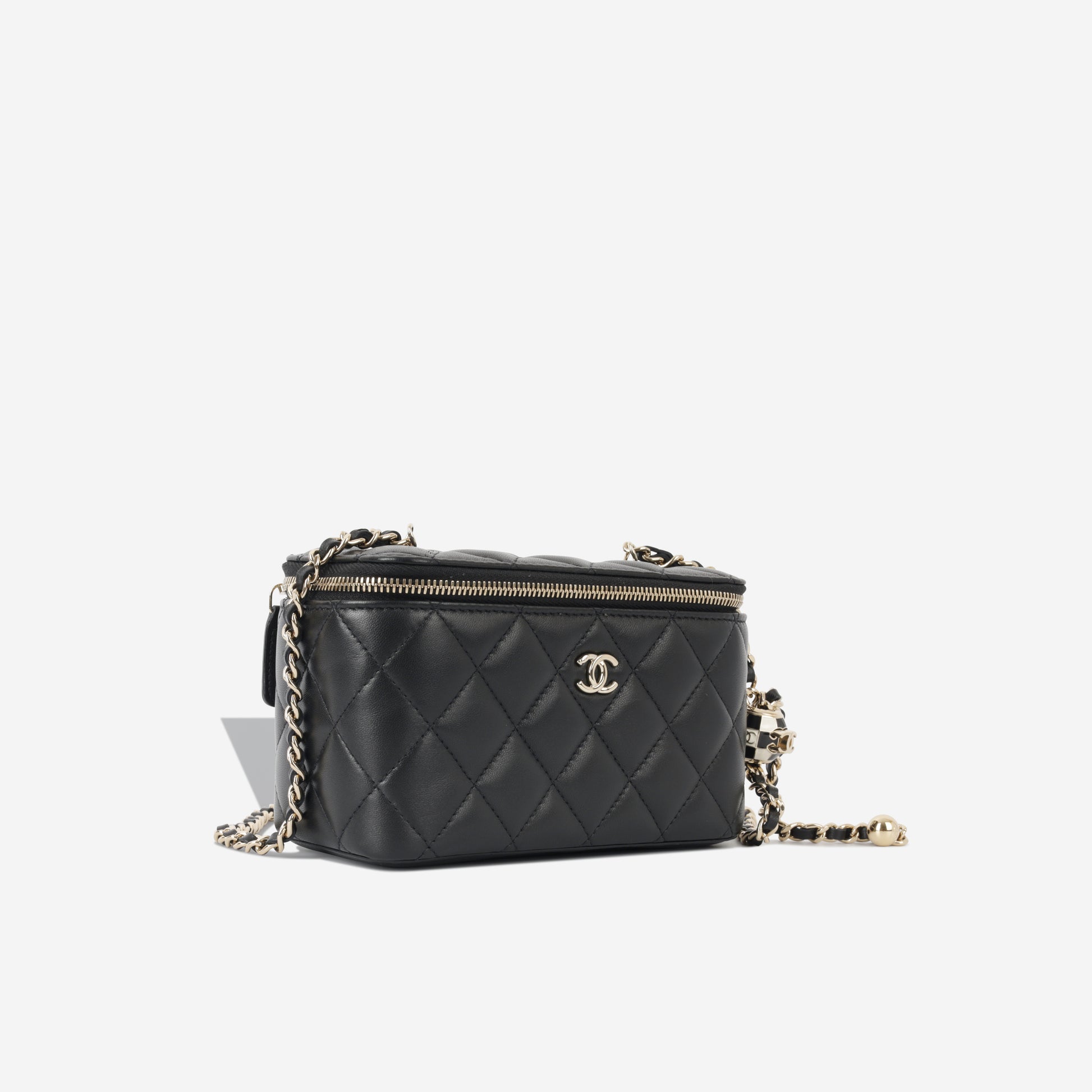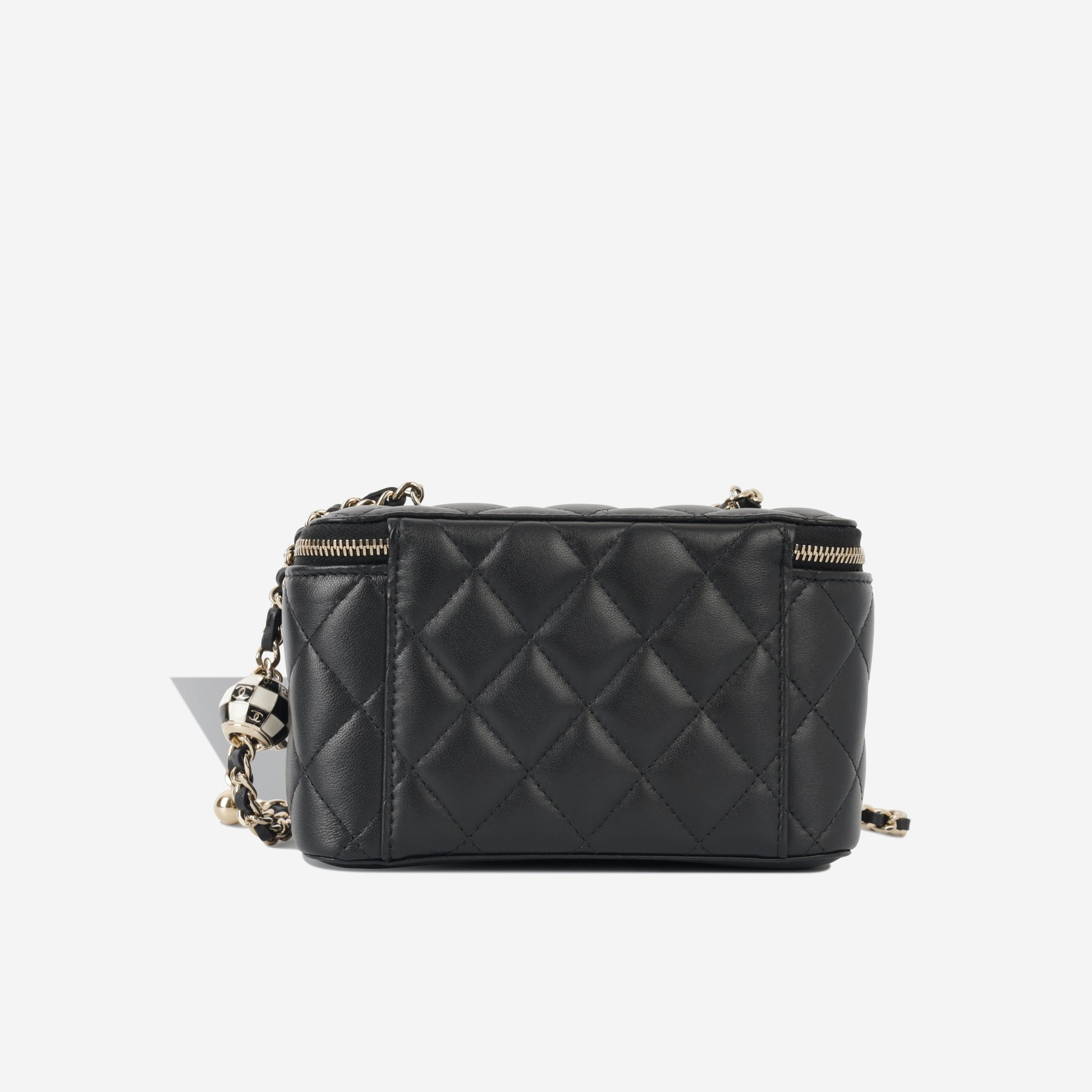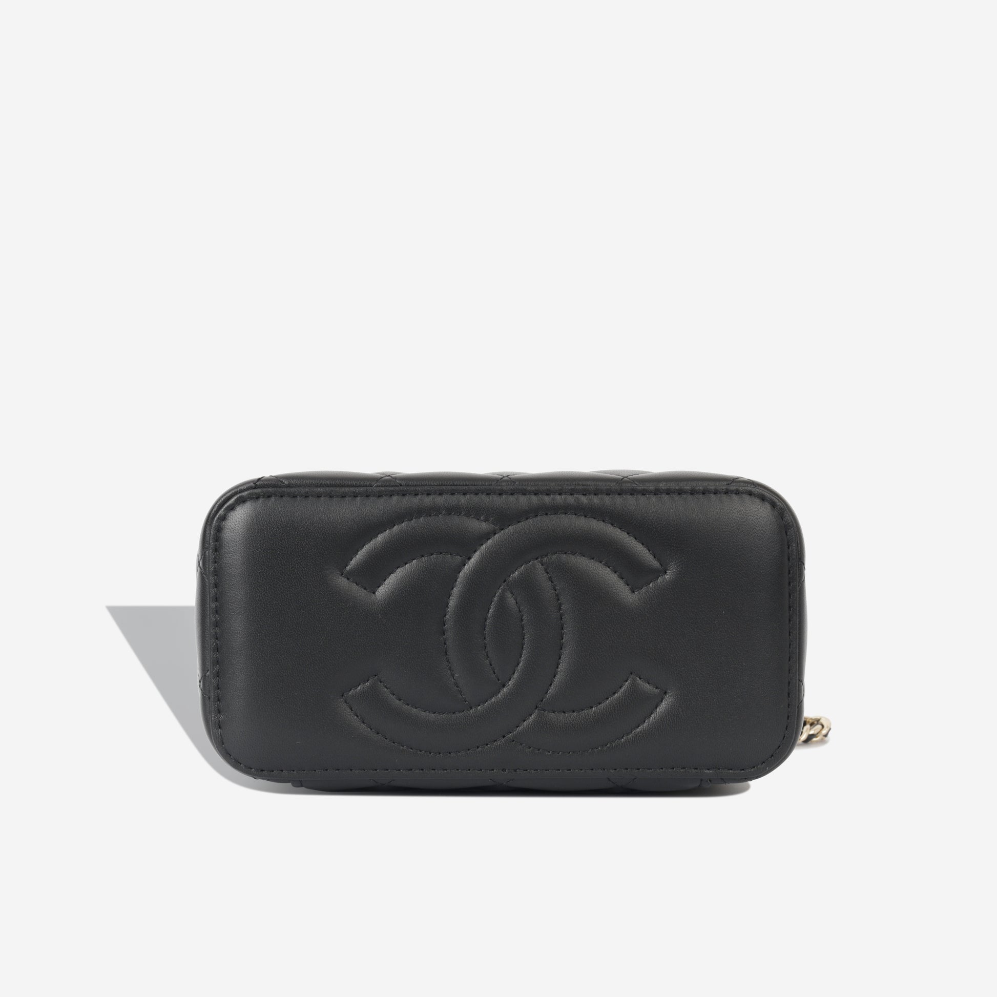 Primarily developed for storing your tiny beauty essentials and other small necessities, the vanity case has come a rather long way since its birth. With the “mini bag” remaining at the forefront of fashion accessory trends, this petite piece is the farthest thing from just a functional case. This beautiful modern vanity case is crafted in black lambskin leather and complimented with champagne gold toned hardware.