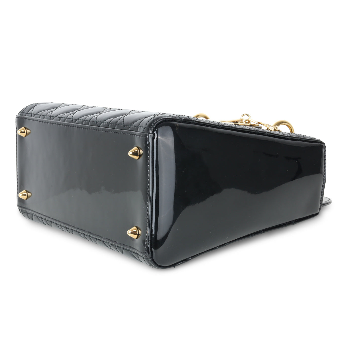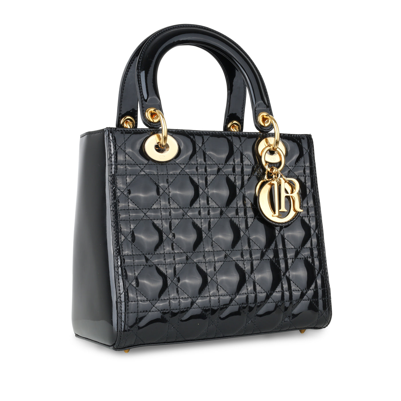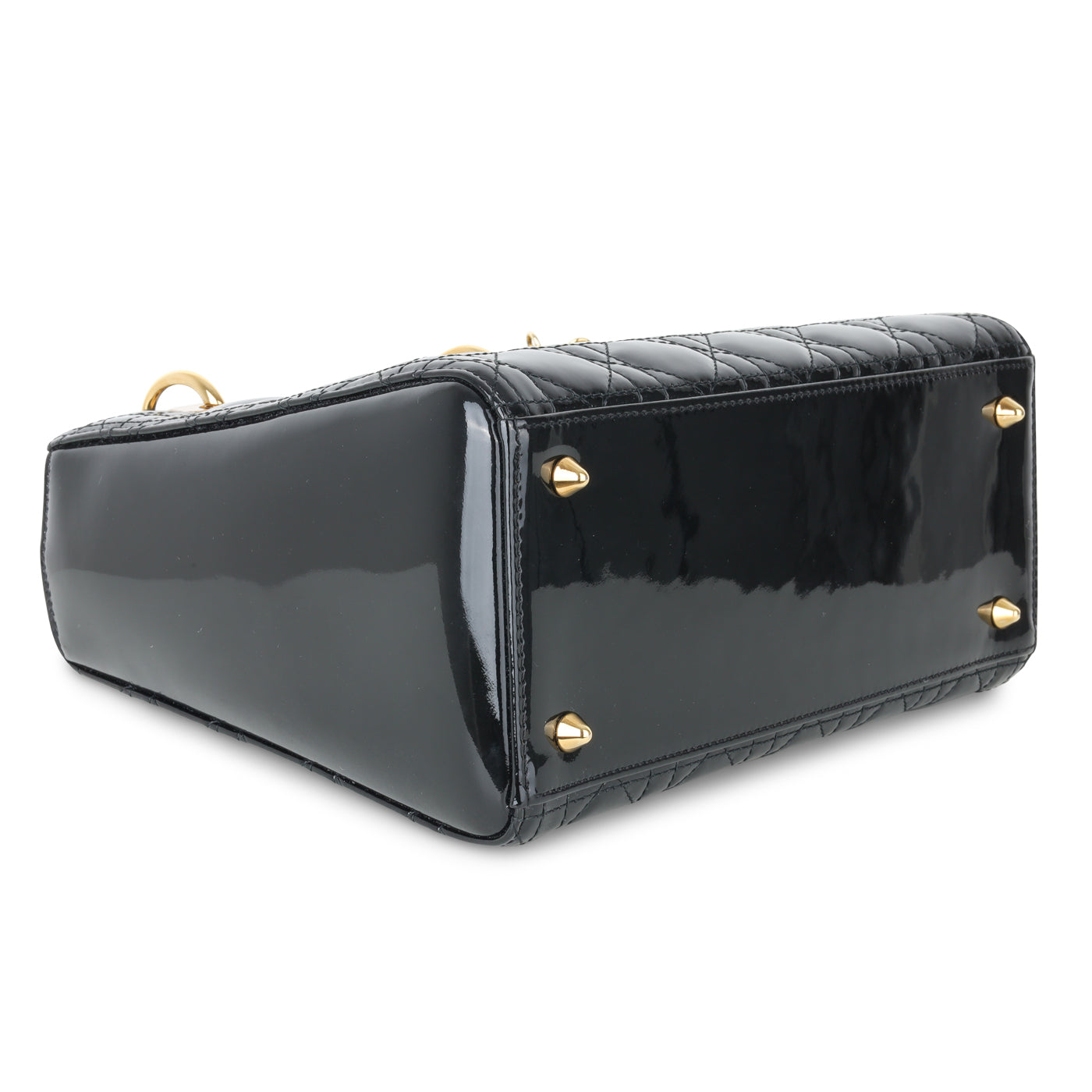 A timeless work of art, the "Lady Dior" bag has become the icon 'it-bag' within the entire Dior collection. Meticulously crafted by hand, this Medium-sized black patent leather bag is enhanced by signature Dior "Cannage" stitching.