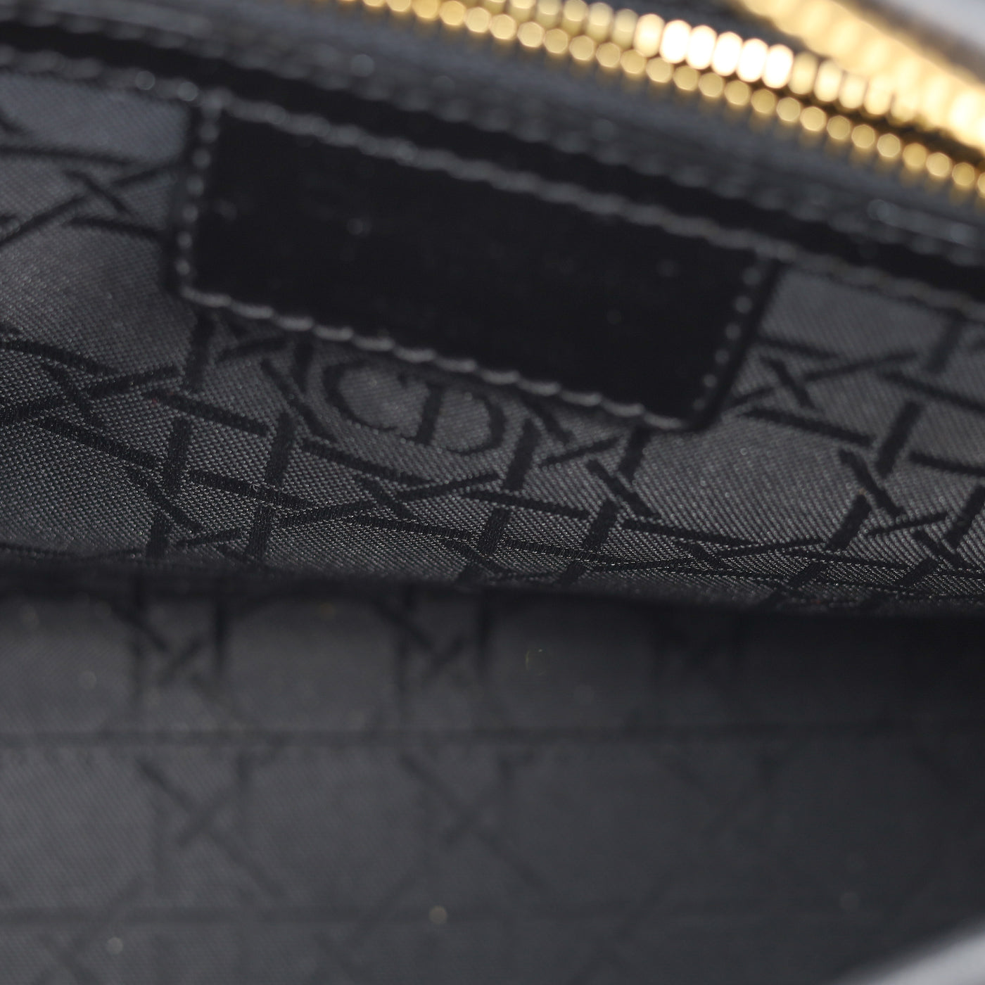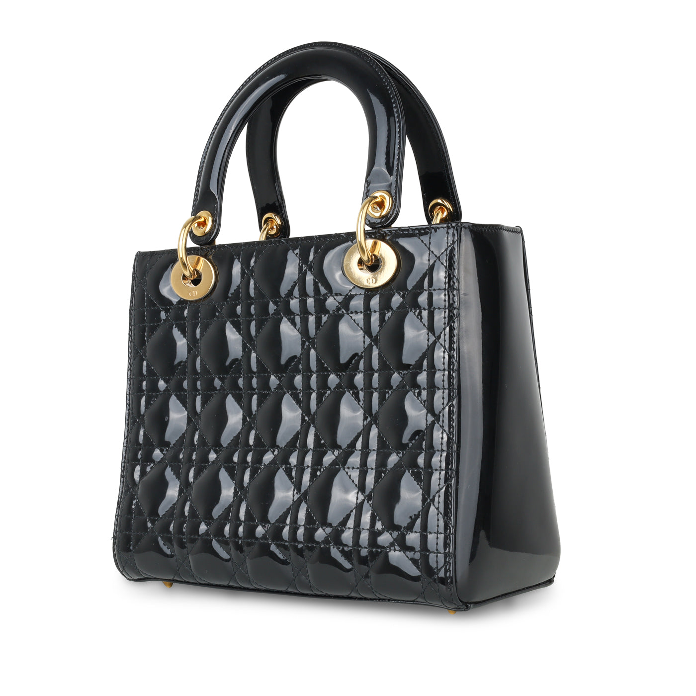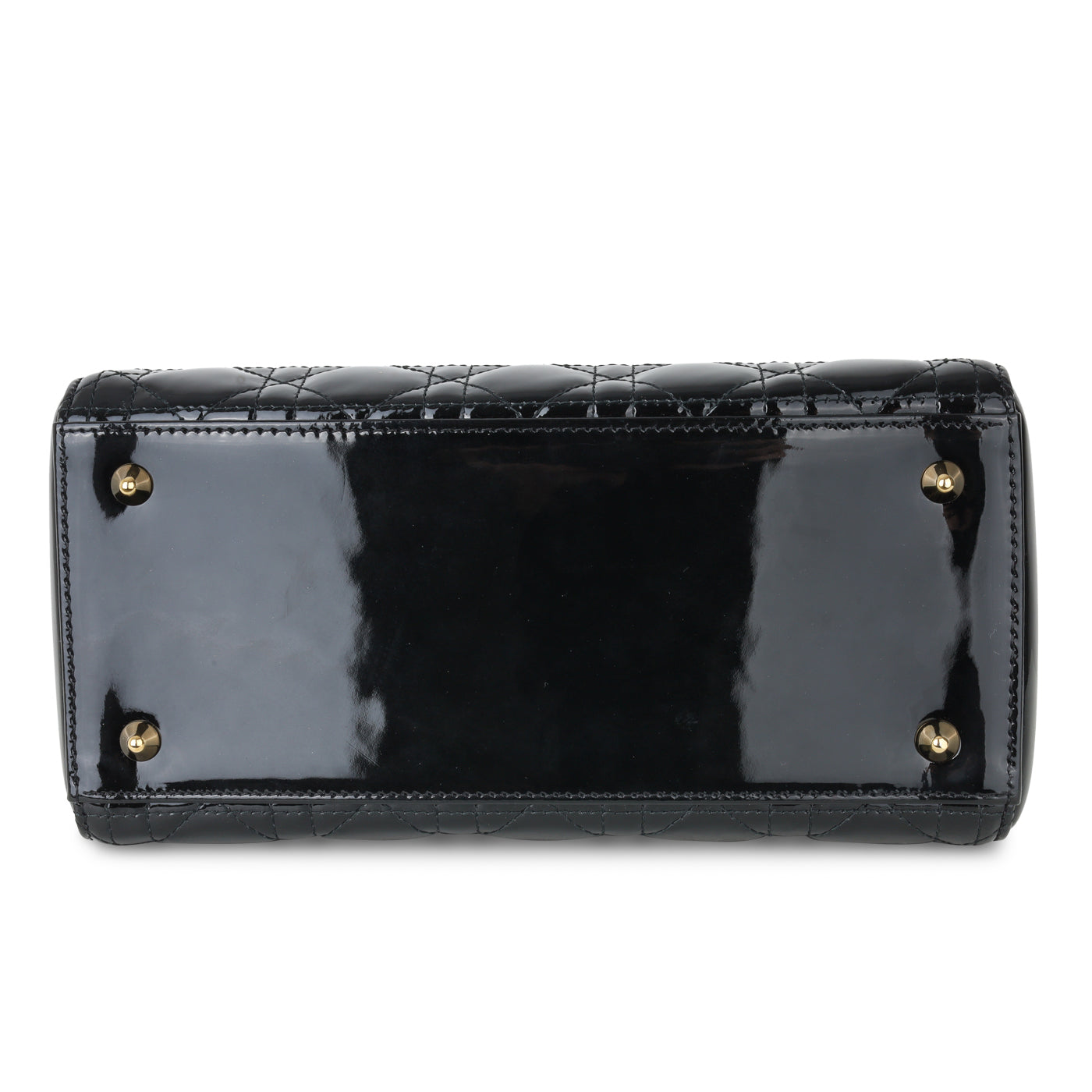 A timeless work of art, the "Lady Dior" bag has become the icon 'it-bag' within the entire Dior collection. Meticulously crafted by hand, this Medium-sized black patent leather bag is enhanced by signature Dior "Cannage" stitching.