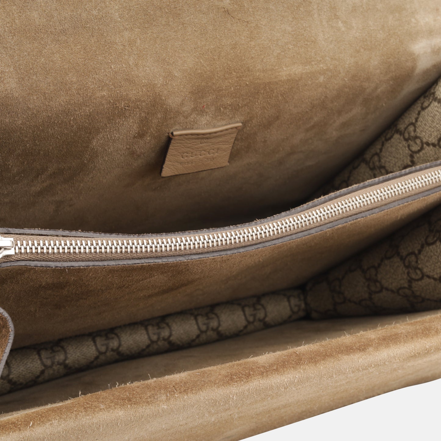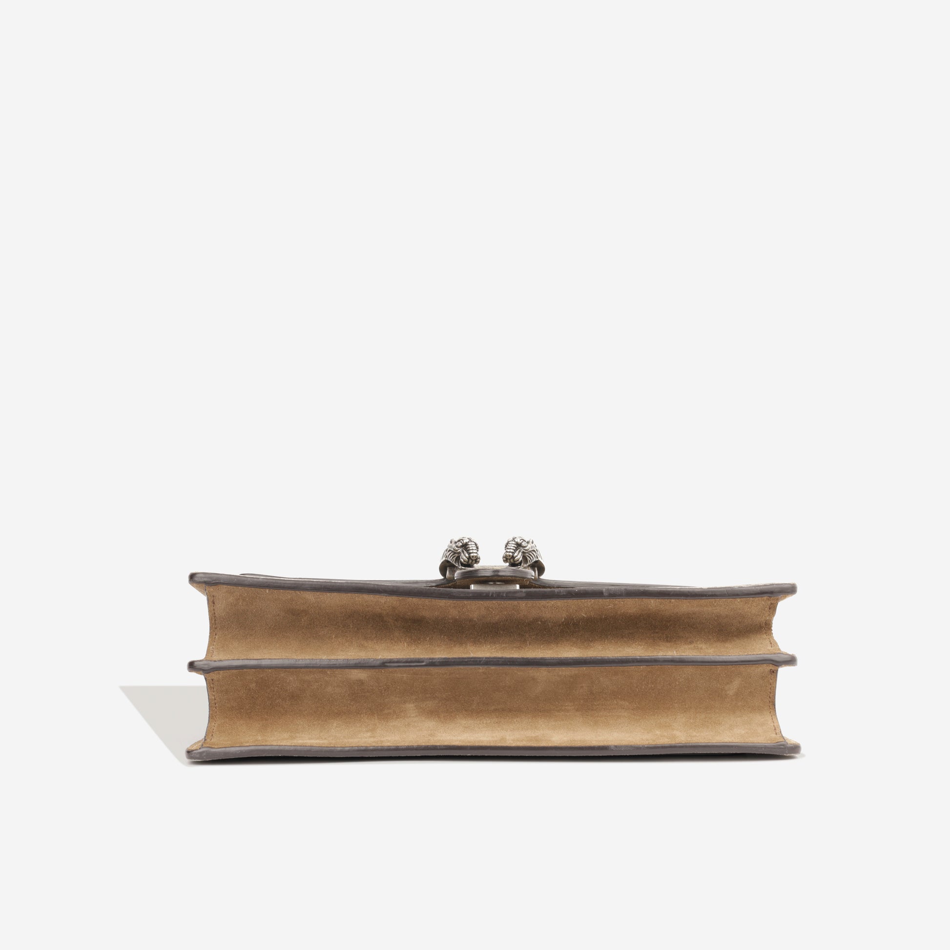 - Beige suede sides, base and second flap